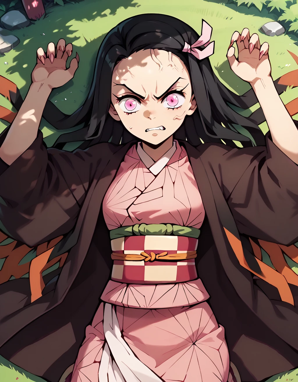 Demon: NezukoDem, kamado nezuko, 1girl, black hair, very long hair, angry, veins, sharp fingernails, pink eyes, 1girl, haori, black haori, pink kimono, hair ribbon, pink ribbon, checkered sash, obi,