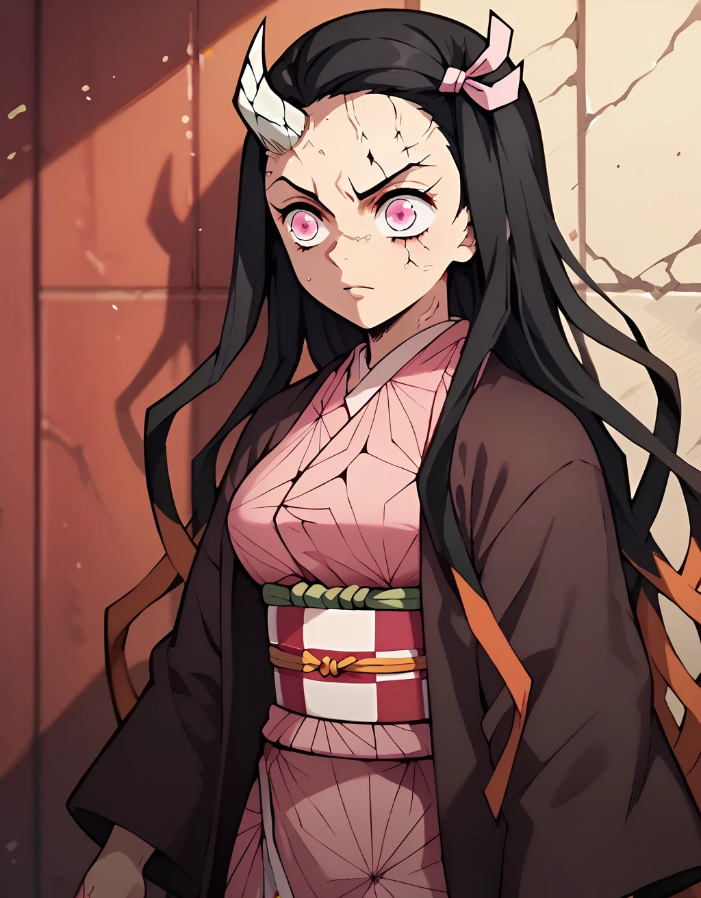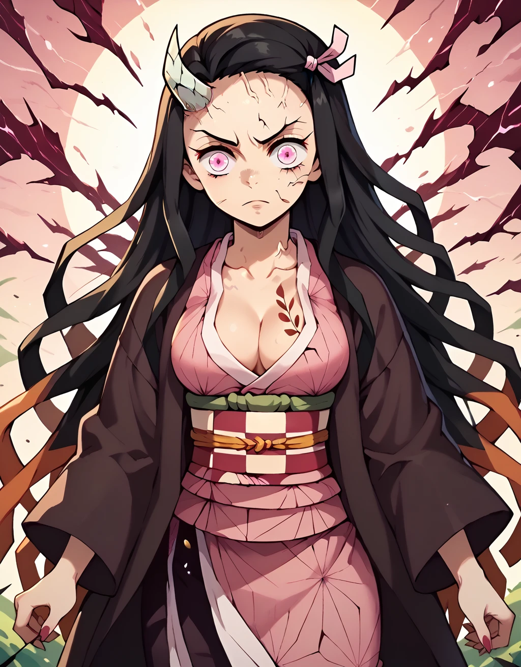 Outfit: NezukoAdult, kamado nezuko, medium breasts, adult, 1girl, very long hair, black hair, hair ribbon, horns, pink eyes, demon girl, single horn, veins, cracked skin, cleavage, black haori, obi, pink kimono, checkered sash,