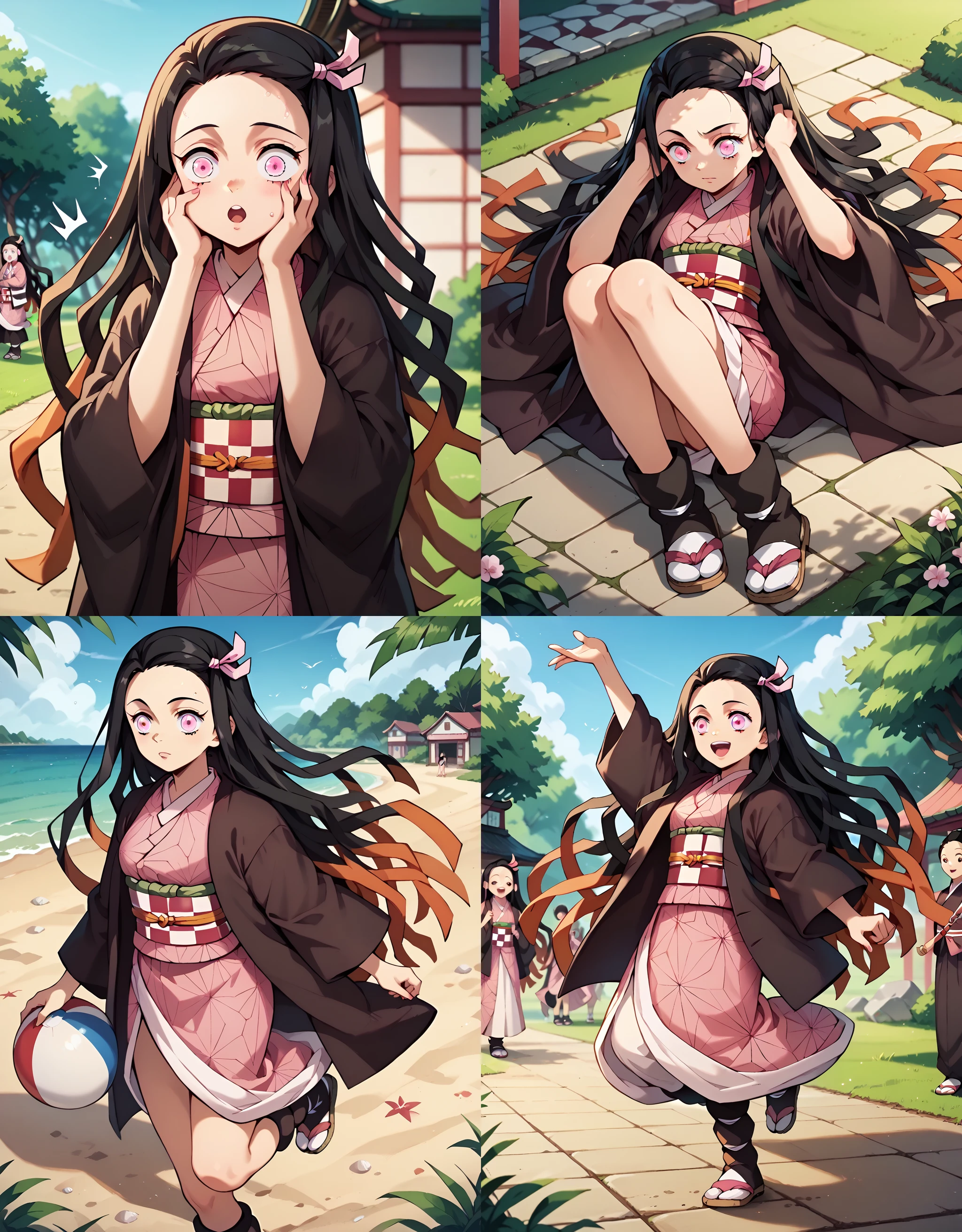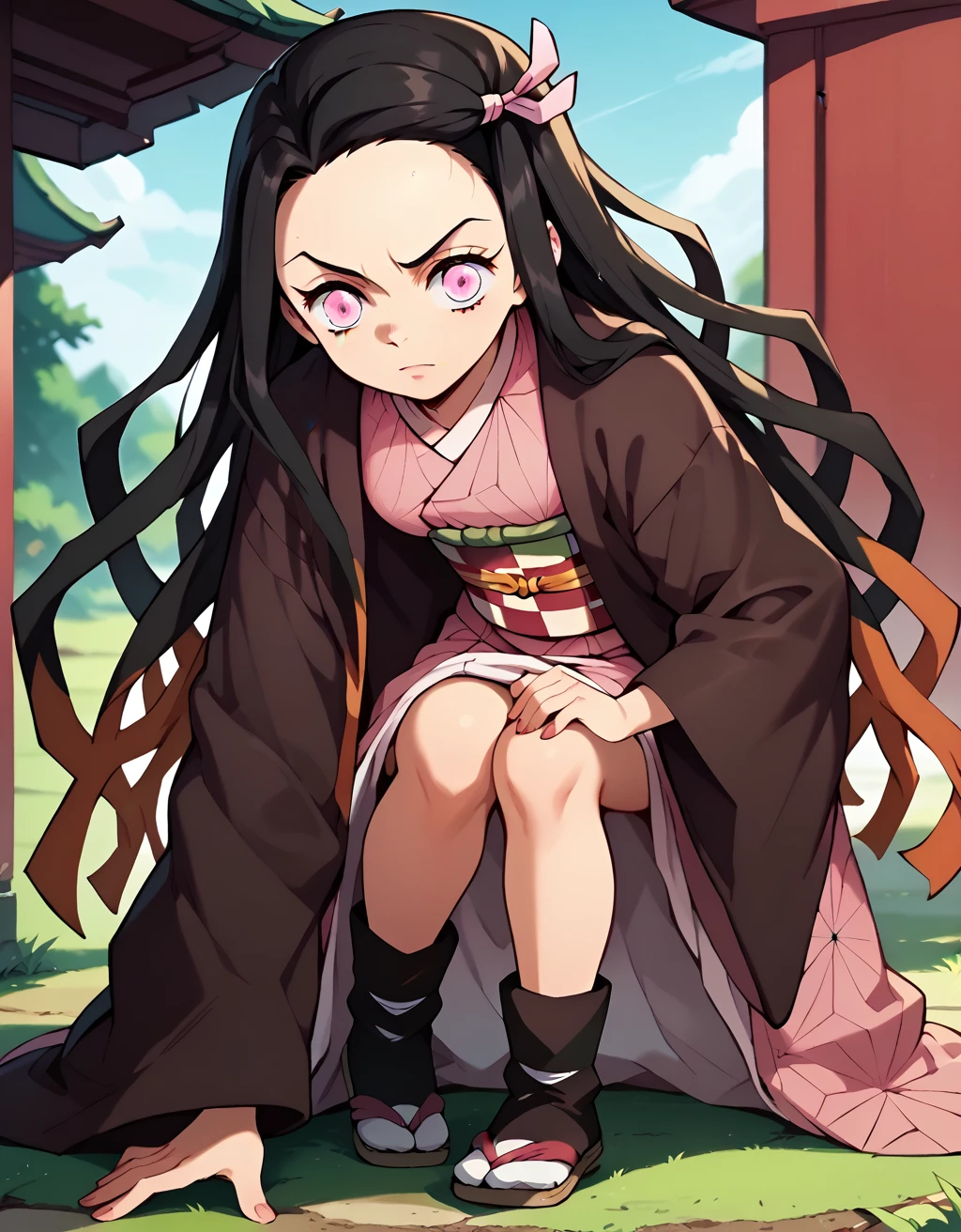 Outfit: NezukoNor, kamado nezuko, black hair, very long hair, pink eyes, 1girl, haori, black haori, pink kimono, hair ribbon, pink ribbon, checkered sash, obi,