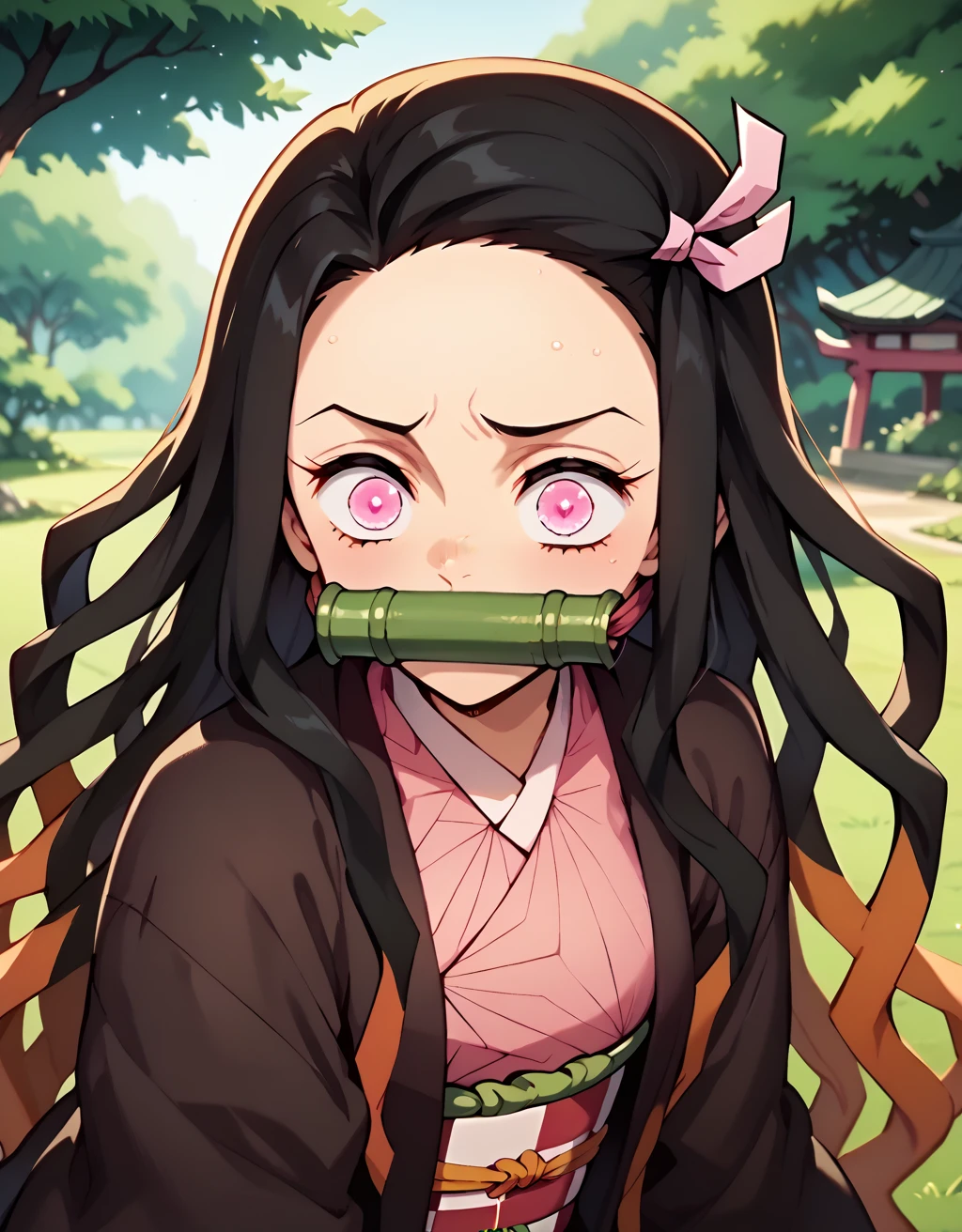 Character: NezukoNor, kamado nezuko, black hair, very long hair, pink eyes, 1girl,