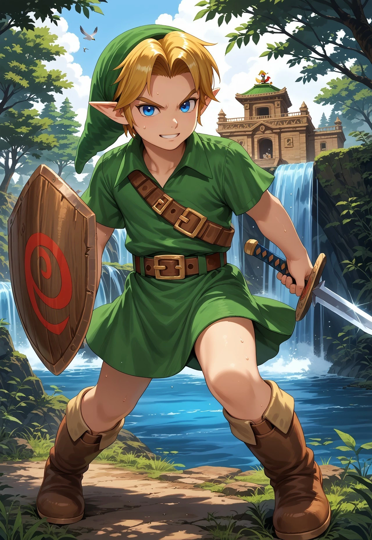 YLink, 1boy, solo, green hat, blonde hair, pointy ears, blue eyes, green tunic, brown belt, brown boots