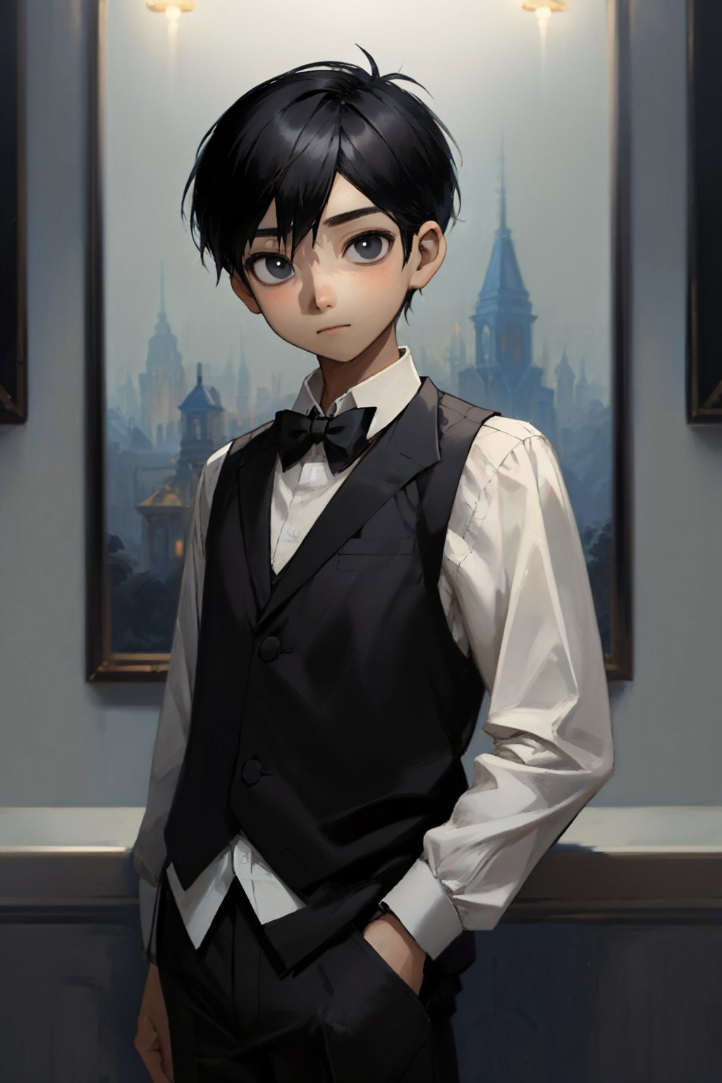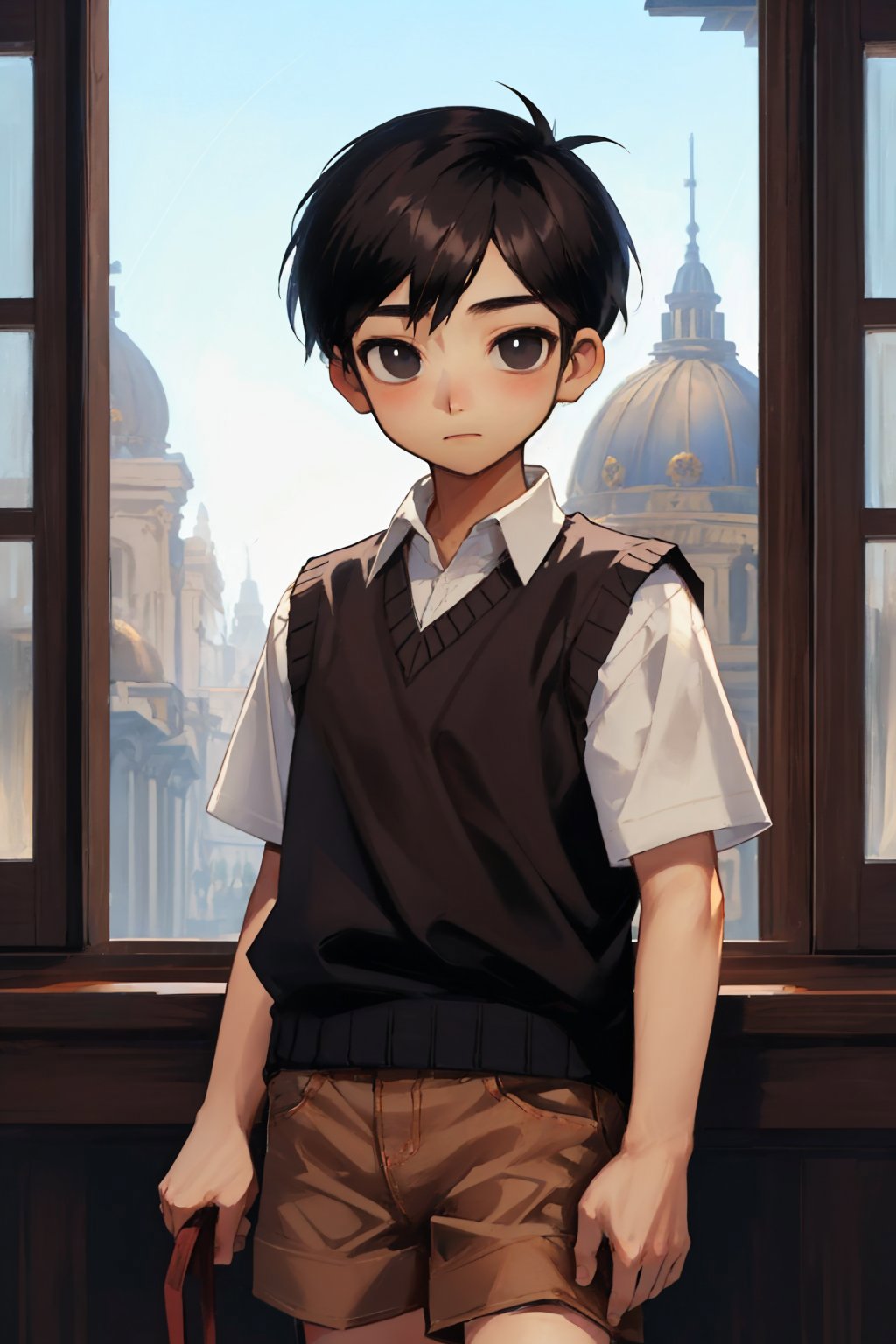 Default Outfit: collared shirt, short sleeves, sweater vest, brown shorts