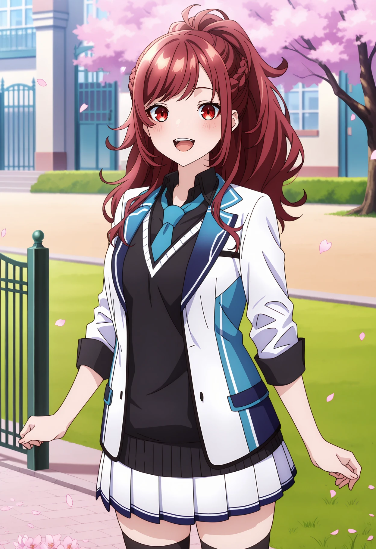 ponytail, long hair, swept bangs, french braid, red hair, red eyes