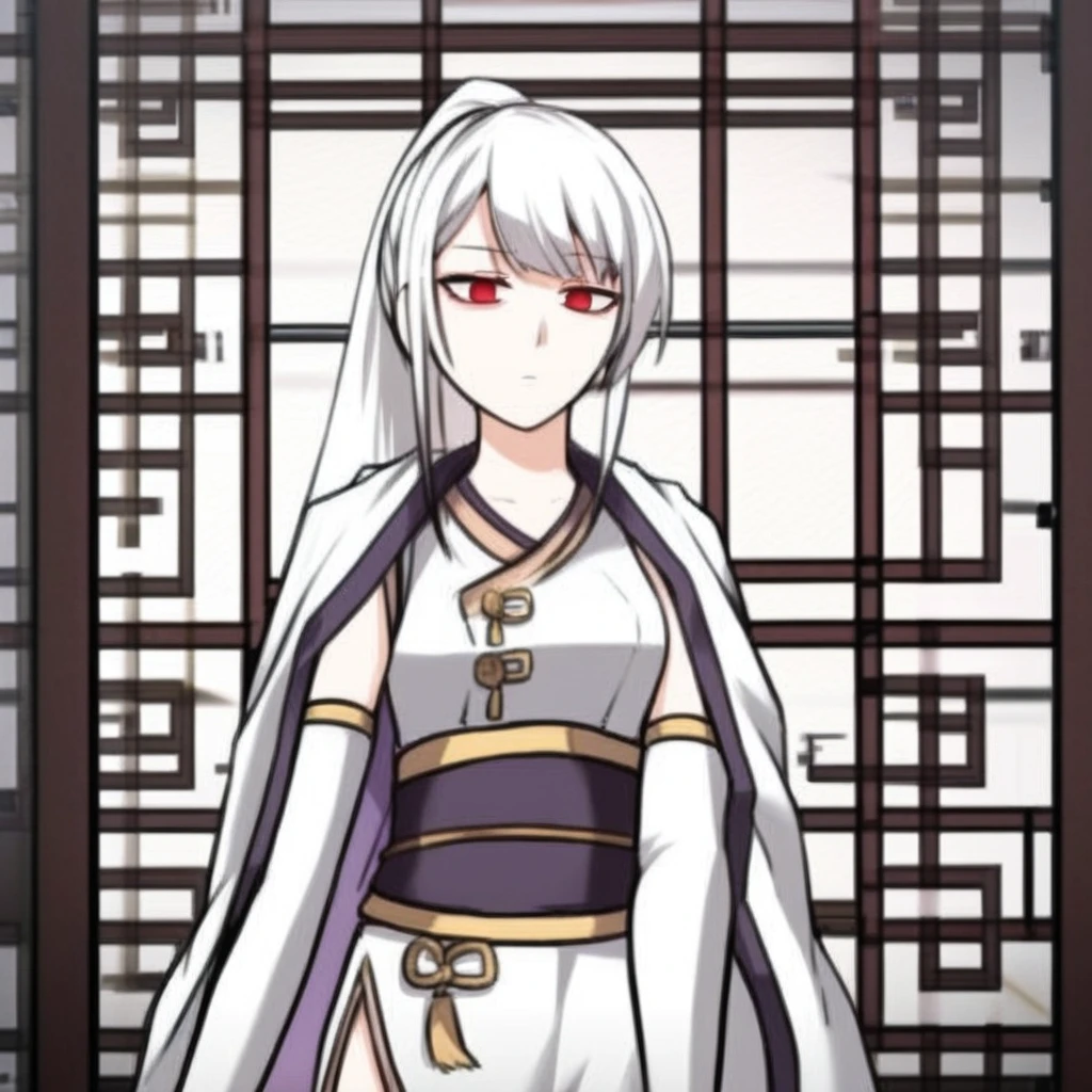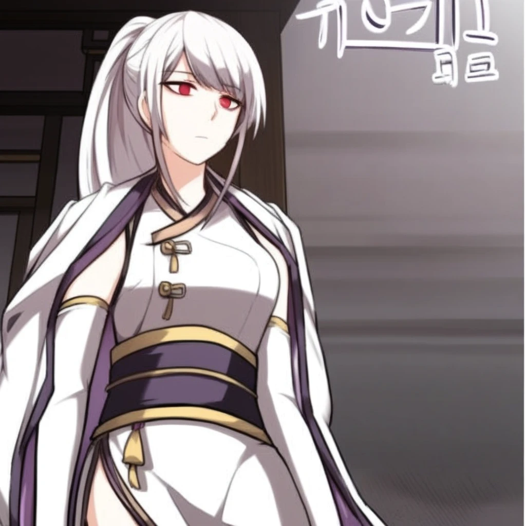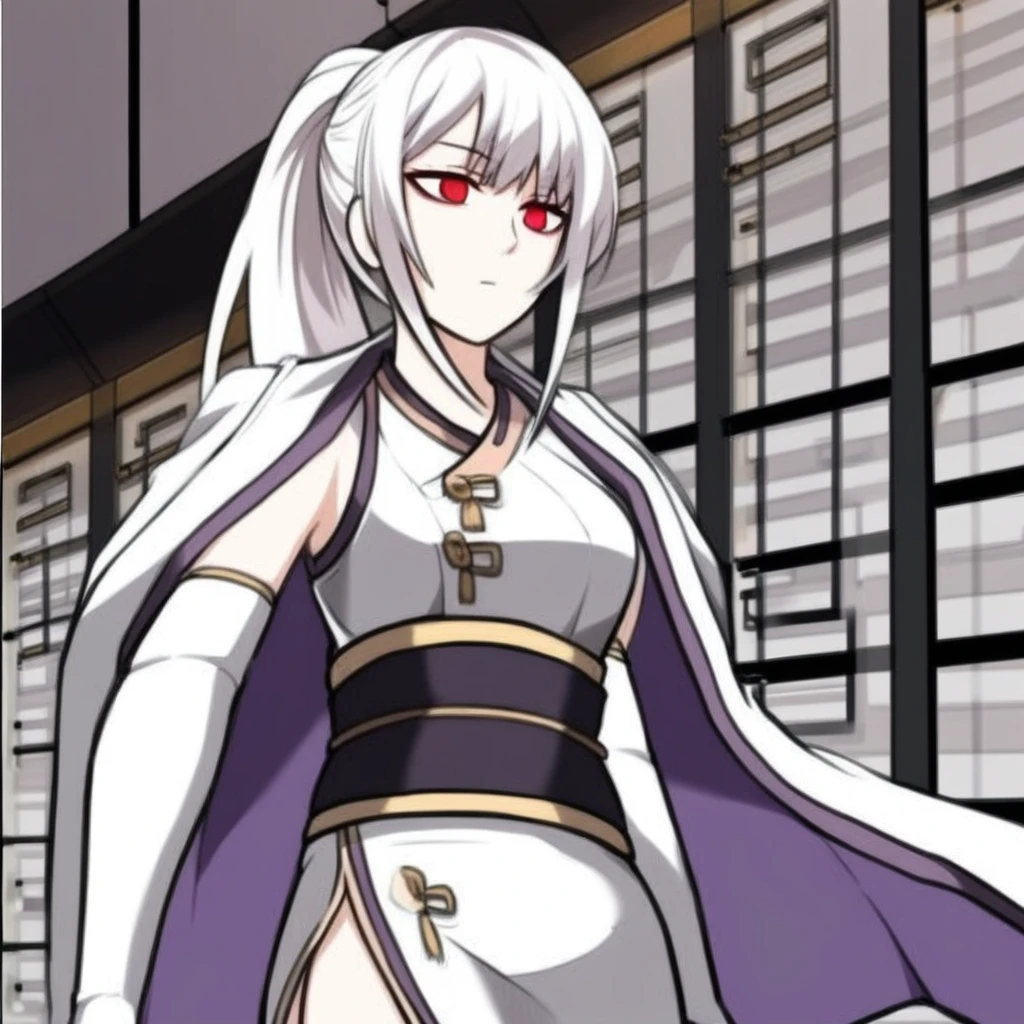 red eyes, gloves, dress, jacket, ponytail, white hair, elbow gloves, sash, side slit, jacket on shoulders