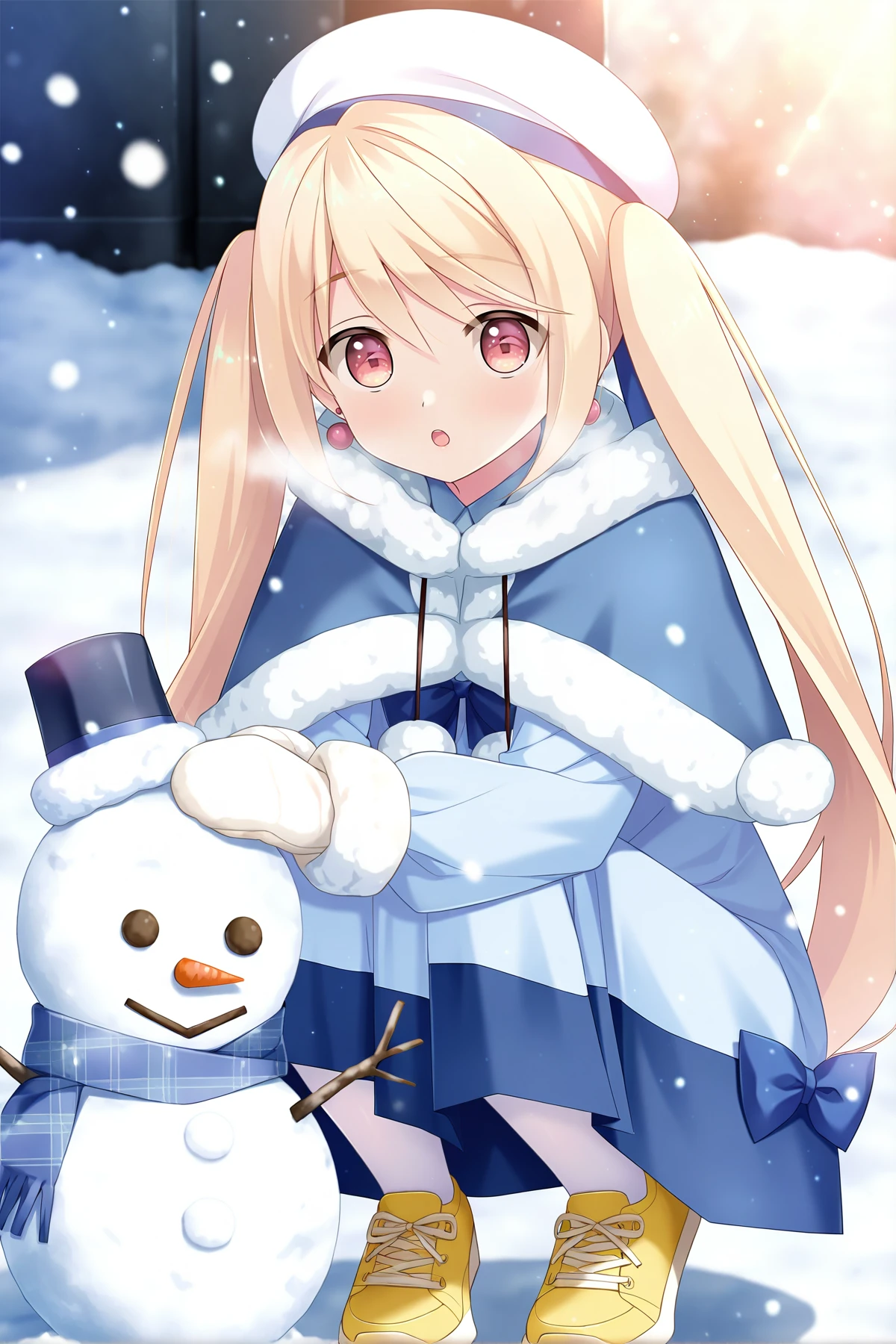 私服:nabatake daily, hat, beret, white headwear, earrings, jewelry, long sleeves,light blue dress, dress, capelet, fur trim, bow, blue bow, pom pom (clothes), white socks, socks, yellow sneakers,