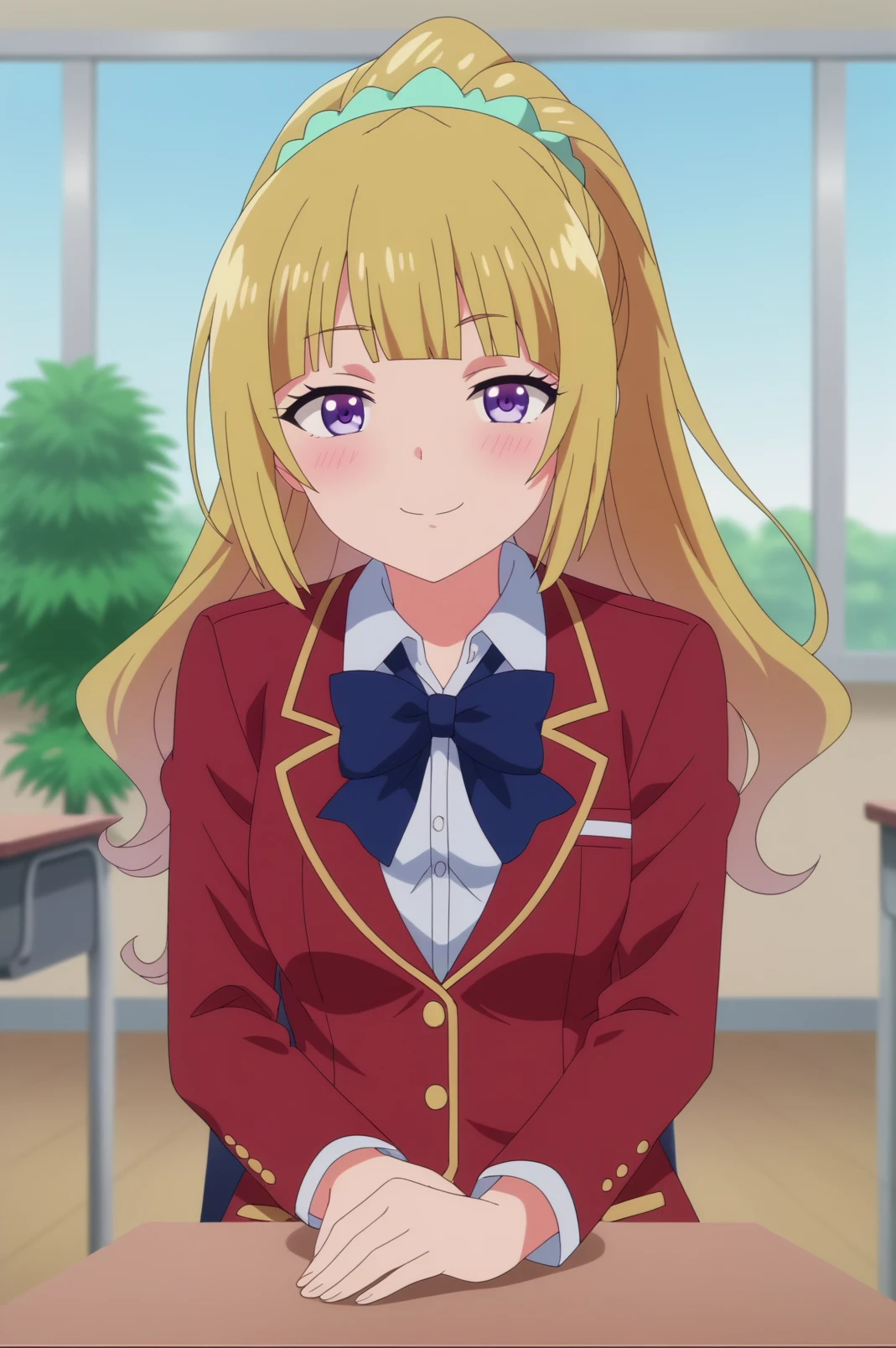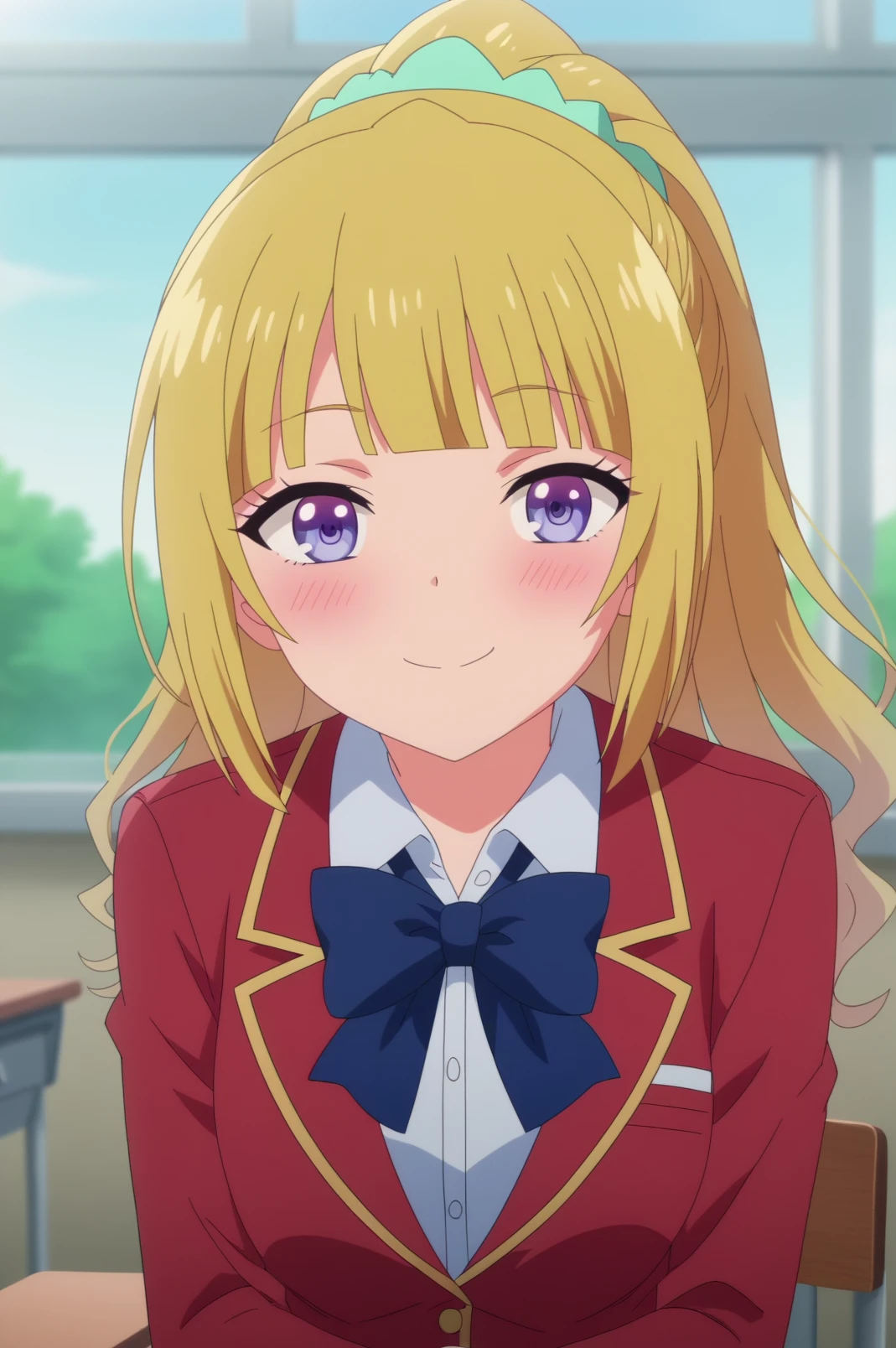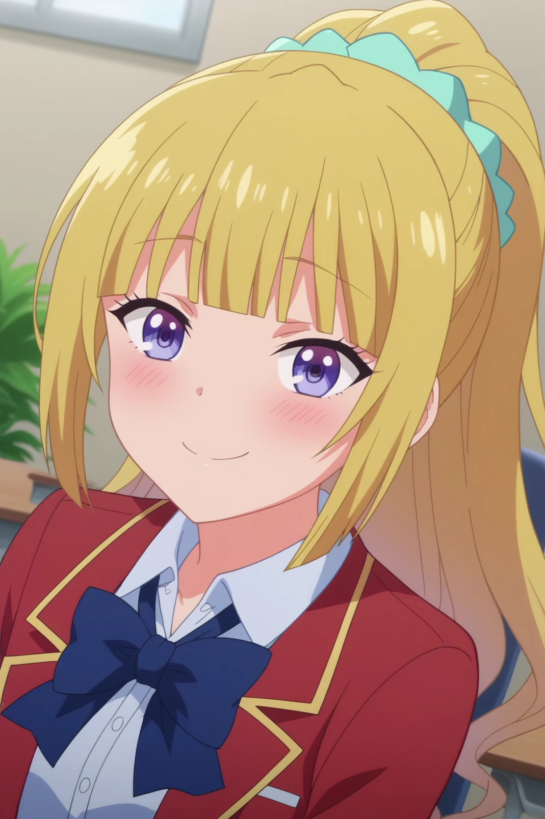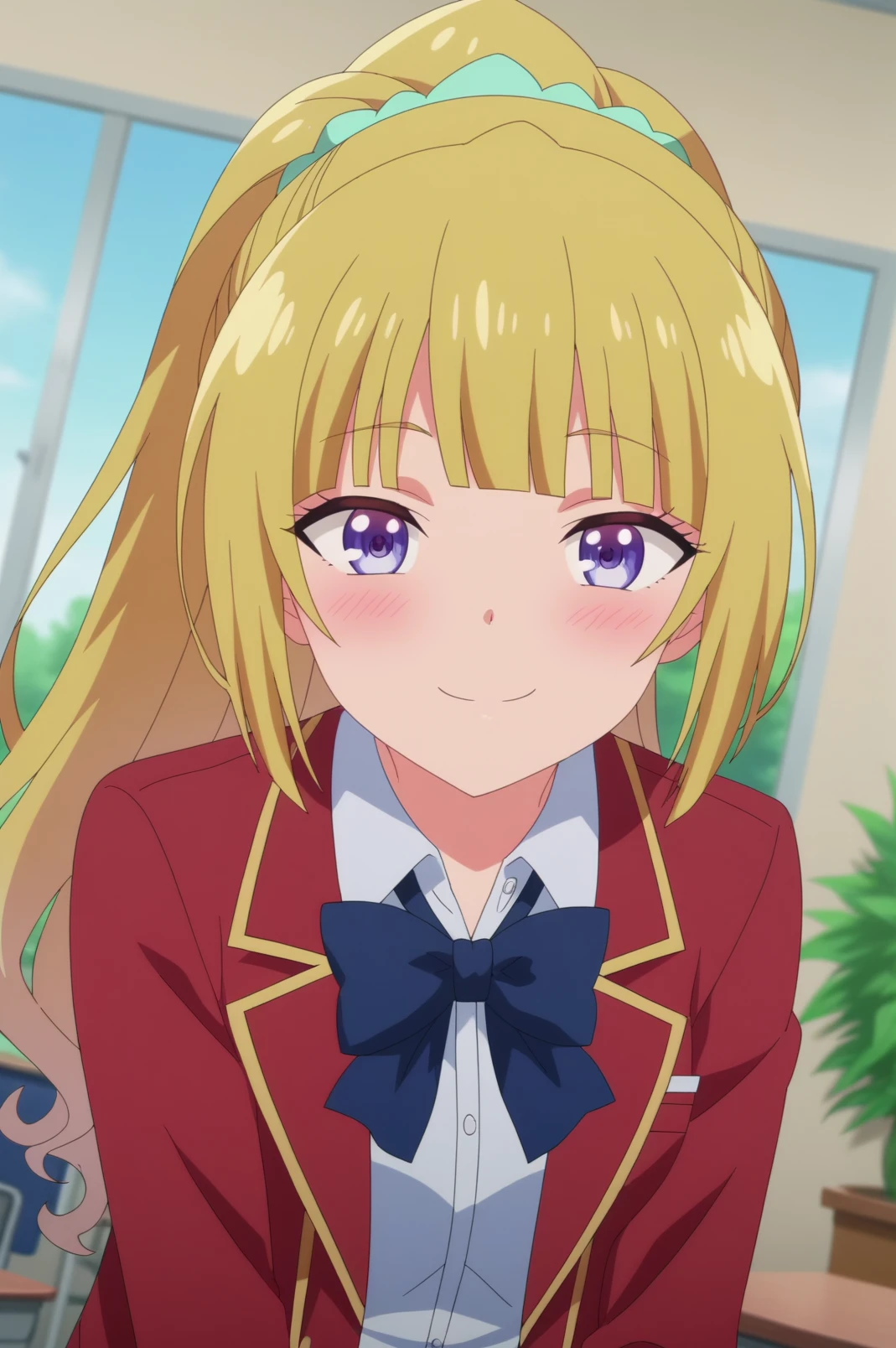 kei karuizawa,blonde hair,bangs,blush,ponytail,bow, school uniform, red blazer,jacket