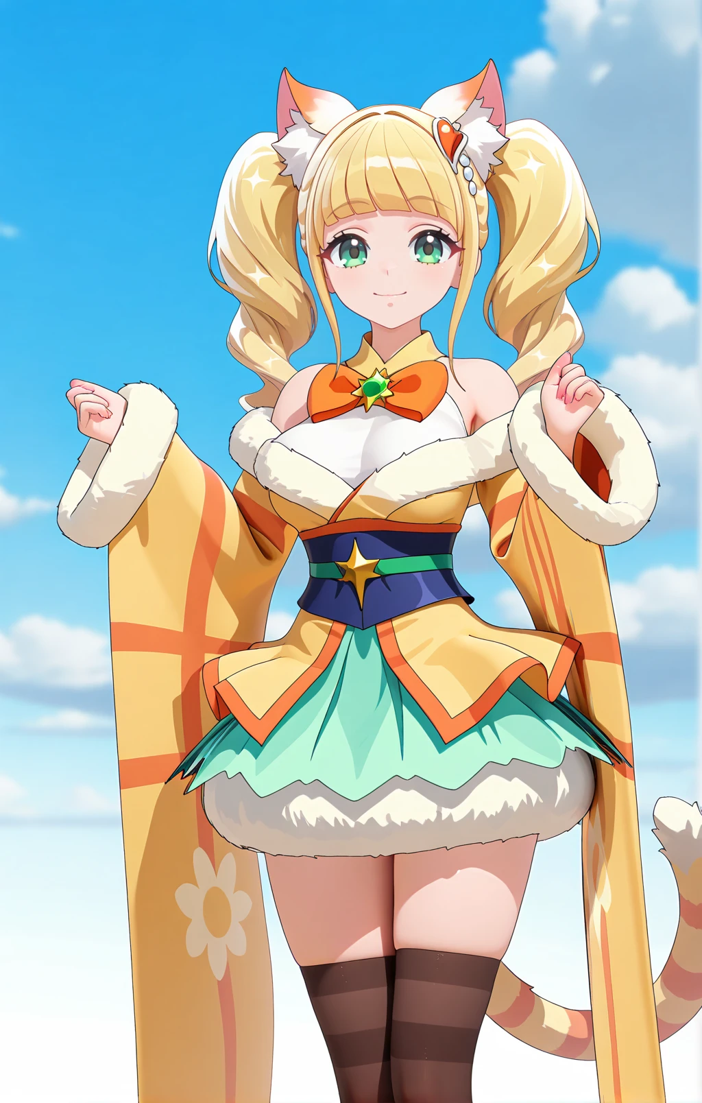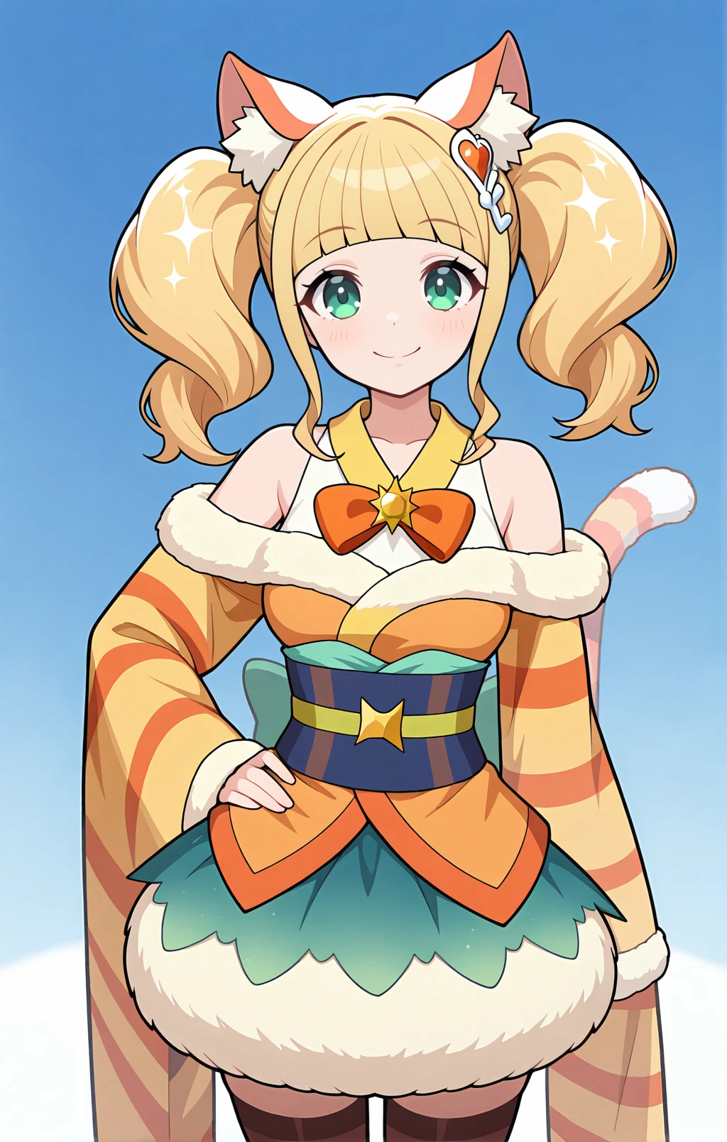 (sparkle_jc_final,animal ears,blonde hair,long hair,twintails,blunt bangs,green eyes,cat ears,animal ear fluff,hair ornament,bare shoulders,striped wide sleeves,detached long sleeves,(orange bow brooch:1.2),orange kimono,fur trim,belt,layered miniskirt,aqua miniskirt,bubbleskirt,cat tail,(striped black stockings:1.2),brown tabi),