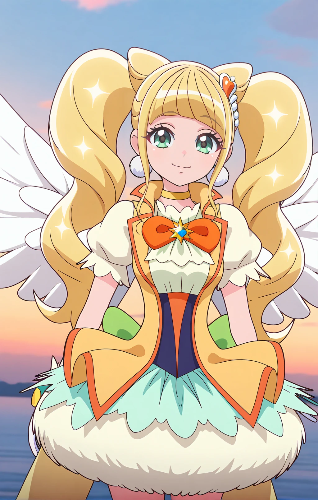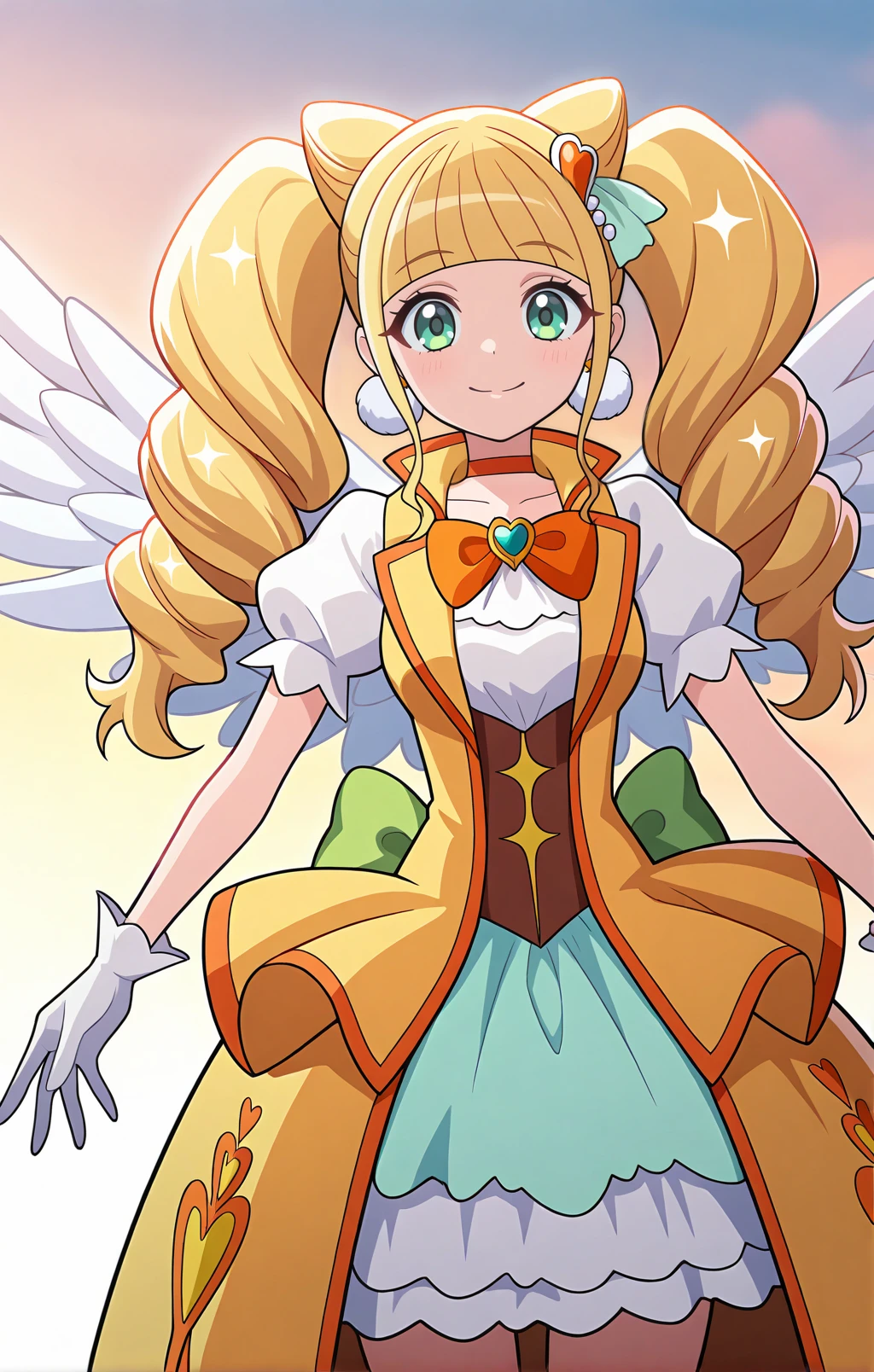 (sparkle_final,blonde hair,cone hair bun,double bun,hair bun,long twintails,,long hair,blunt bangs,bangs,jewelry,hair ornament,heart hair ornament,earrings,green eyes,puffy sleeves,choker,orange bowtie,orange bow,bowtie,vest,short sleeves,layered skirt,brooch,white gloves,bow,heart,dress,skirt,wings),