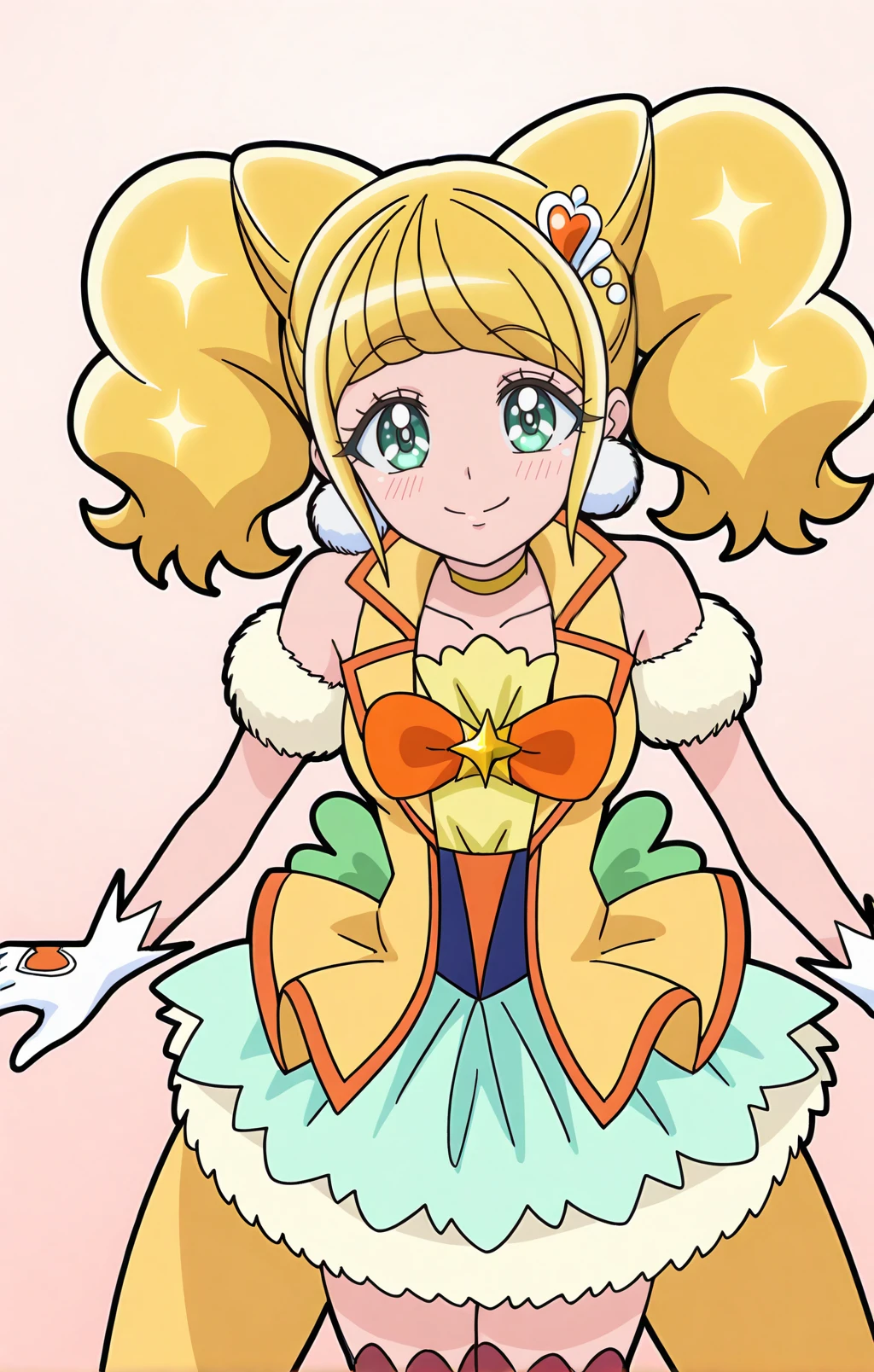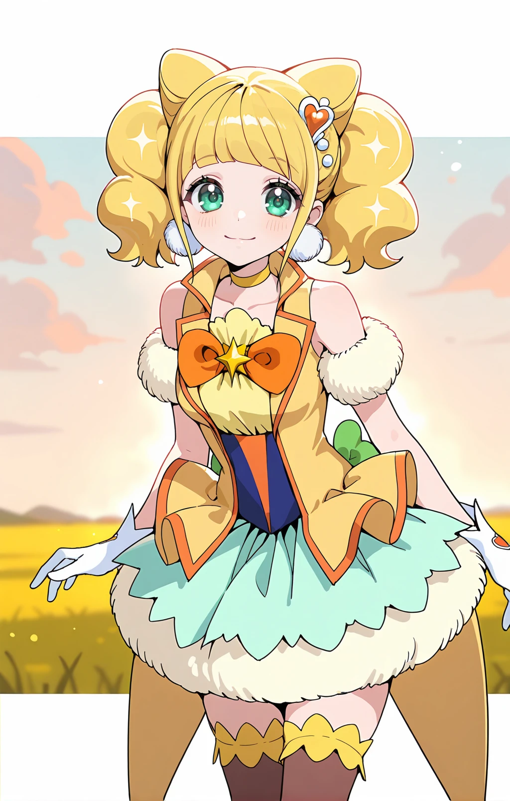 (sparkle_cure,blonde hair,long hair,hair bun,cone hair bun,double bun,short hair,bangs,twintails,green eyes,hair ornament,heart hair ornament,earrings,vest,choker,jewelry,orange bow,bow,white gloves,yellow vest,bowtie,orange bowtie,layered skirt,aqua skirt,black thighhighs,brown thighhighs),yellow footwear,