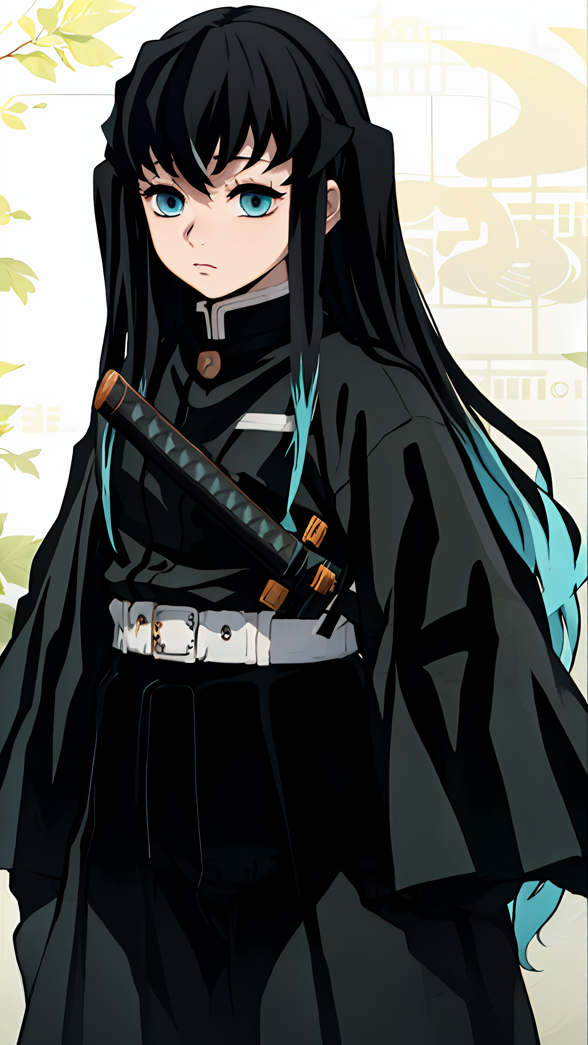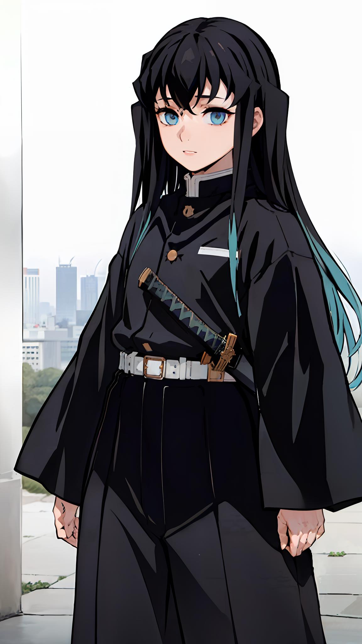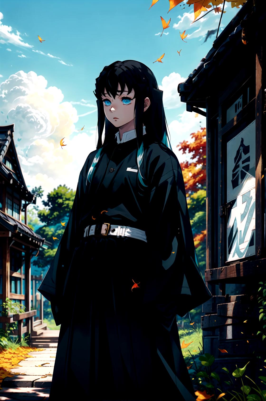 To prompt with demon slayer uniform: Tokitou Muichirou, black hair, bangs, aqua eyes, demon slayer uniform, belt, black jacket, sleeves past fingers, black pants, hakama