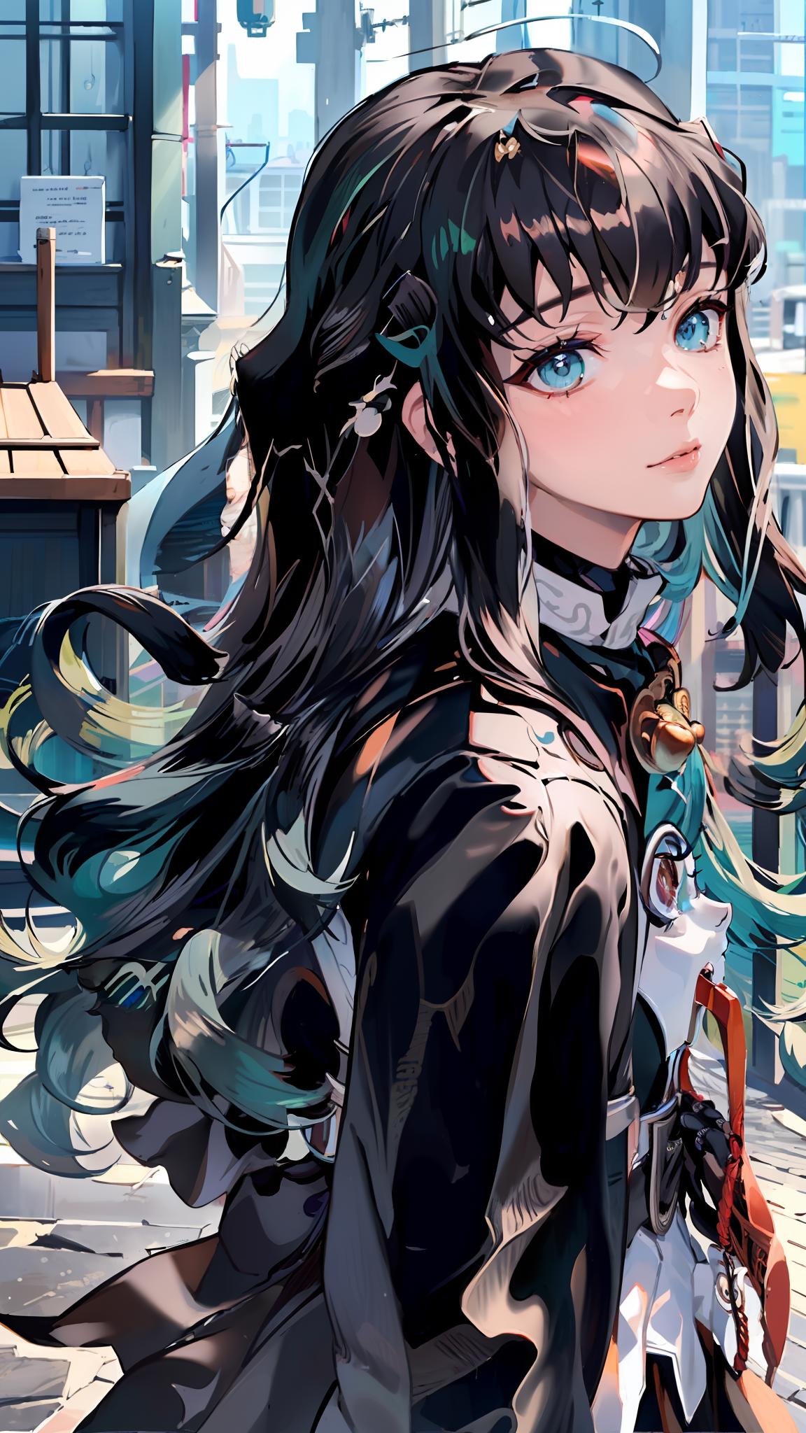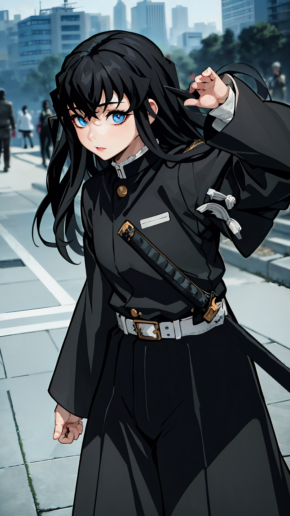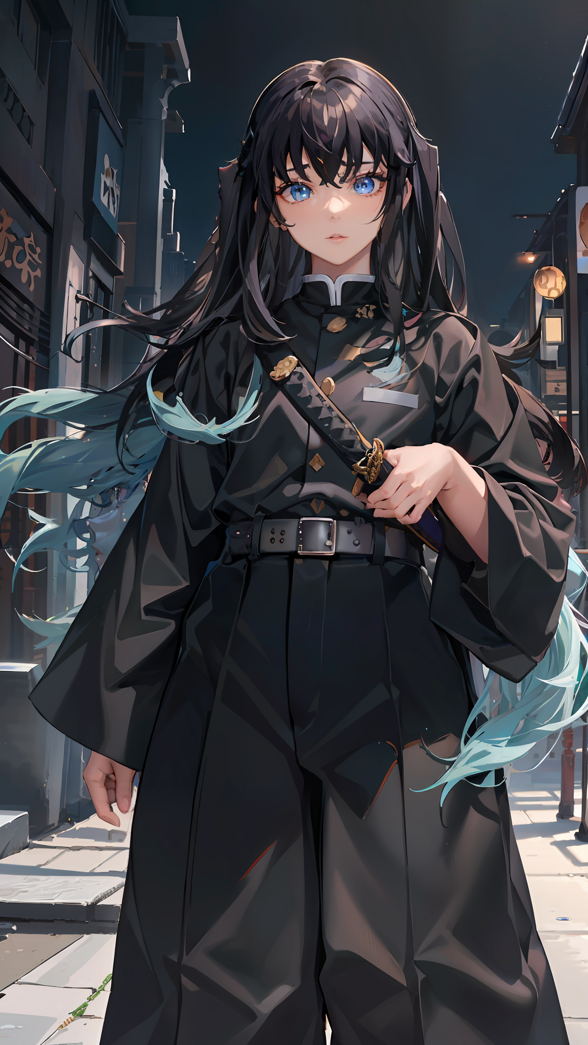 To prompt with demon slayer uniform: Tokitou Muichirou, black hair, bangs, aqua eyes, demon slayer uniform, belt, black jacket, sleeves past fingers, black pants, hakama