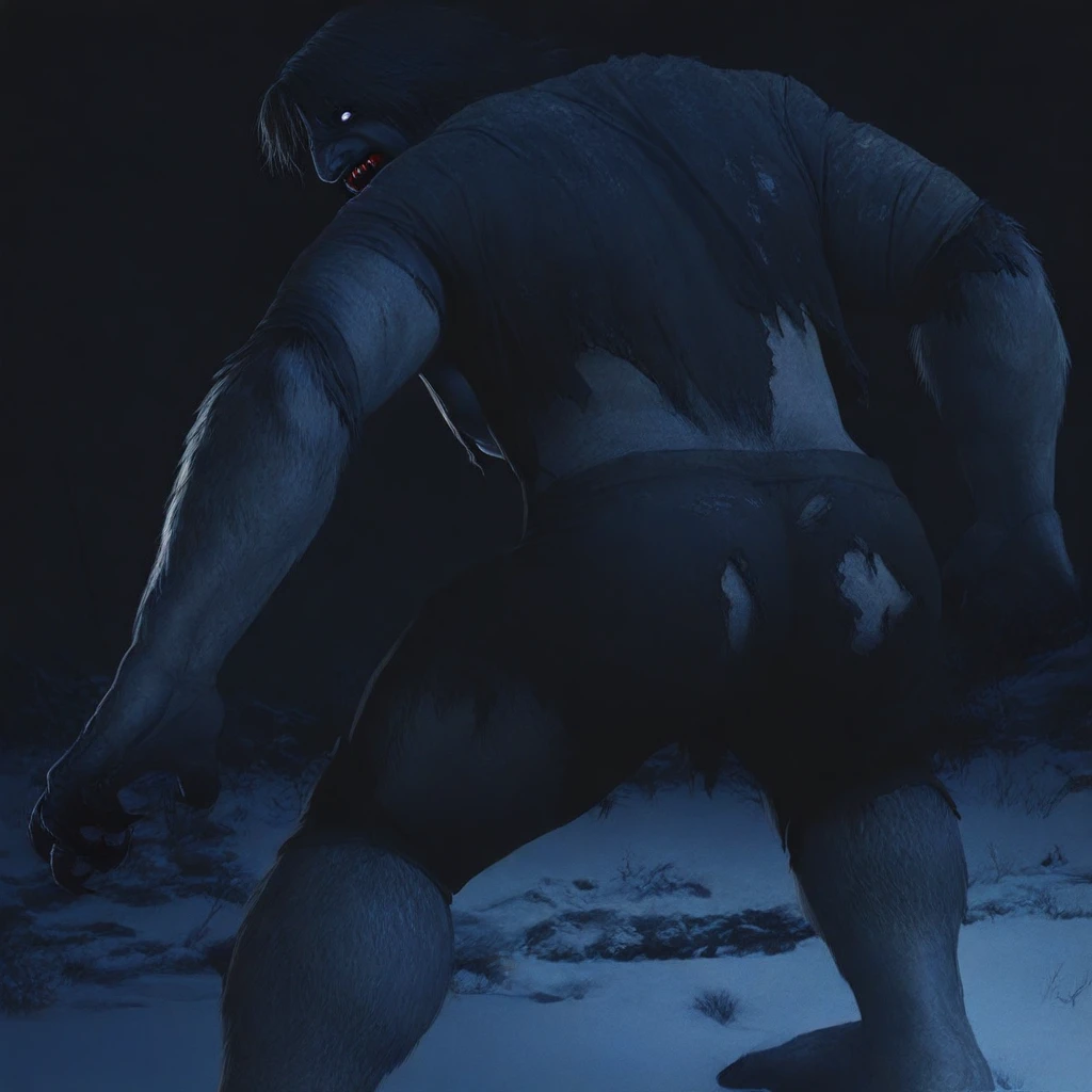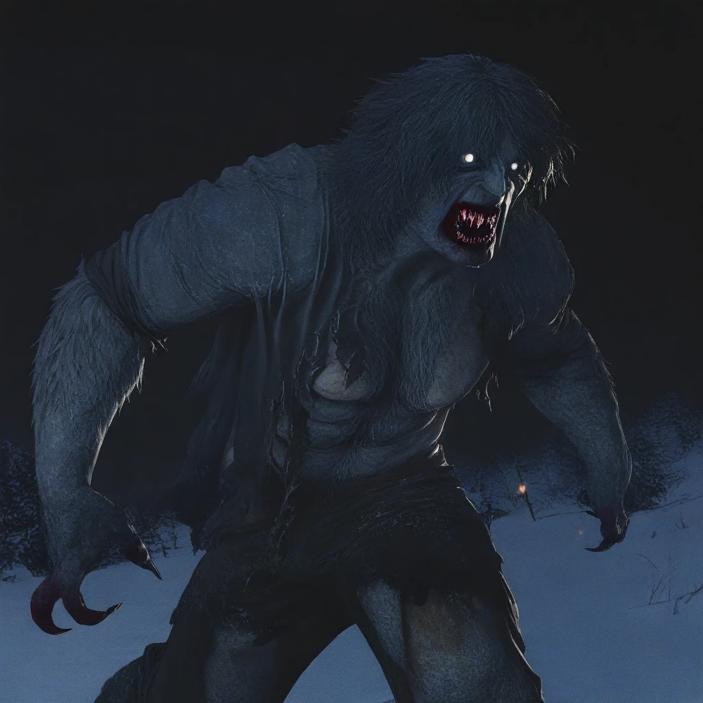 Lycan, muscular, 1boy, solo, male, pectorals, fur, sharp fangs, claws, glowing white eyes, torn clothes, barefoot, snow,