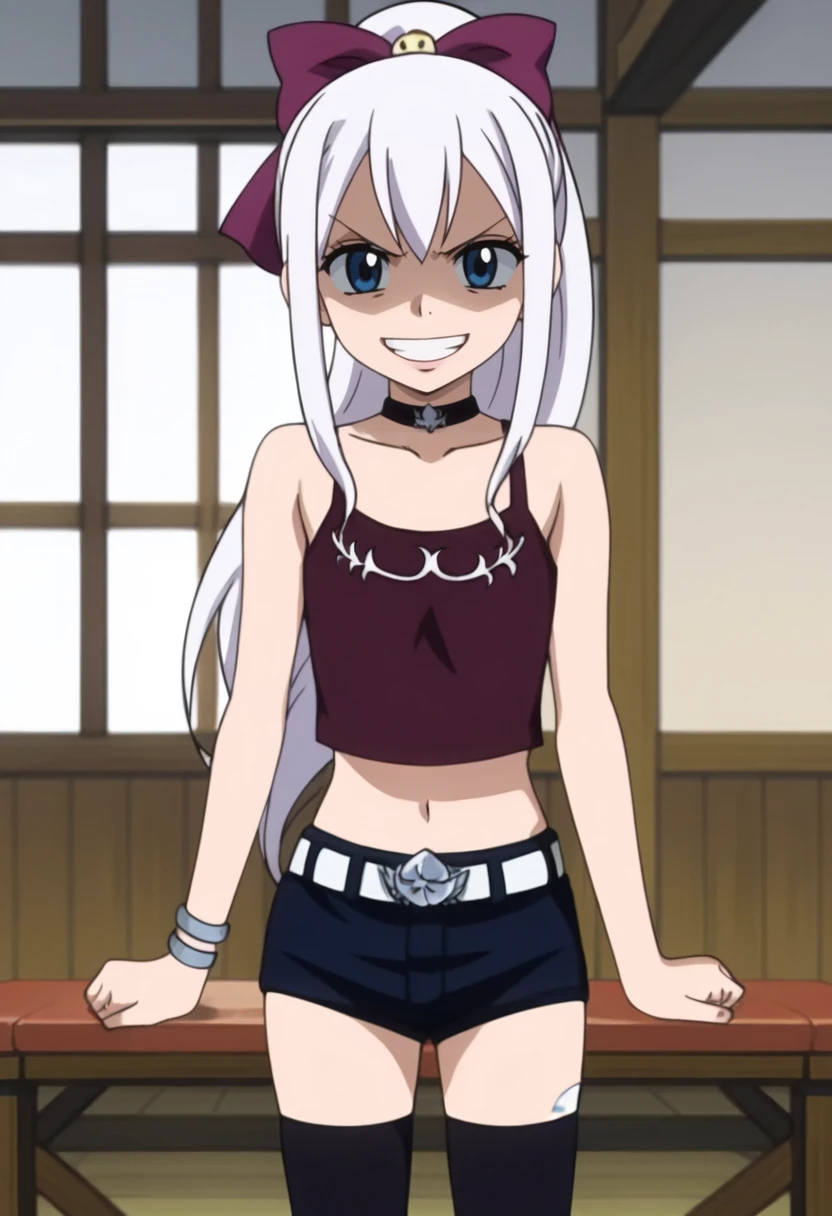 mj, 1girl, flat chest, blue eyes, long hair, white hair, ponytail, choker, collarbone, bare shoulders, tank top, crop top, short shorts, black shorts, black thighhighs, bracelet,