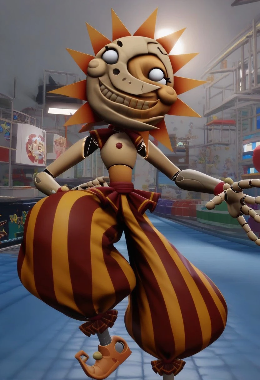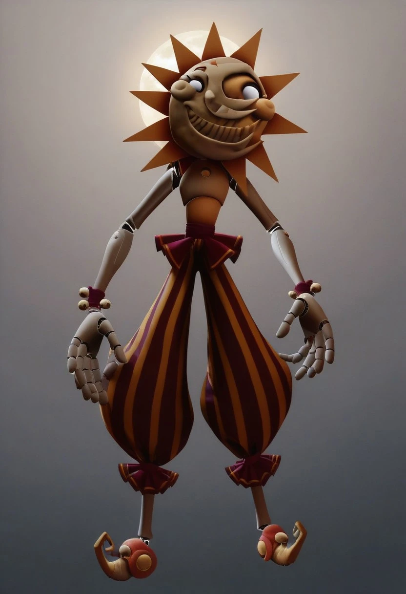 Name: Sun, animatronic, robot, stylized light- beige sun-shaped head, white eyes, head has spikes on its perimeter that resemble sun rays, lanky body with long limbs, yellow pants with maroon stripes, elf-like shoes with a star symbol on the outer part of the shoes, and a moon symbol on the inner part, maroon ribbons with bells wrapped around his wrists,