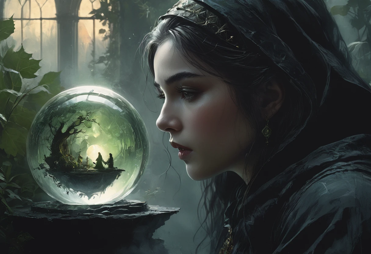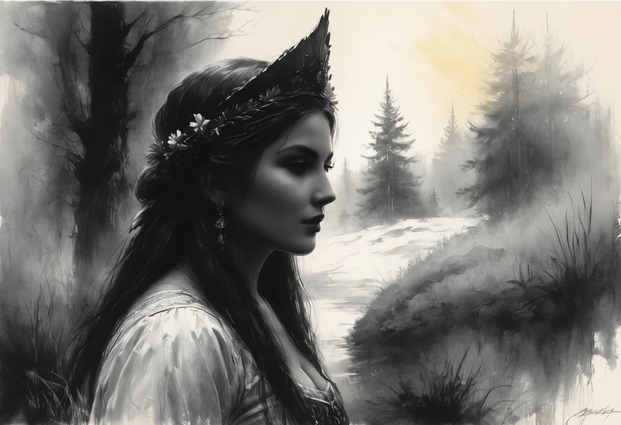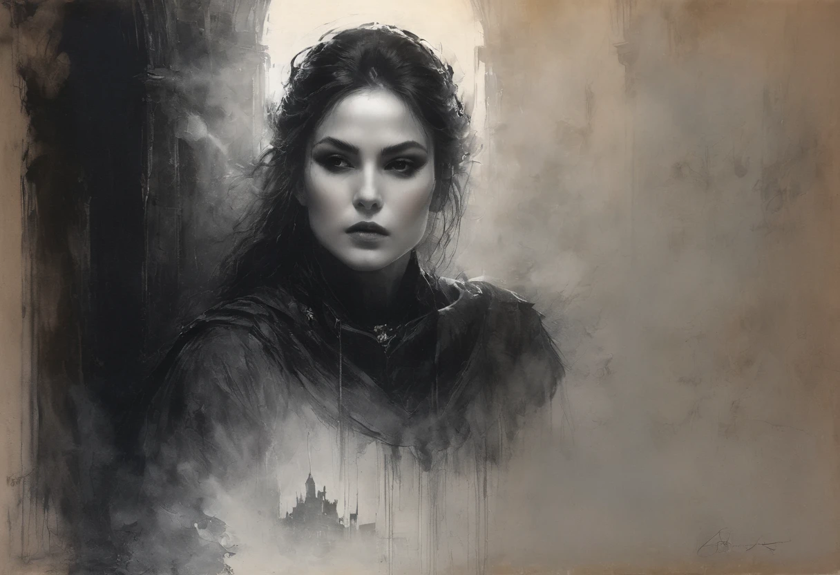 Black and white art, pencil drawings, charcoal and chalk drawings. Sketch, chiaroscuro, darkness, concept art, wide angle, side view, dark fantasy style, painting depicting a young woman sitting in her castle at sunset in the evening and holding the audience. The room is dusty and rays of light cut through the darkness, creating a gloomy atmosphere. A young woman watches the siege of a city from the window of her castle, her expression both powerful and pensive. Anna Razumovskaya, Casey Baugh, Antonio Mora, Aminola Rezai, Giovanni Boldini, art,