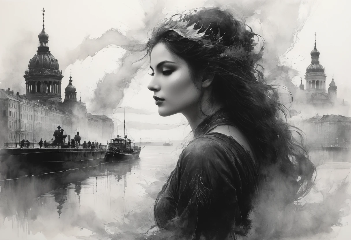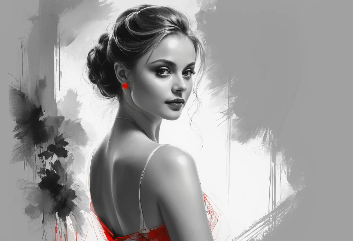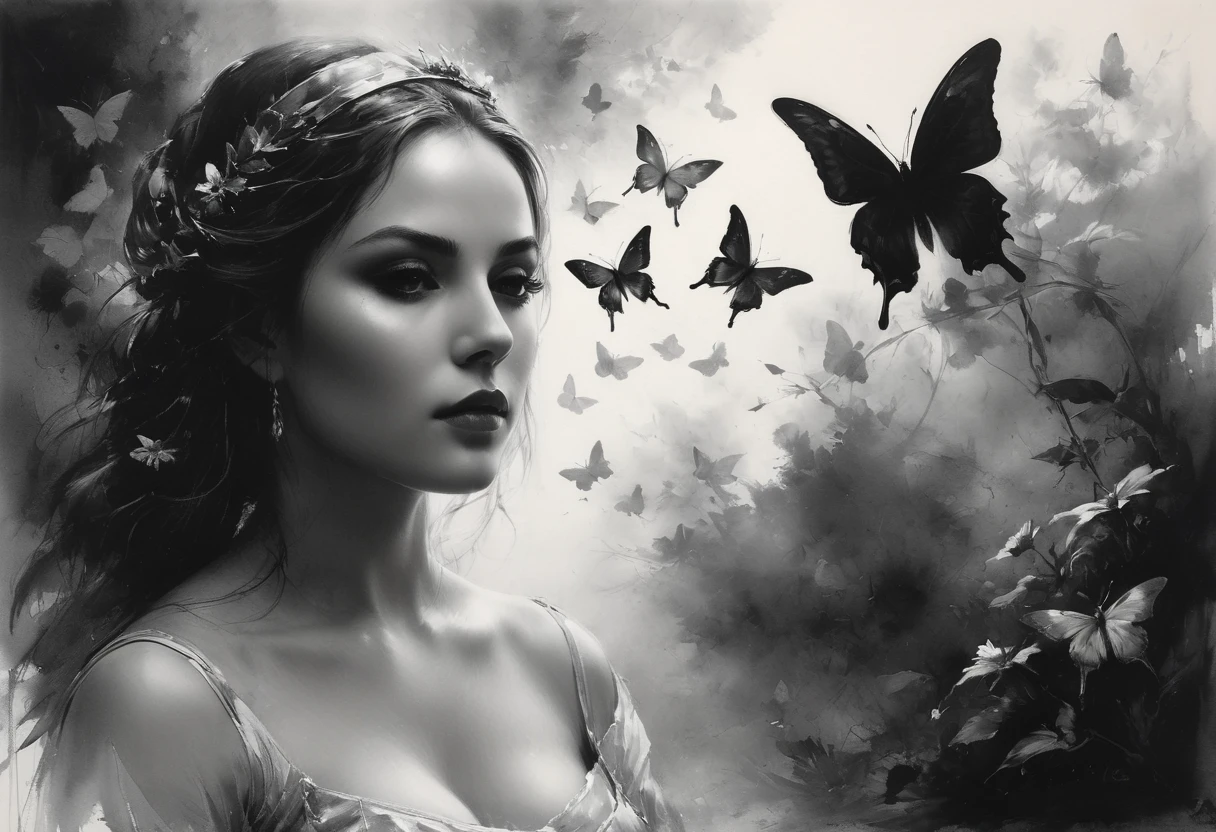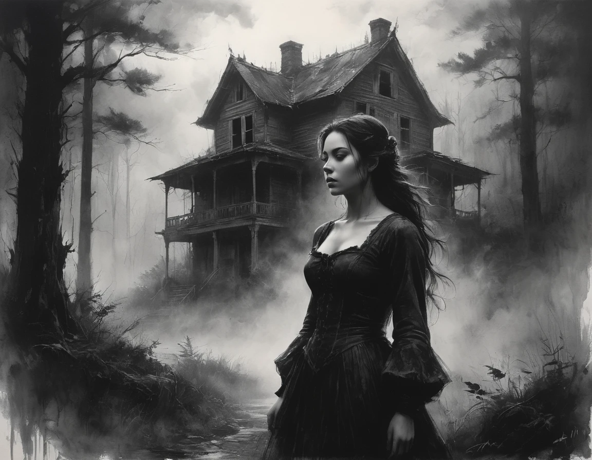 Black and white art, pencil drawings, charcoal and chalk drawings. Sketch, chiaroscuro, darkness, concept art, wide angle, side view, dark fantasy style, painting depicting a young woman sitting in her castle at sunset in the evening and holding the audience. The room is dusty and rays of light cut through the darkness, creating a gloomy atmosphere. A young woman watches the siege of a city from the window of her castle, her expression both powerful and pensive. Anna Razumovskaya, Casey Baugh, Antonio Mora, Aminola Rezai, Giovanni Boldini, art,