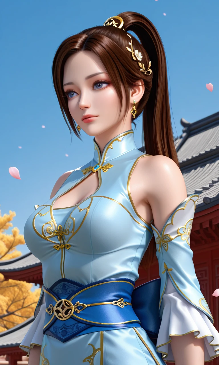 1girl, solo, long_hair, breasts,blue_eyes, brown_hair, black_hair, hair_ornament, thighhighs, dress, cleavage, bare_shoulders, jewelry, sitting, ponytail, earrings, detached_sleeves, water, sash, petals, clothing_cutout, blue_dress, from_above, chinese_clothes, cleavage_cutout, partially_submerged, bathtub, petals_on_liquid