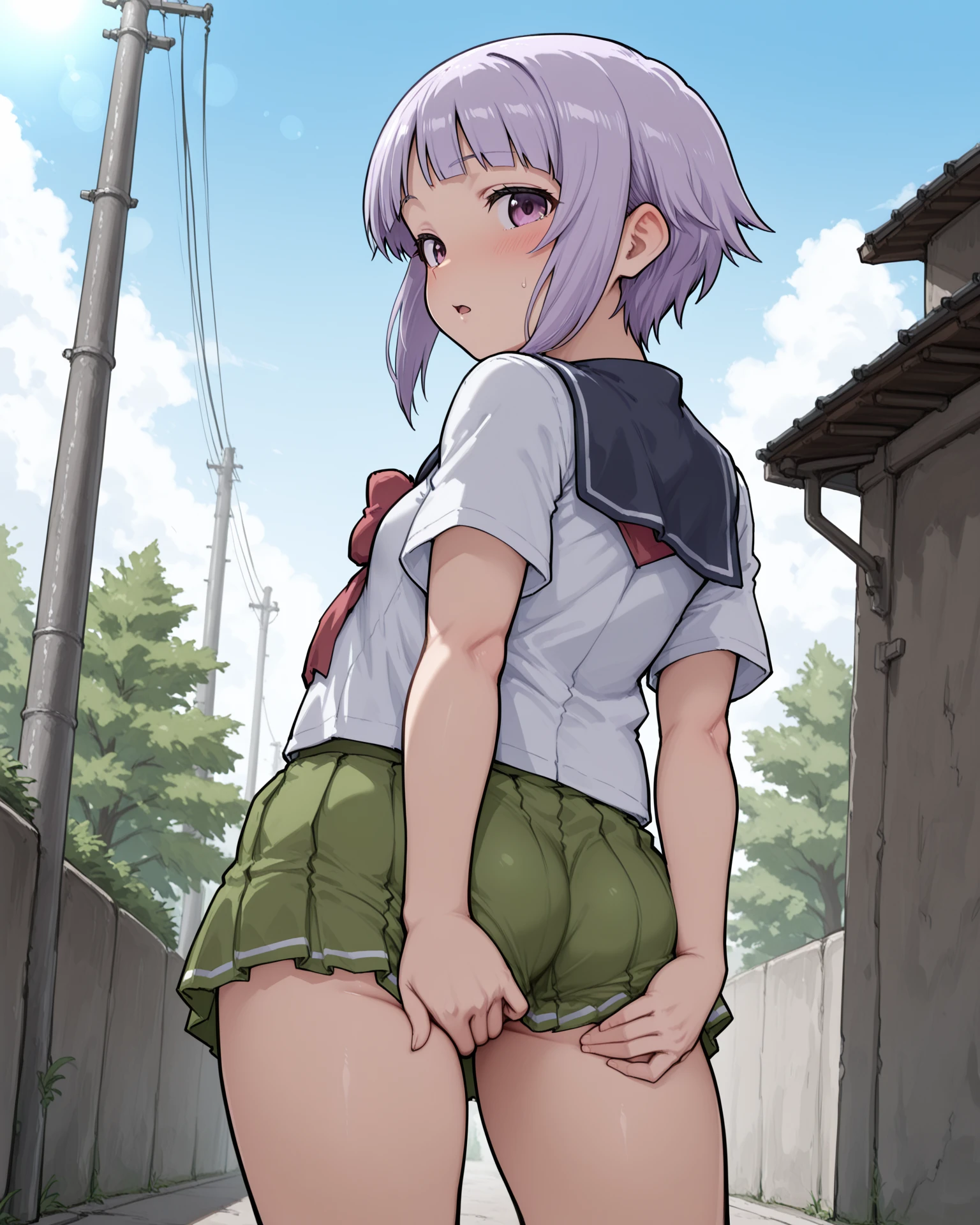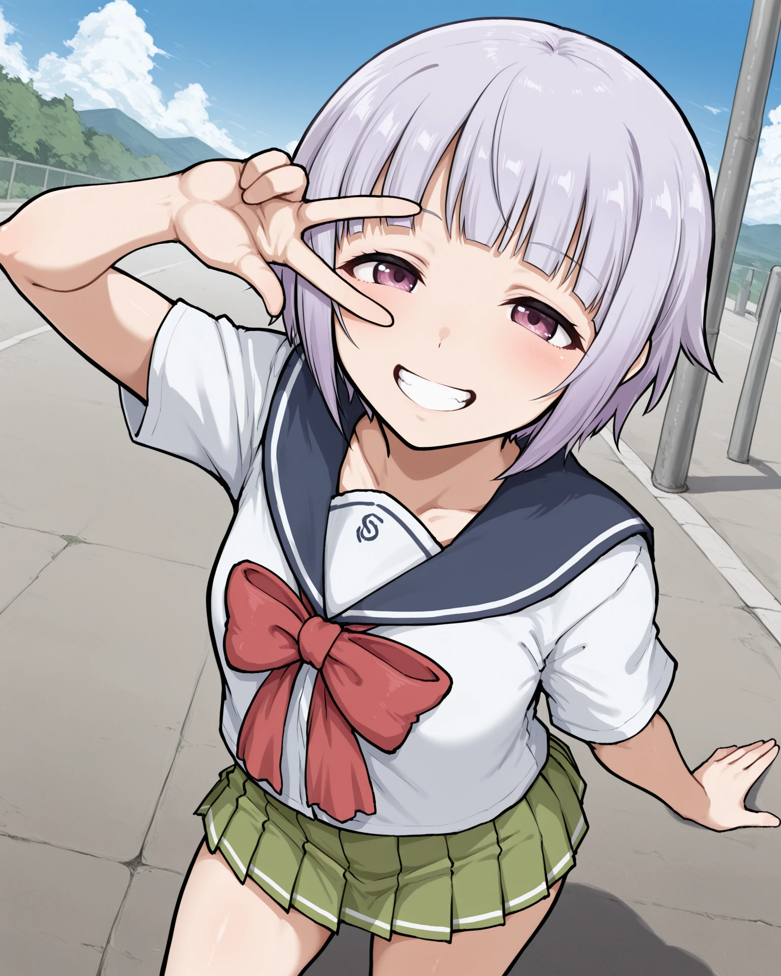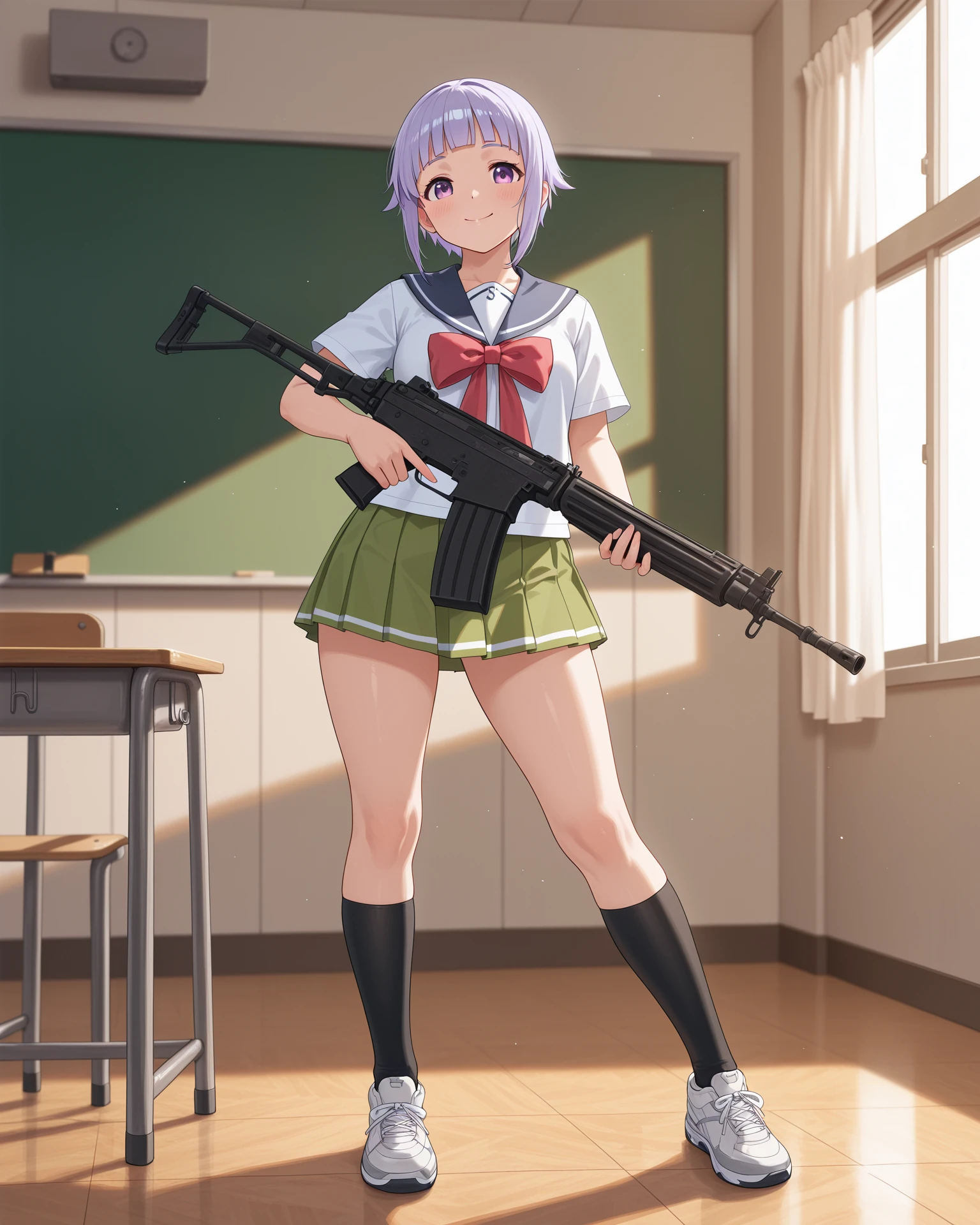 funco, purple eyes, purple hair, short hair, blunt bangs, school uniform, sailor collar, white shirt, short sleeves, red bowtie, green skirt, pleated skirt, black kneehighs, sneakers