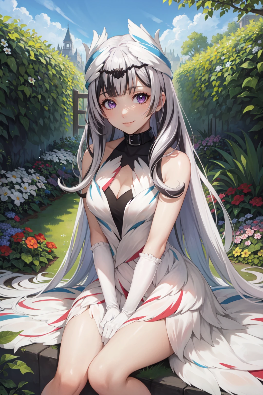 veyle, long hair, very long hair, dress, gloves, bare shoulders, white dress, collar, sleeveless dress, elbow gloves, cleavage