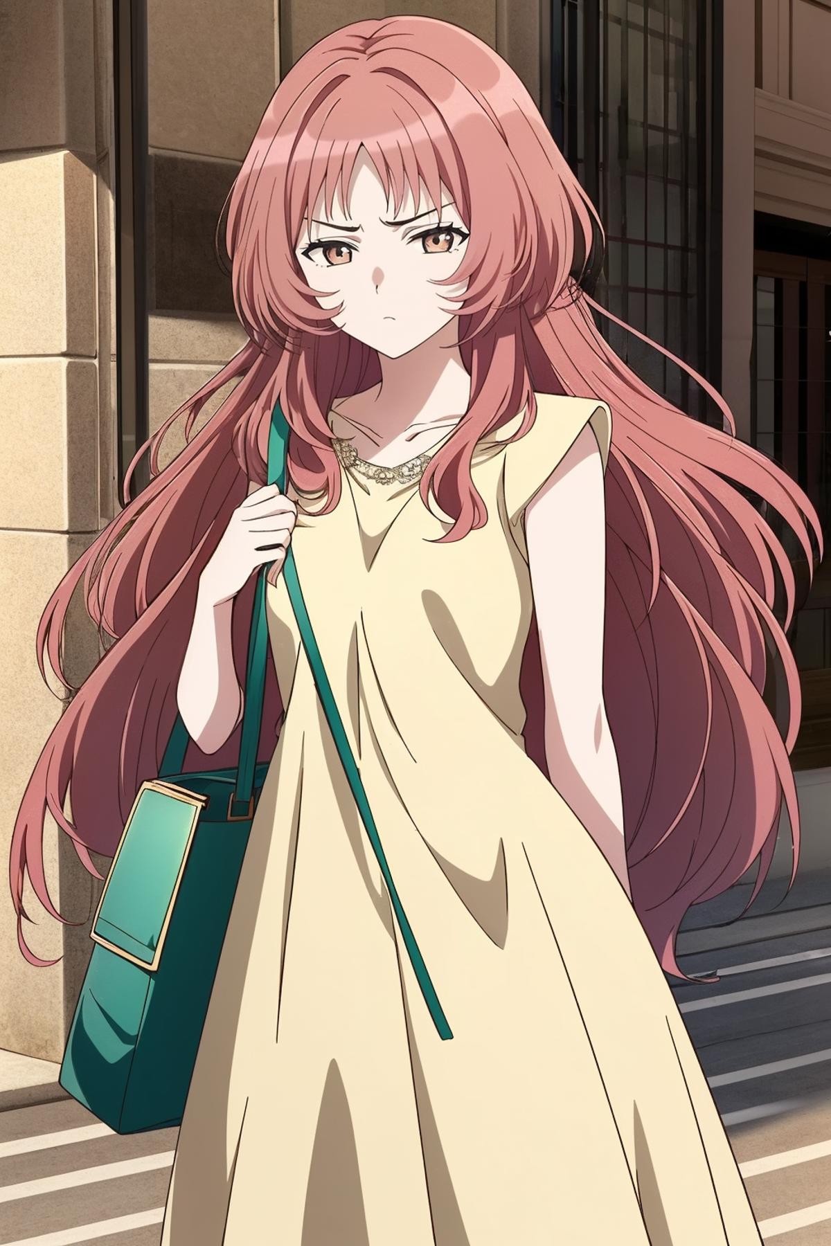 1girl,solo,long hair,red hair,multicolored hair,brown hair,pink hair,bangs,medium breasts,frown,