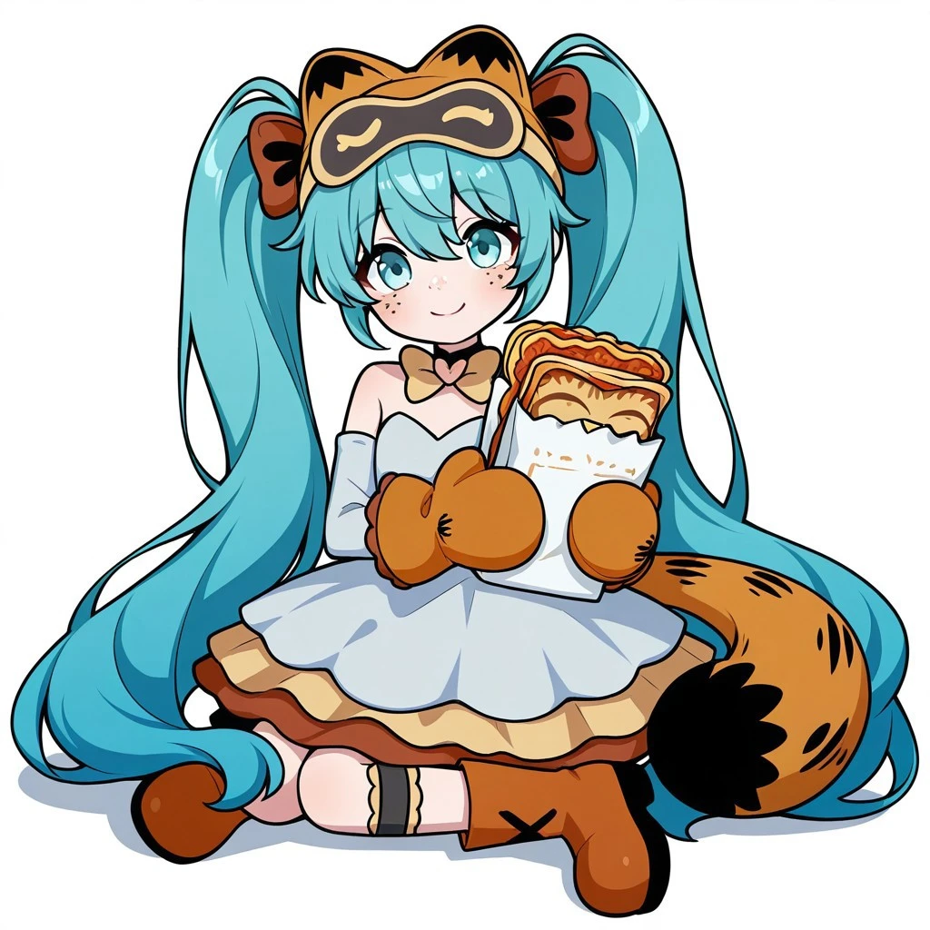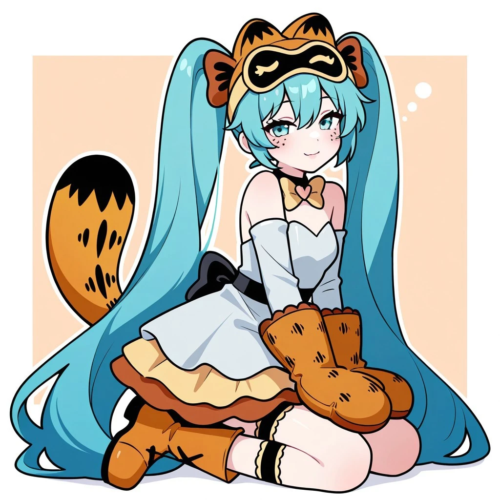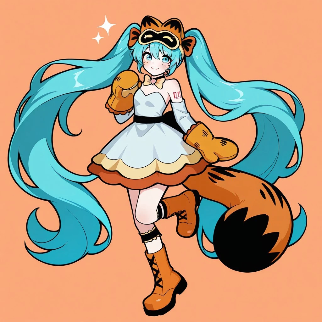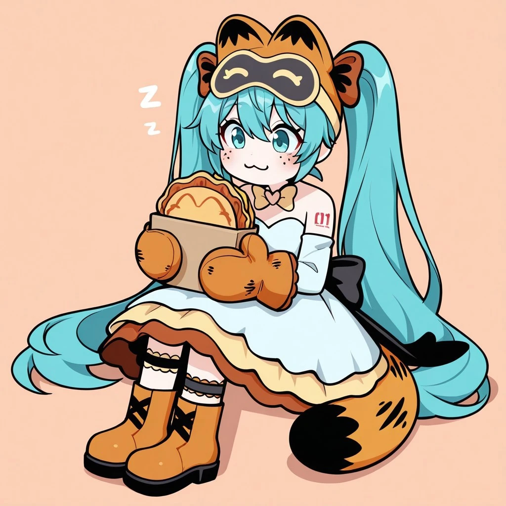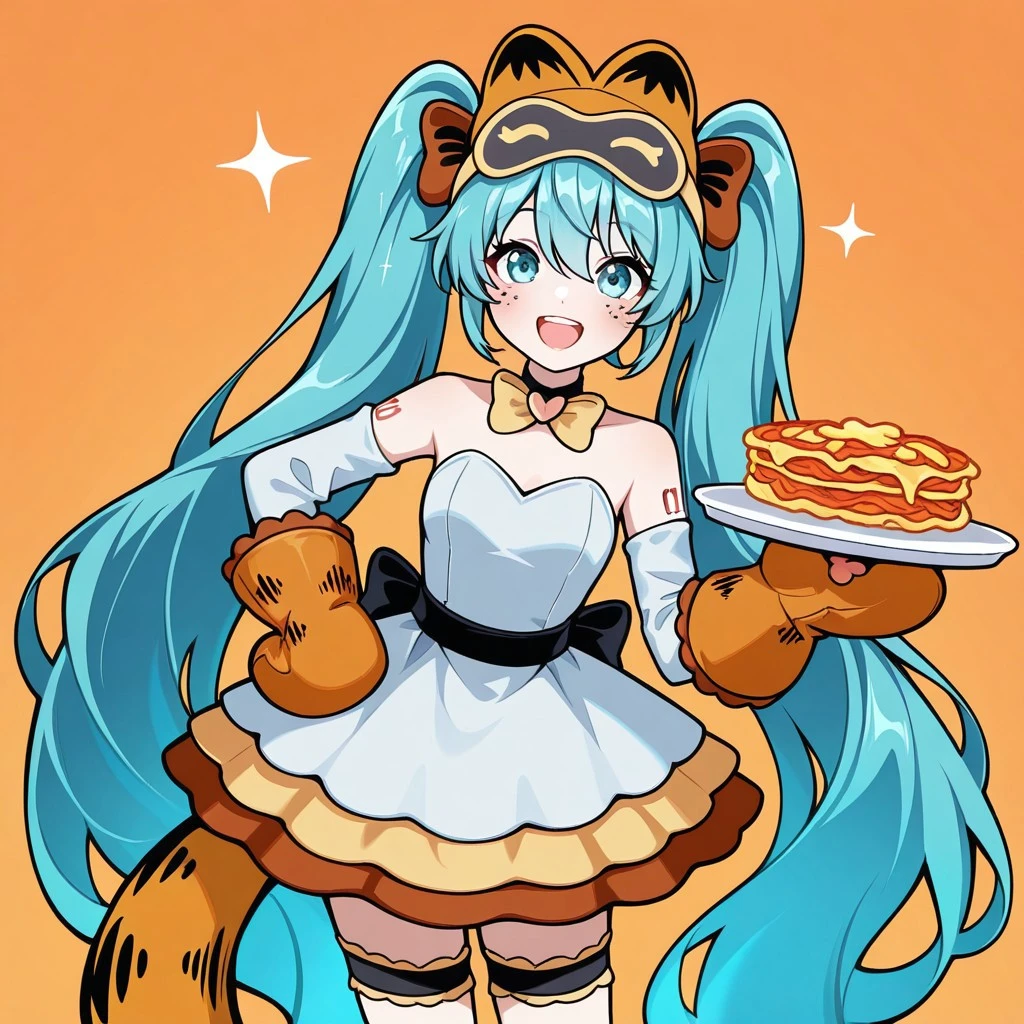 garfieldmiku, hatsune miku, garfield, 1girl, solo, aqua hair, twintails, absurdly long hair, hair between eyes, crossed bangs, freckles, aqua eyes, hair ornament, orange cat ears, sleep mask, yellow bow tie, white sleeveless dress, black bow belt, white detached sleeves, orange oven mitts, black leg garters, orange boots, orange cat tail,