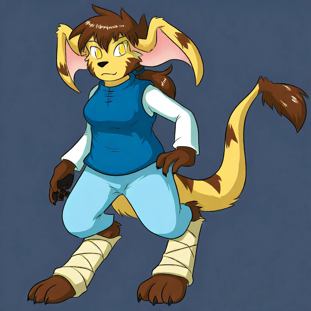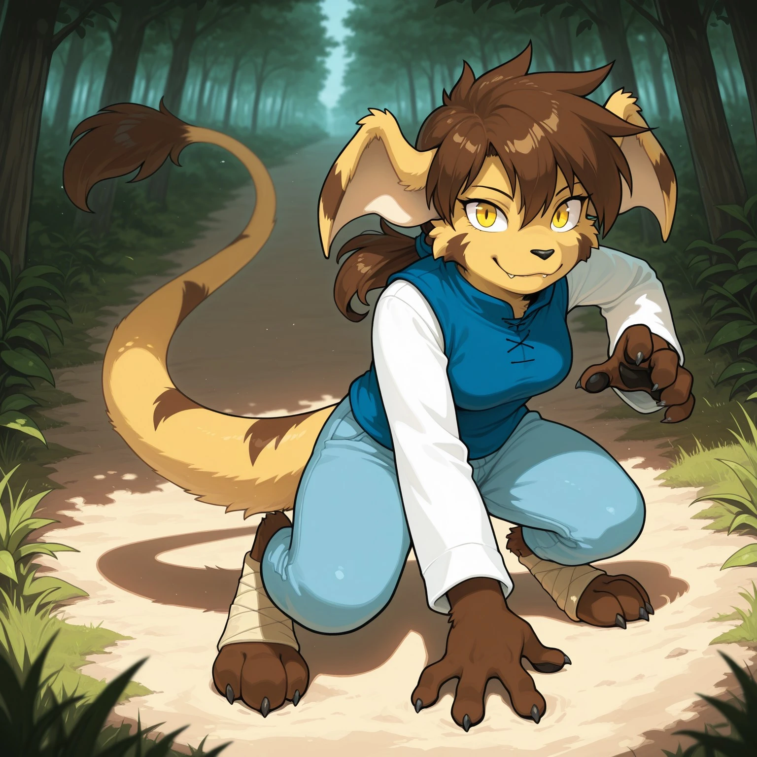 Tags: rheasnaketail, solo, full view, 1girl, furry, digitigrade, colored skin, brown hair, ponytail, yellow eyes, animal ears, vest, shirt, pants, bandaged foot, long tail, fewer digits