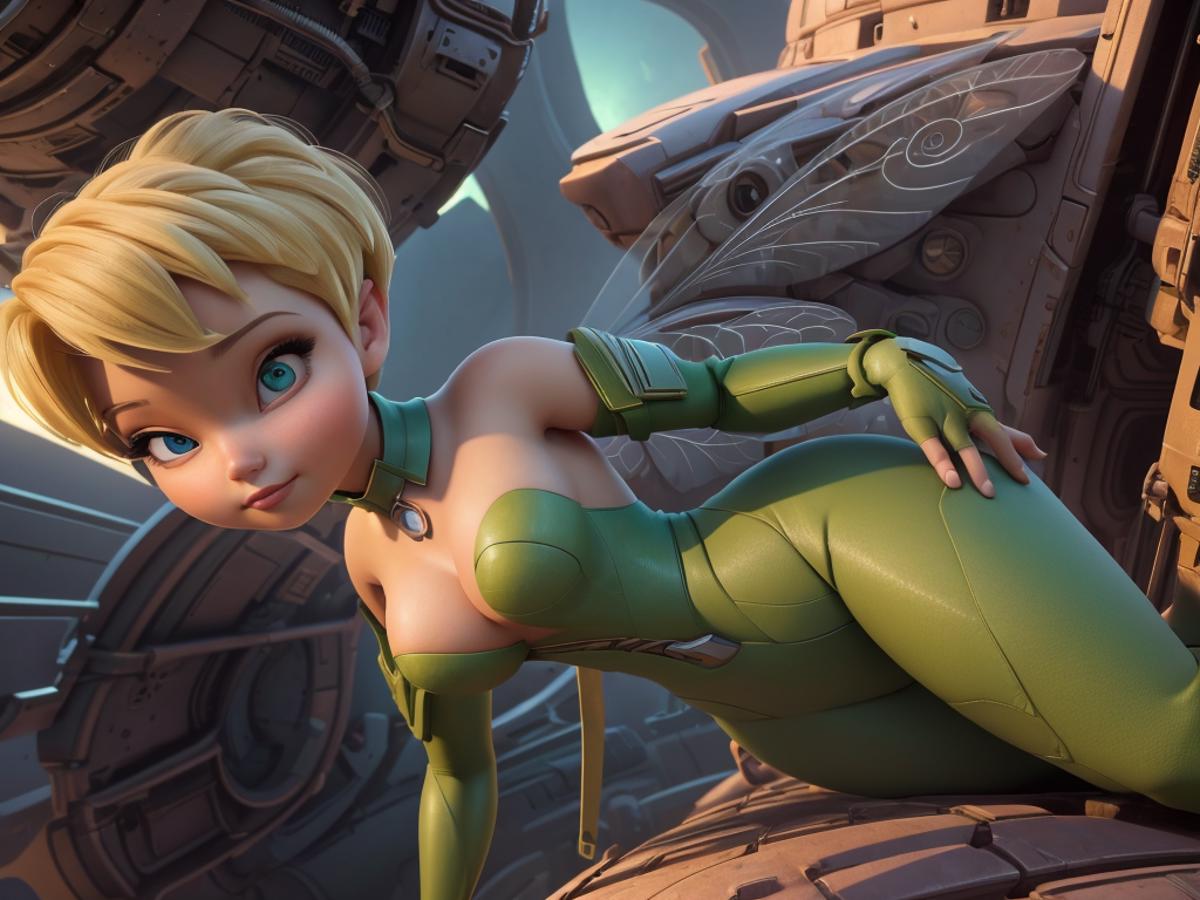 TinkerBell, long wings, green clothes, hair bun, pointy ears, blue eyes,