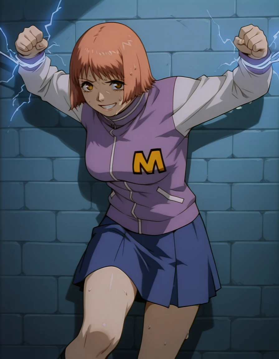 letterman jacket, purple shirt, white sleeves, skirt, blue skirt