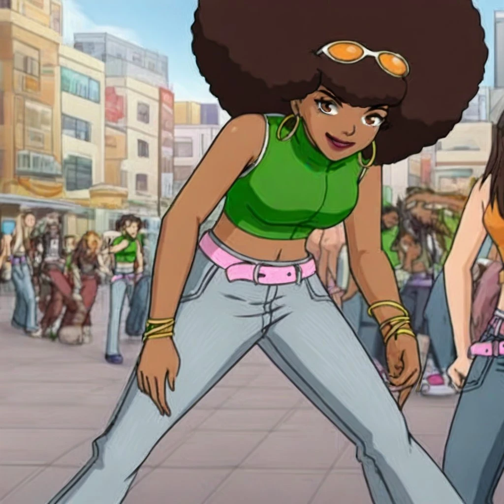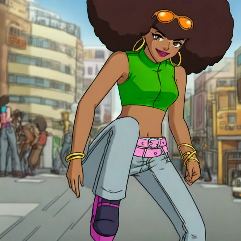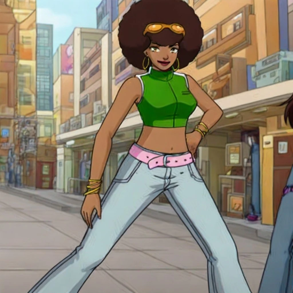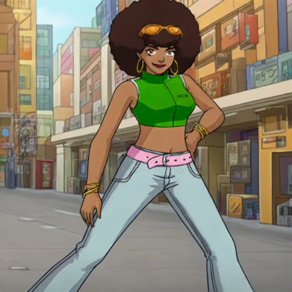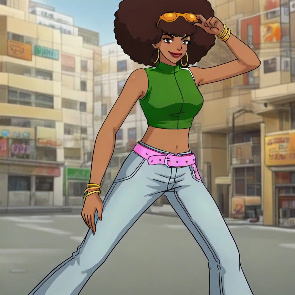 orange glasses, sunglasses on head, hoop earrings, green top crop, sleeveless, midriff, bracelets, light blue flared jeans, pink belt, dark blue platform shoes,