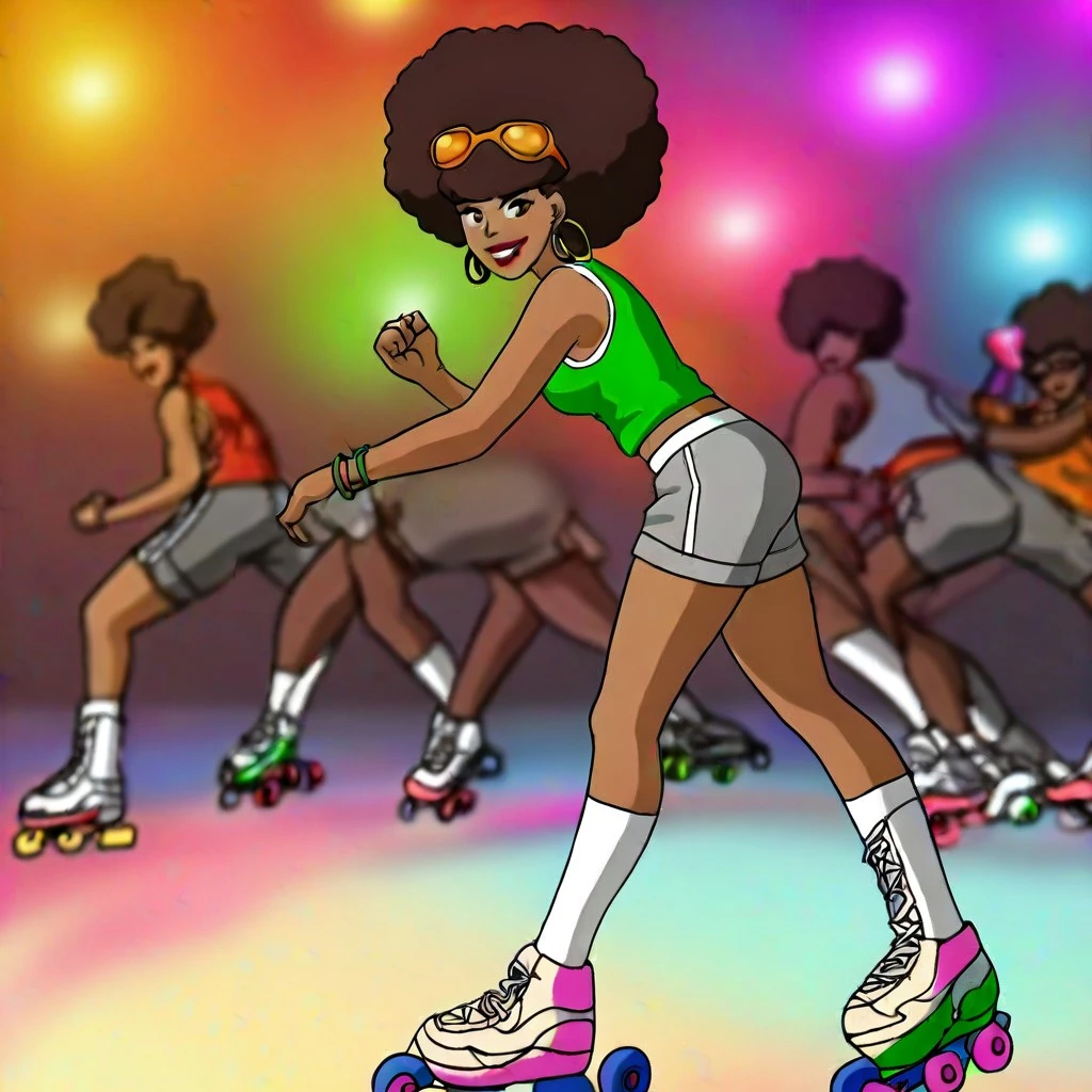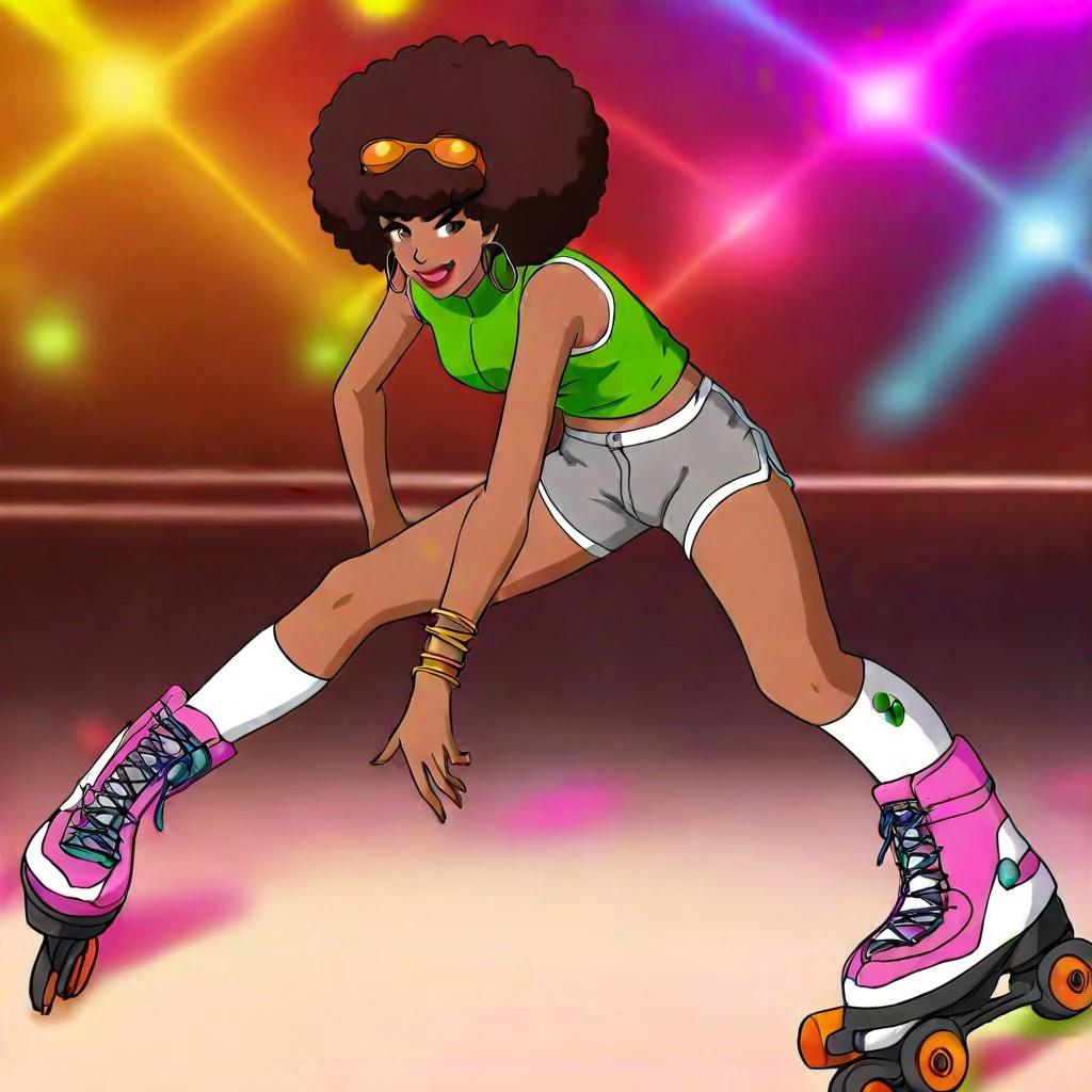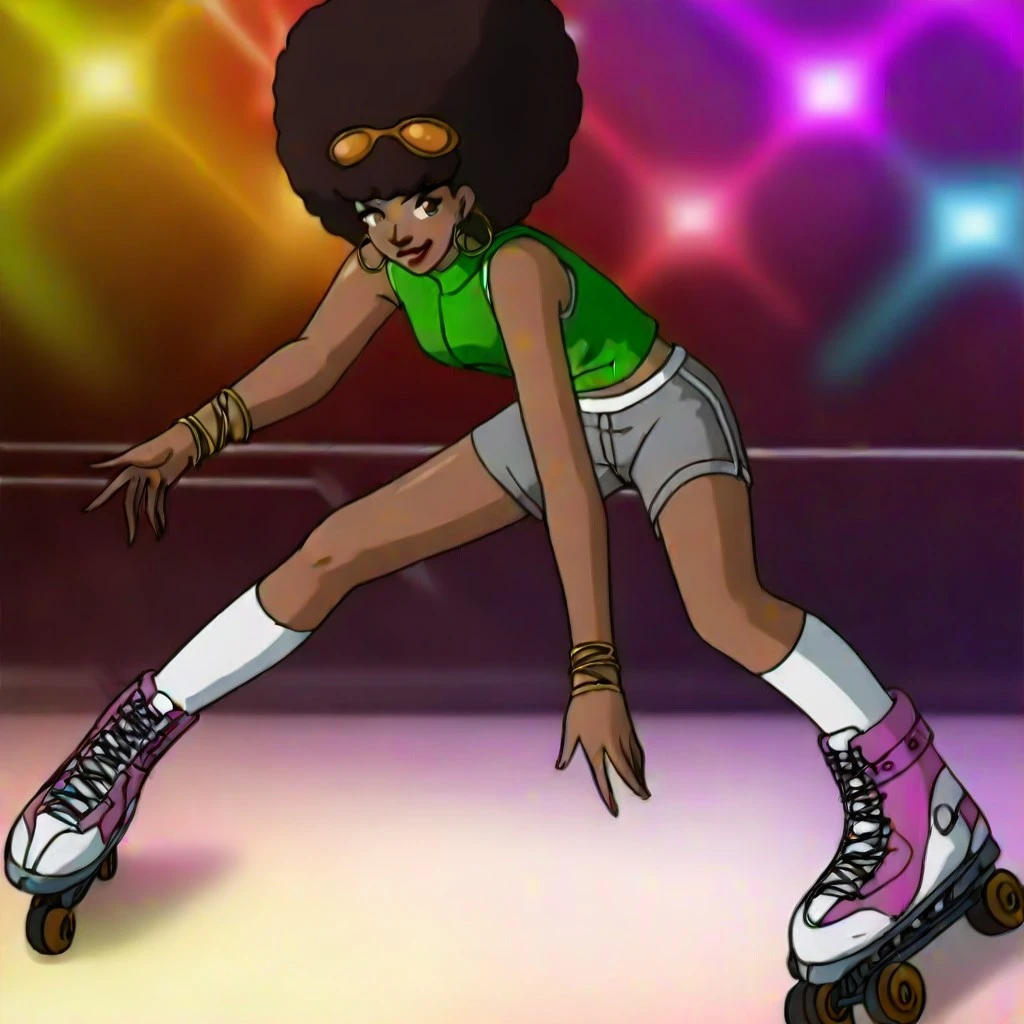 green short top, sleeveless, bracelets, grey shorts, white knee-high socks, roller skates,