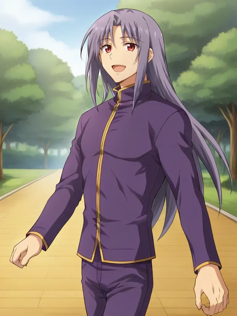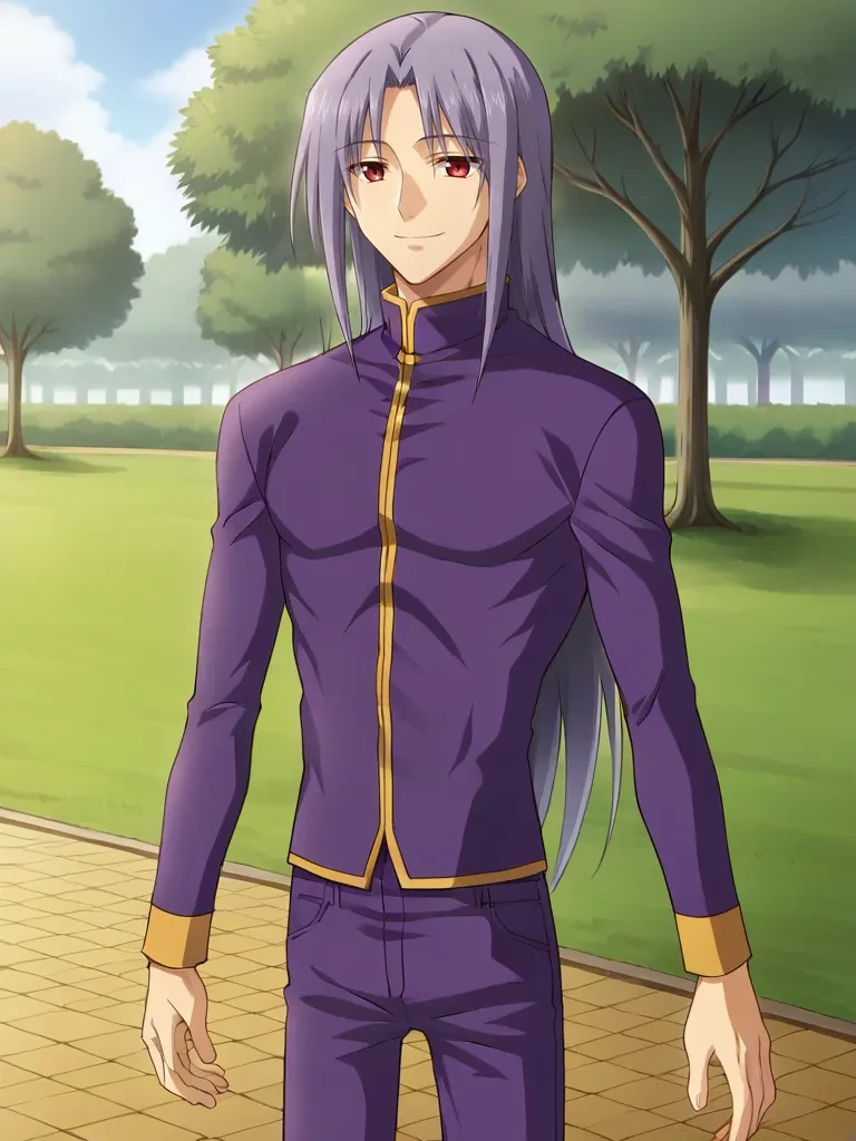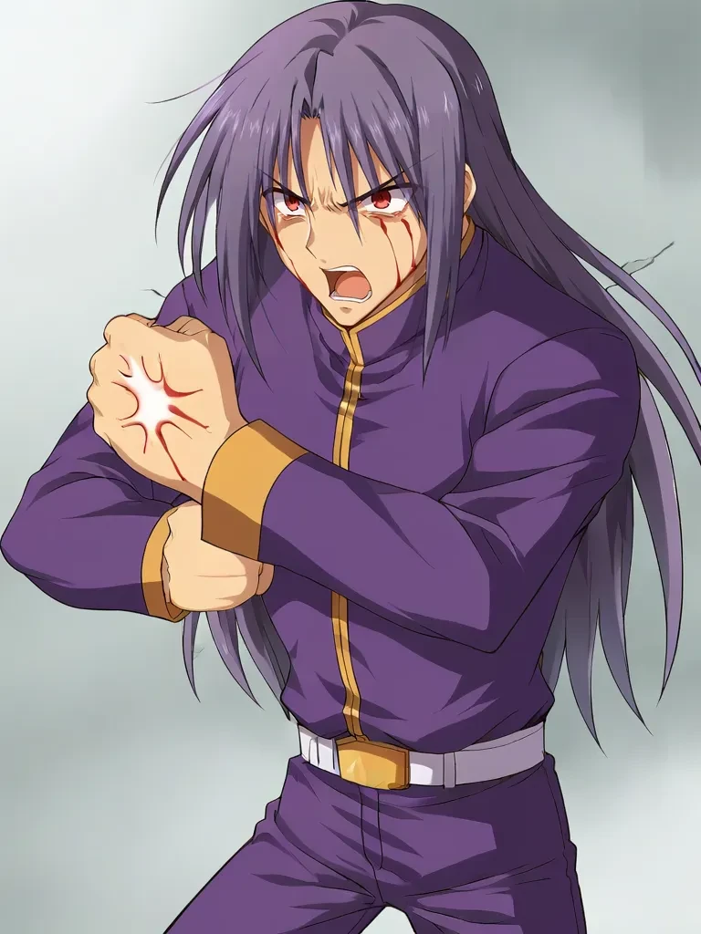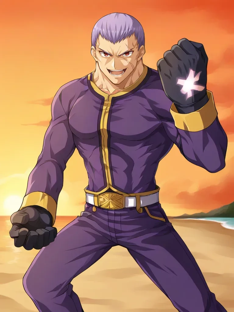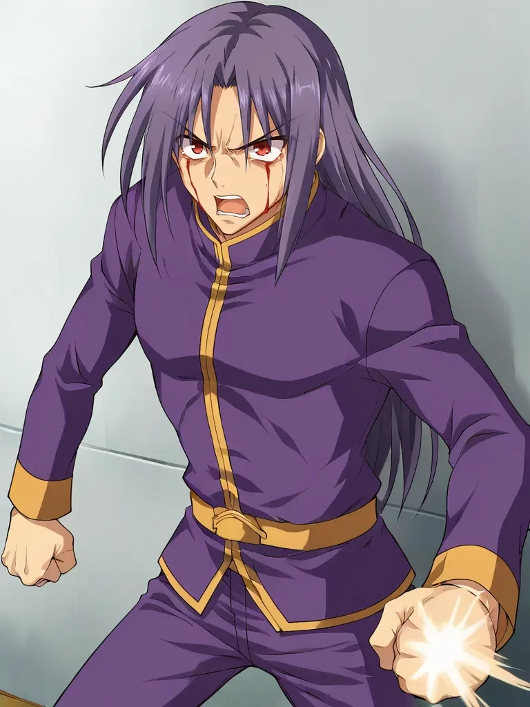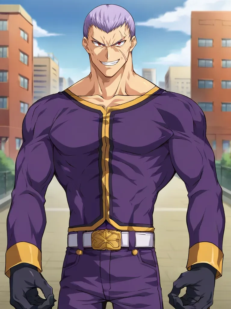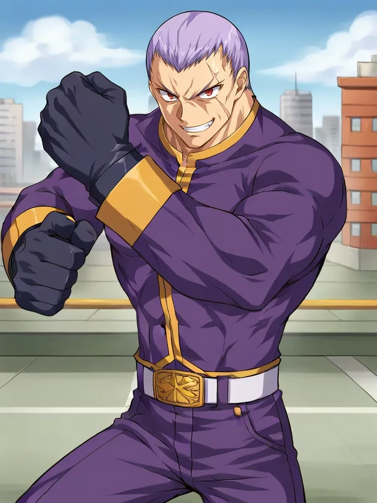 Ragou (Older): karasumaonlyyou, red eyes, scar on face, purple hair, muscular, purple shirt, long sleeves, gloves, purple pants, belt, white shoes
