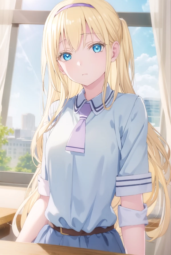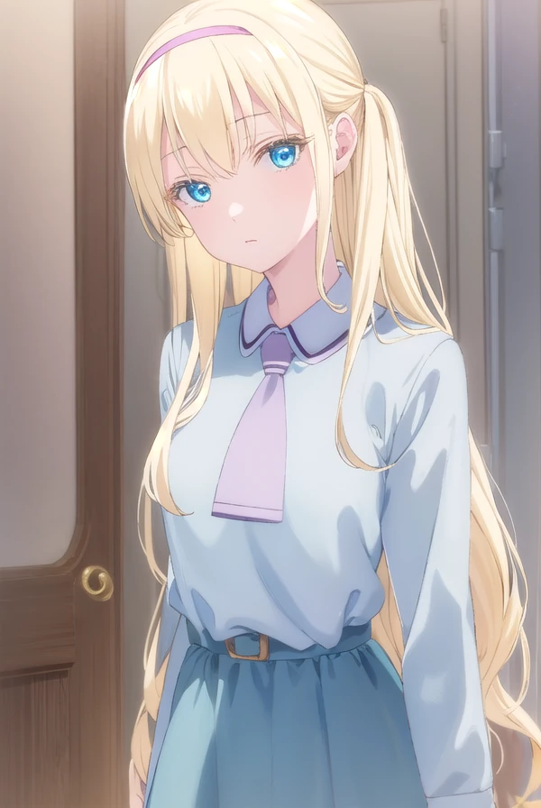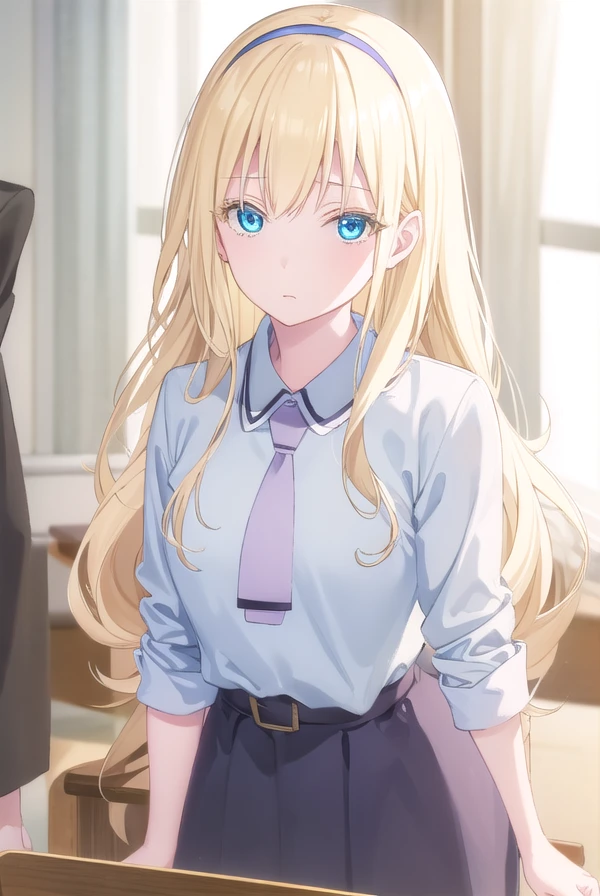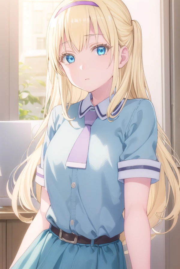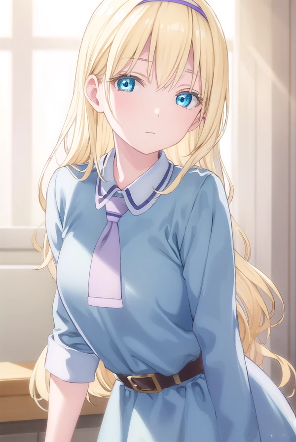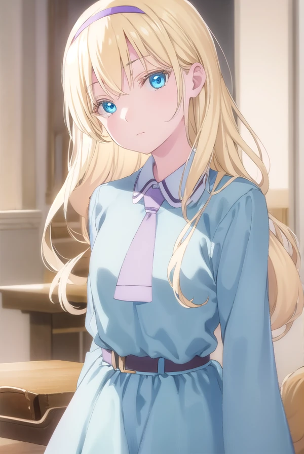 dress, school uniform, hairband, necktie, belt,