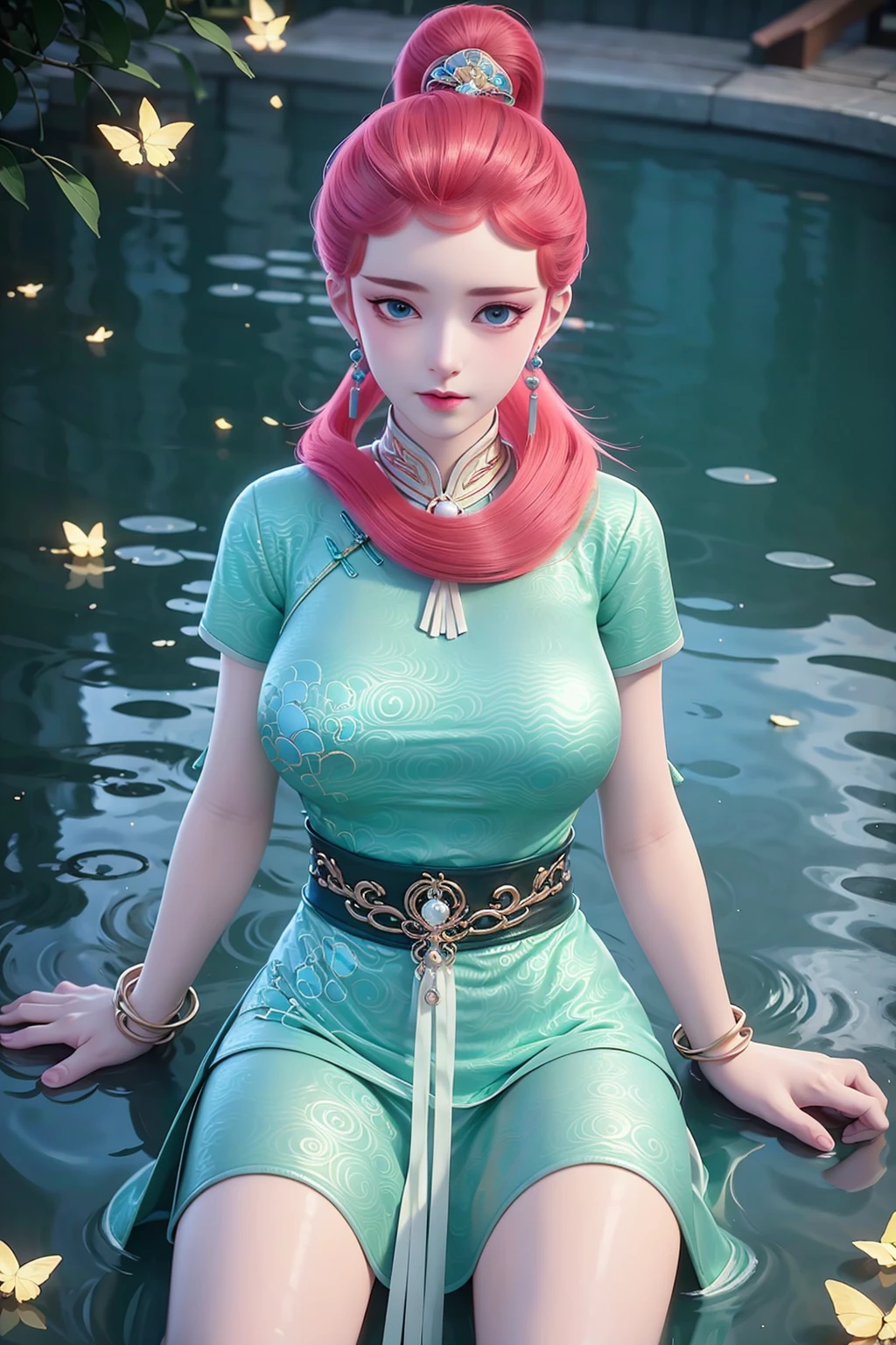 1girl, solo, long hair, breasts, dress, ponytail, pink hair, boots, see-through