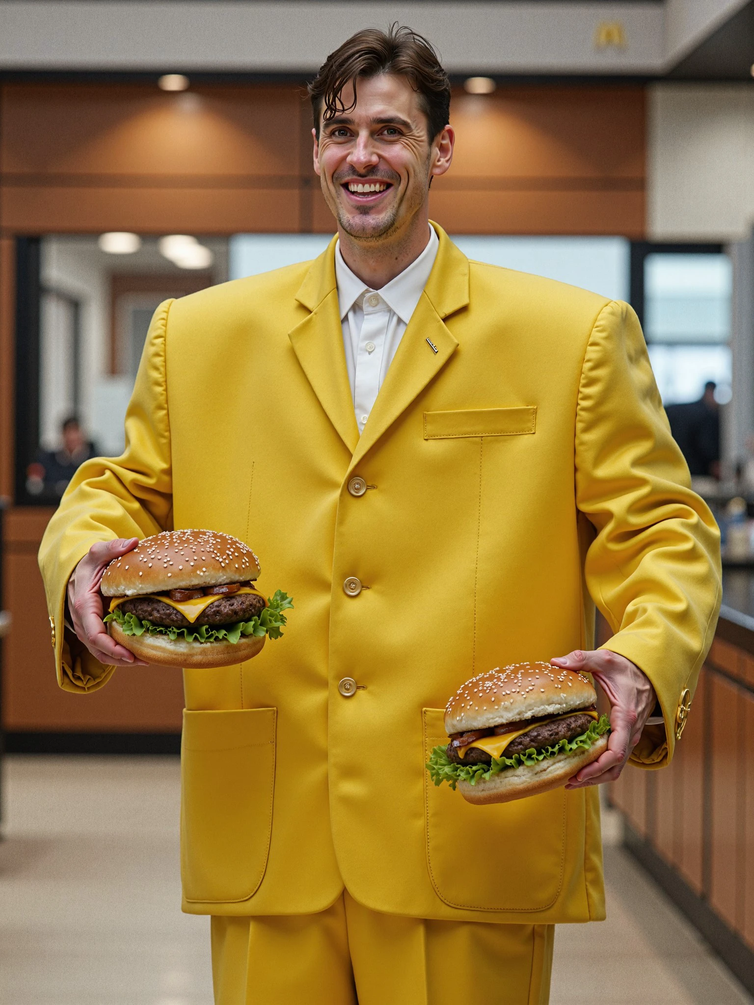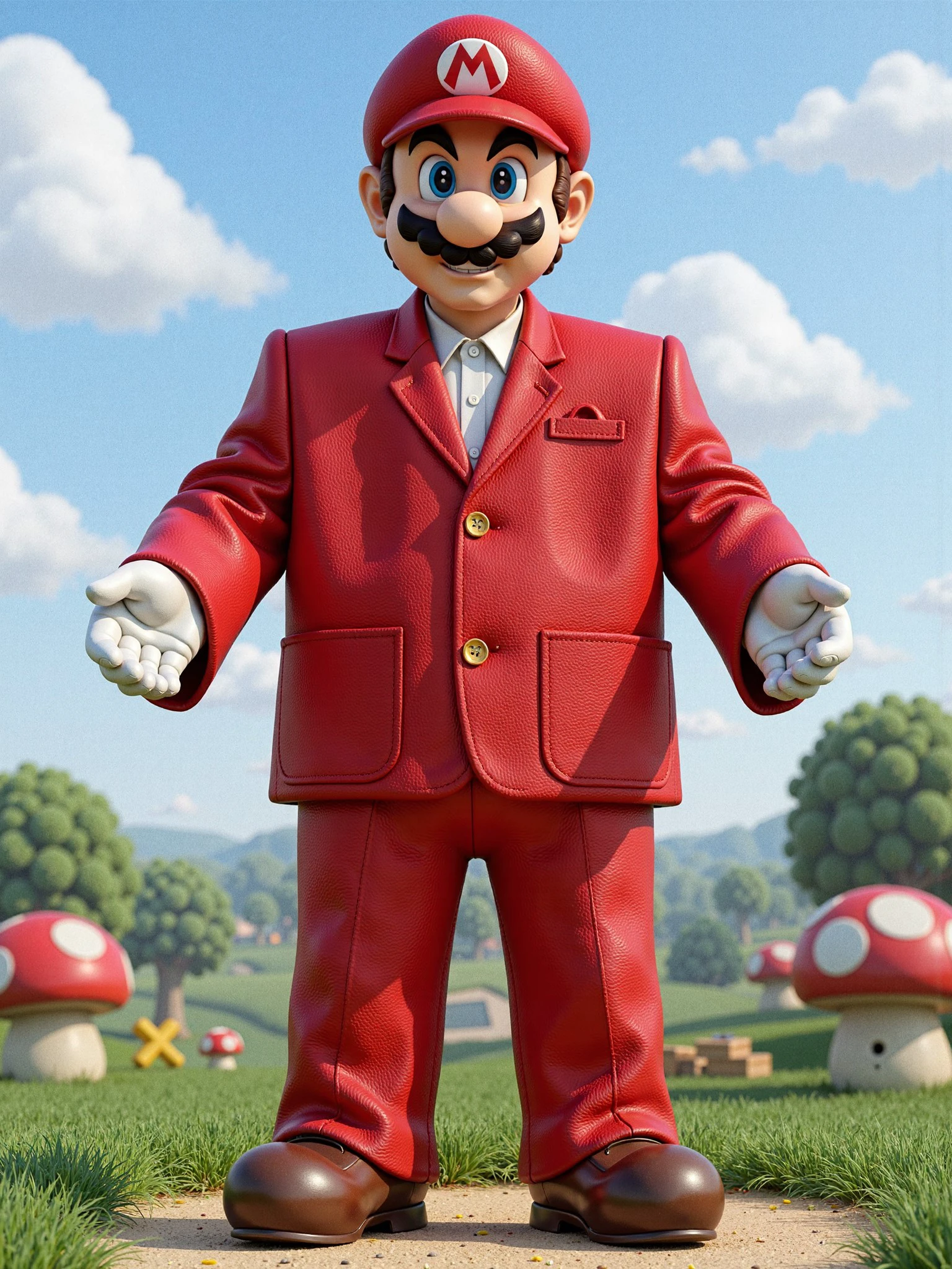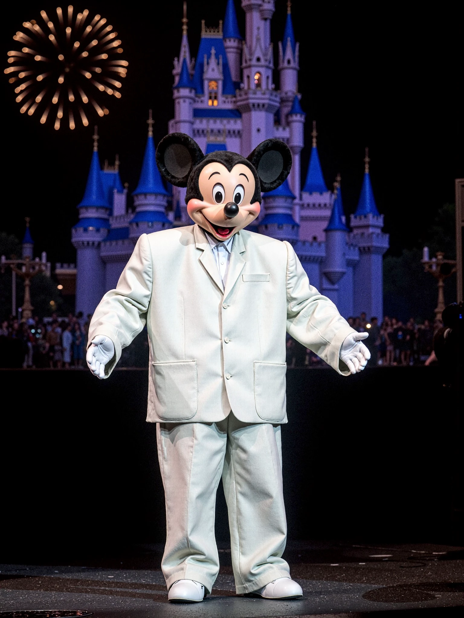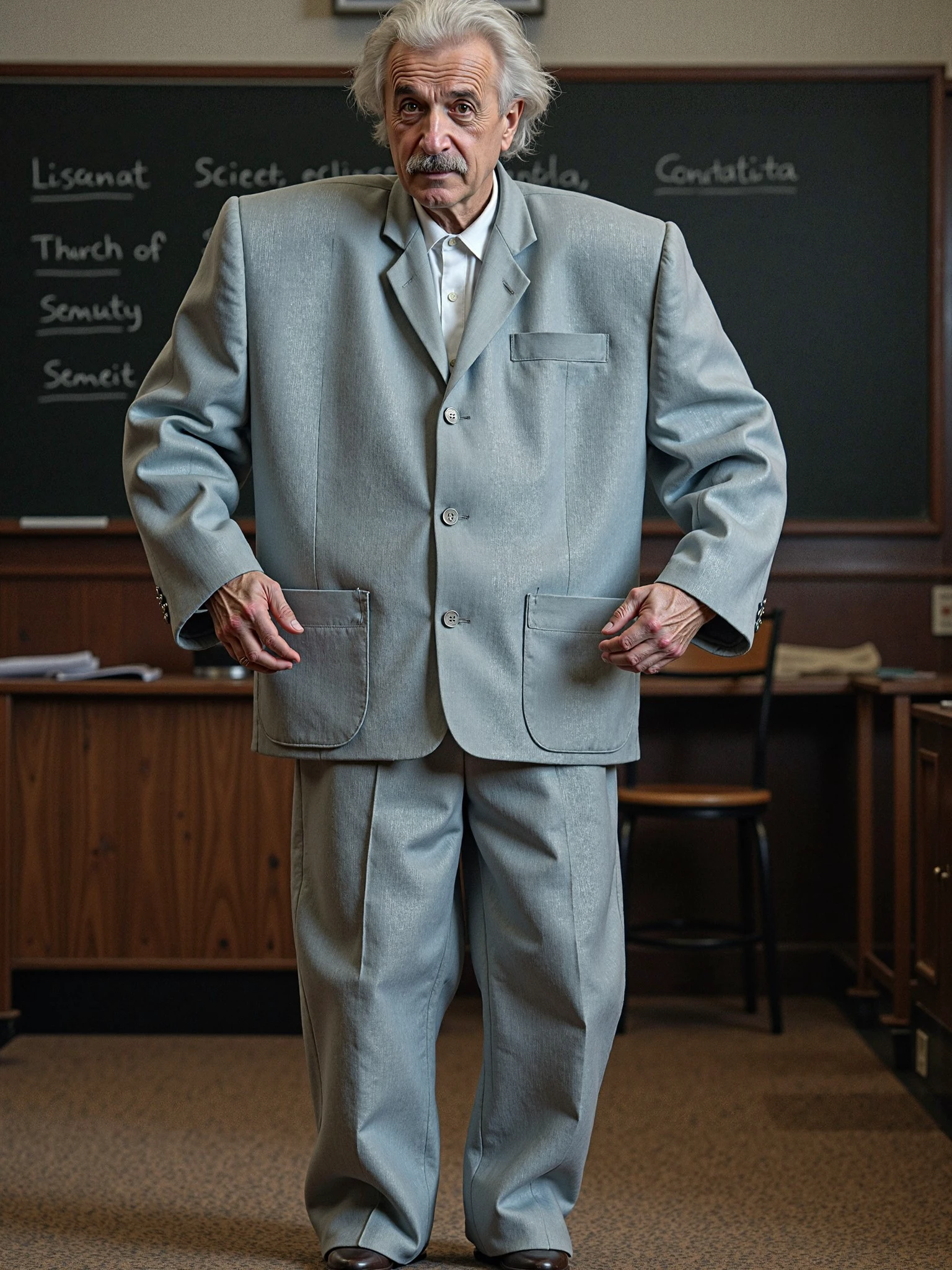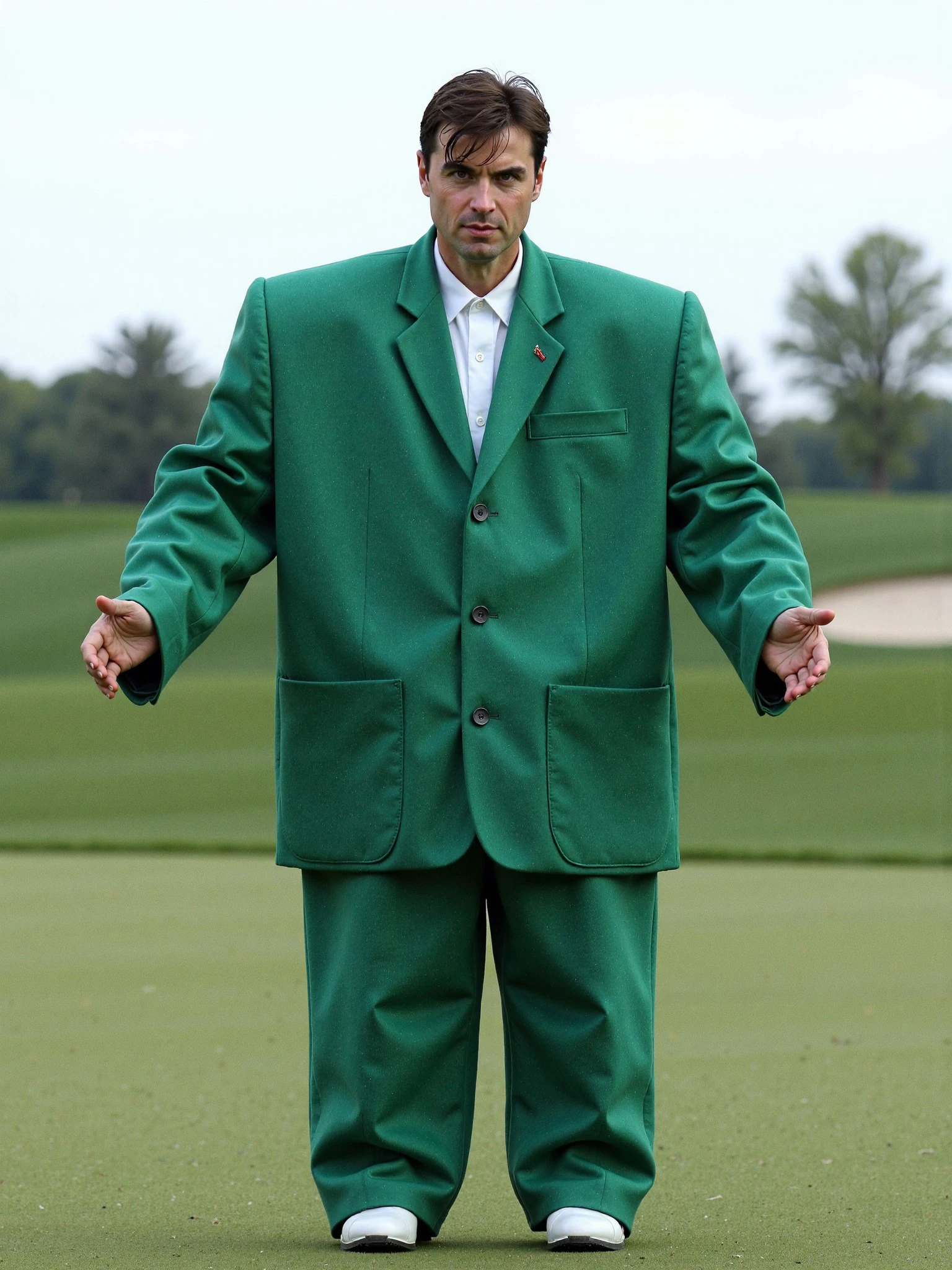 Experimental. It will sometimes render the suit not noticeably large enough. "in an oversized gray suit" is the prompt used for the actual photos of the suit, so use that if you want the suit he wore, but any color works while sticking with the style of the suit.