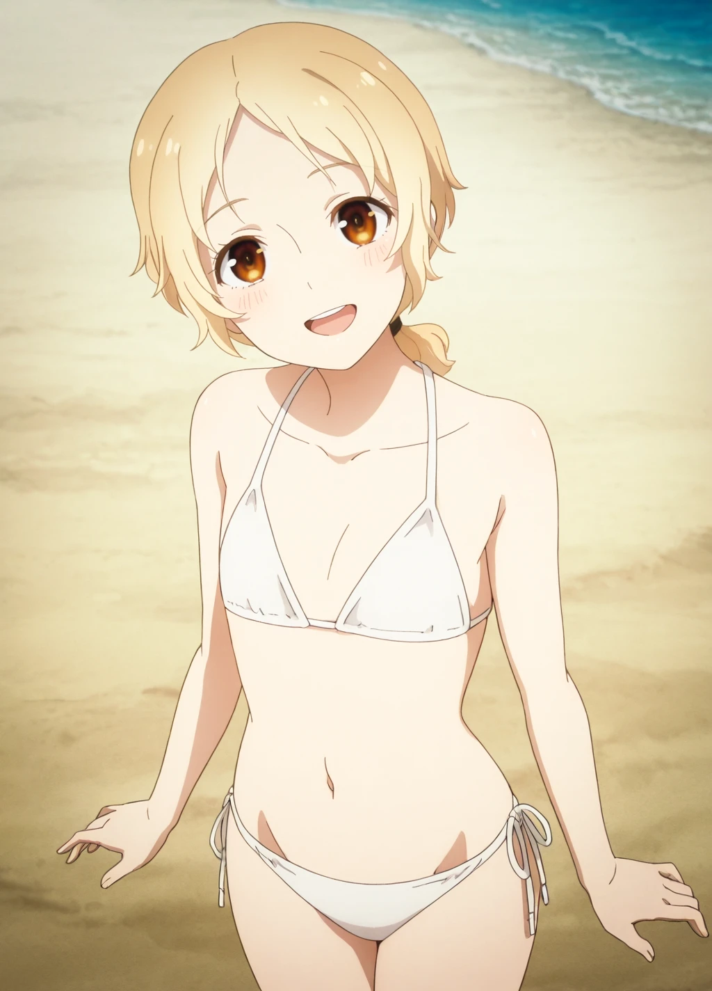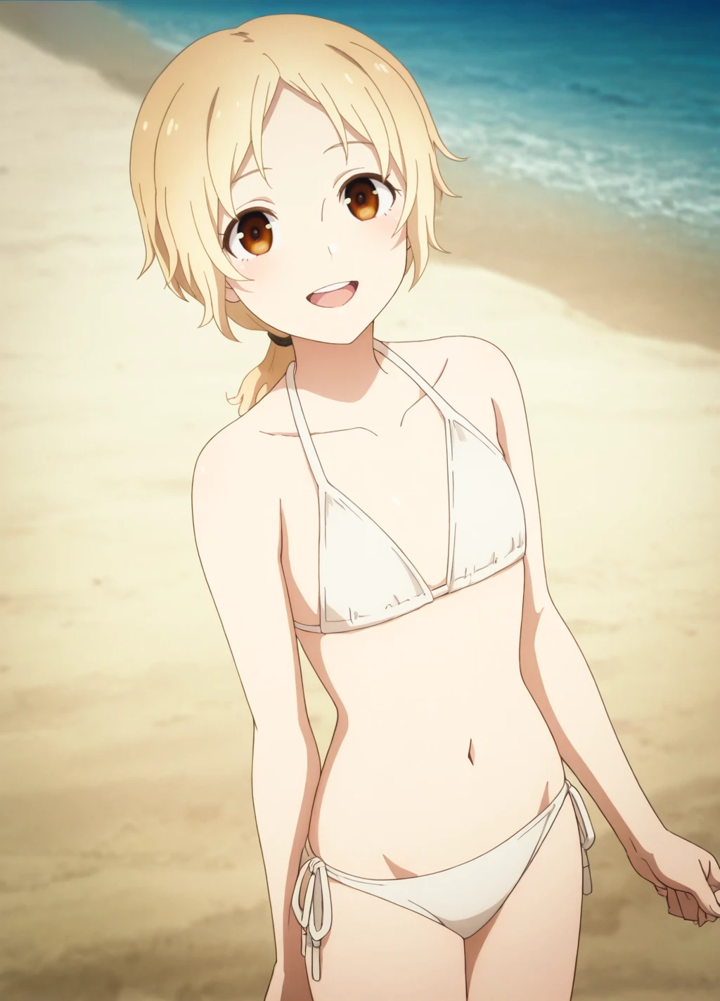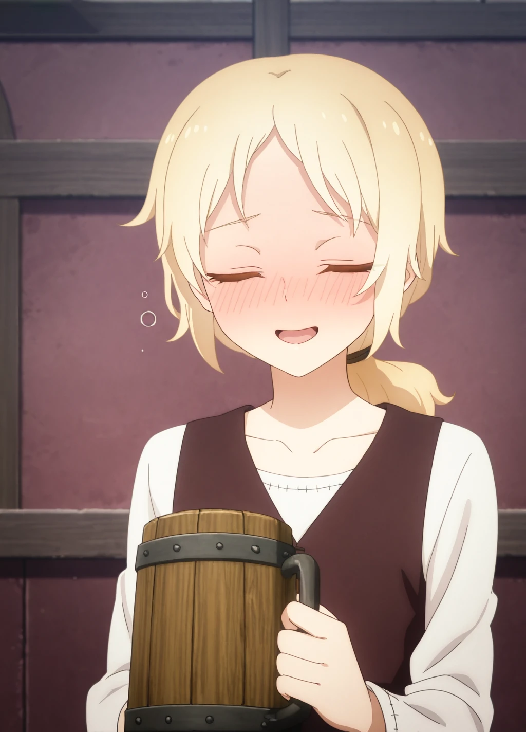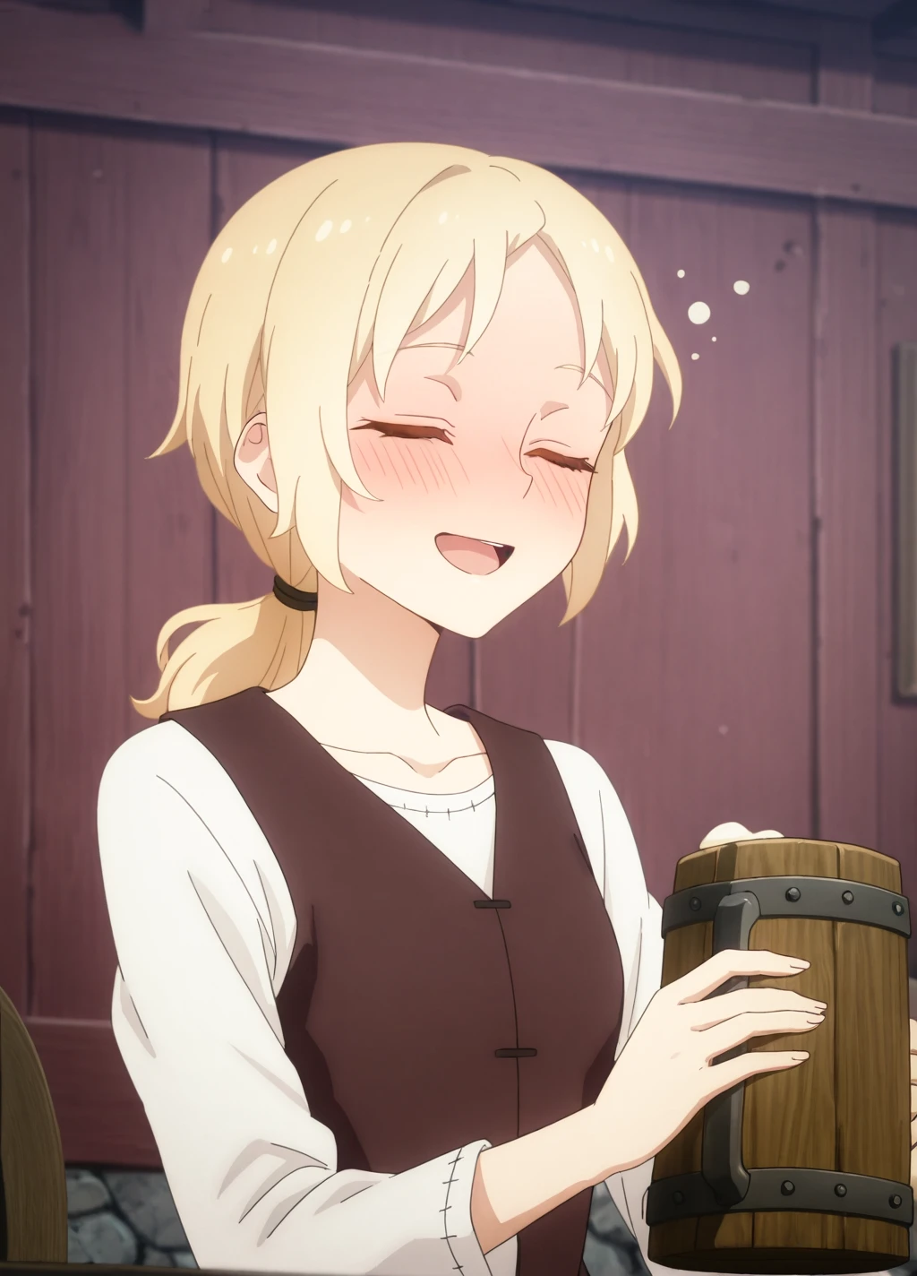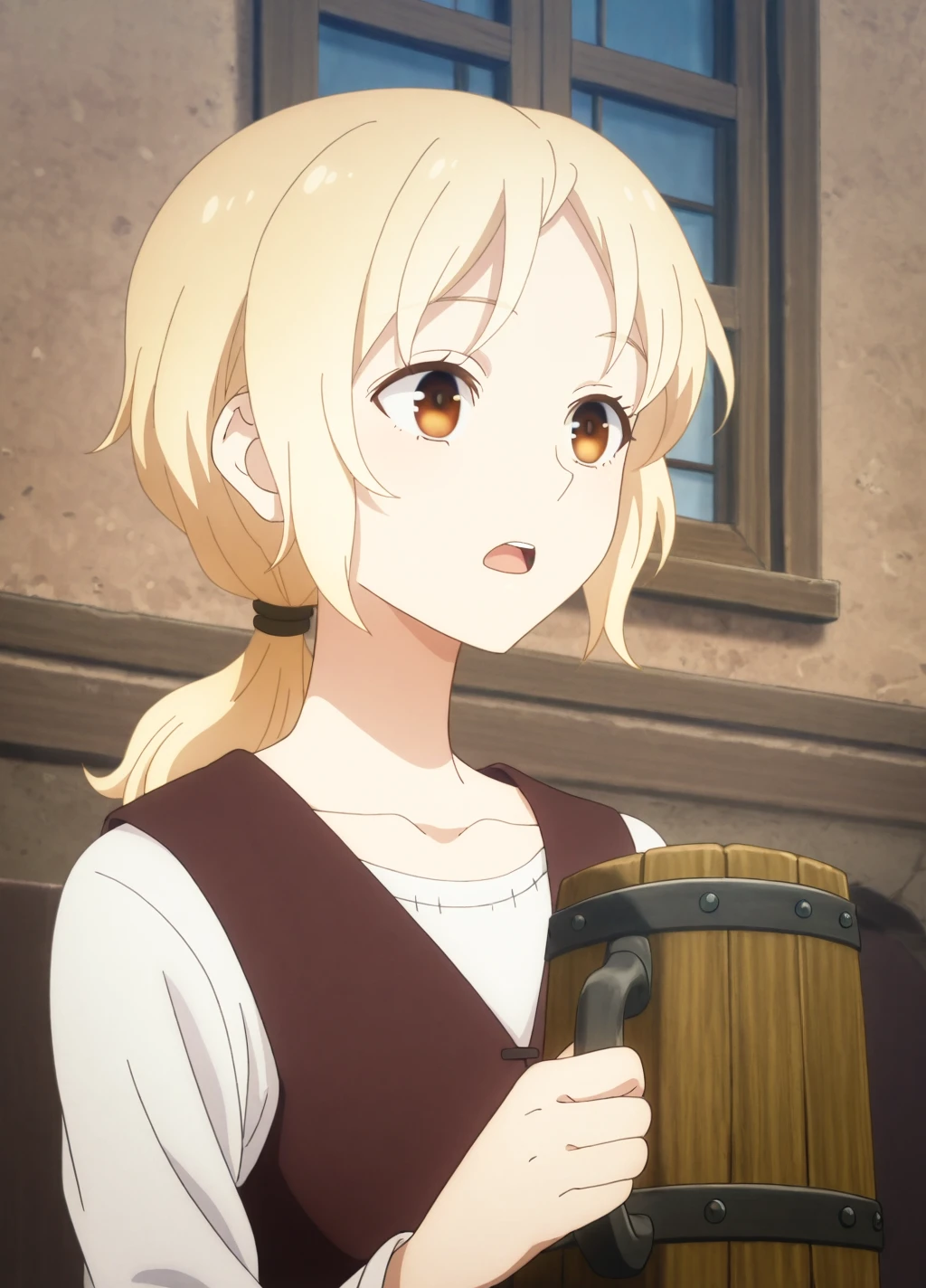 nora2, 1girl,brown eyes, blonde hair,short hair,vest,shirt, white shirt, low ponytail,