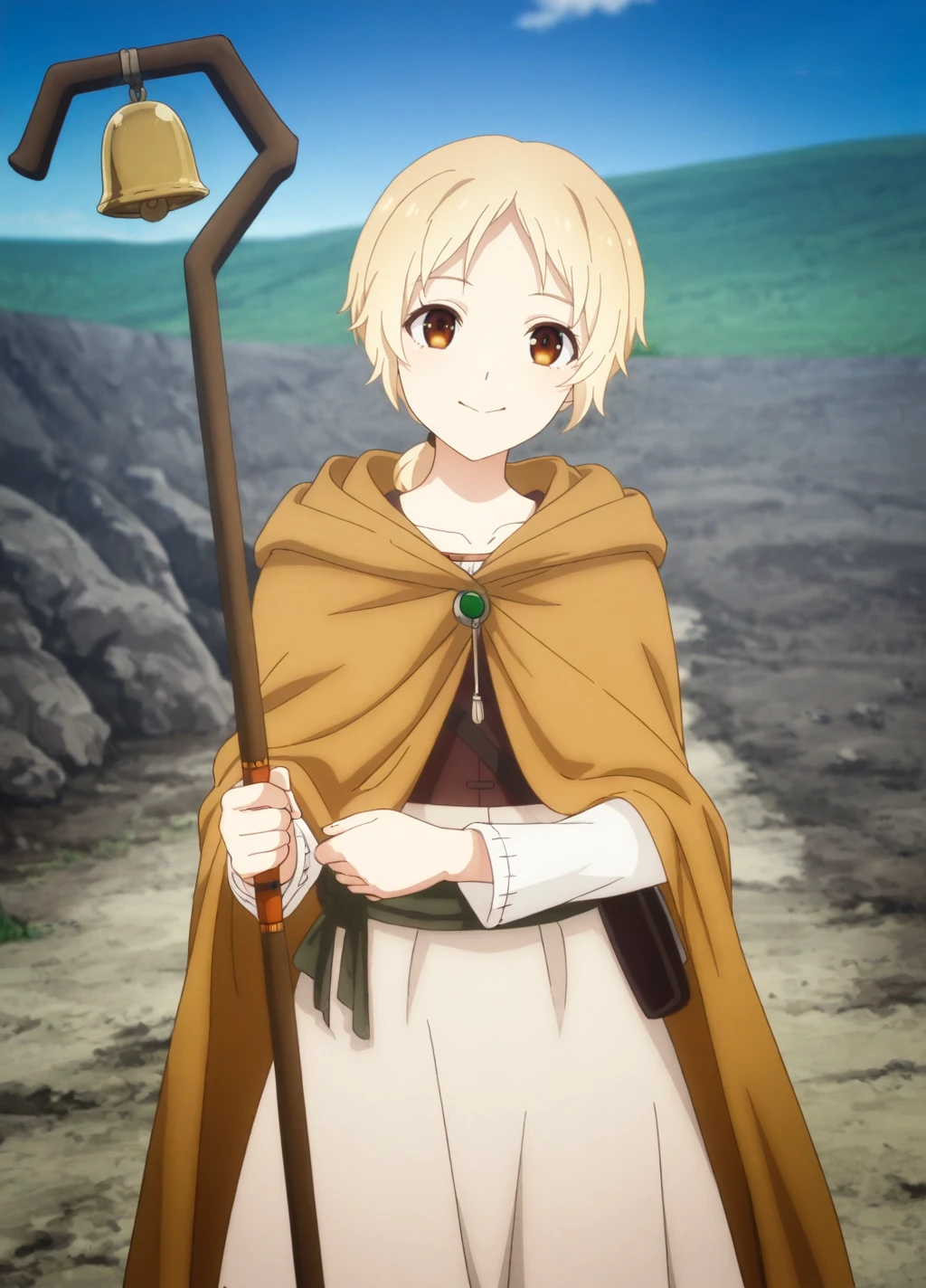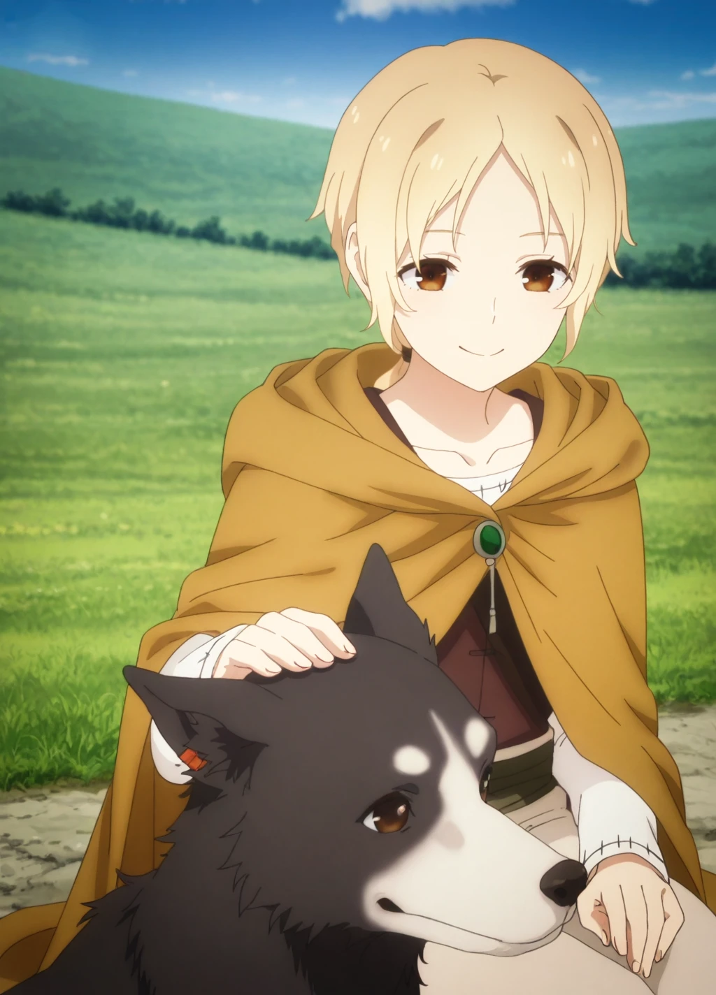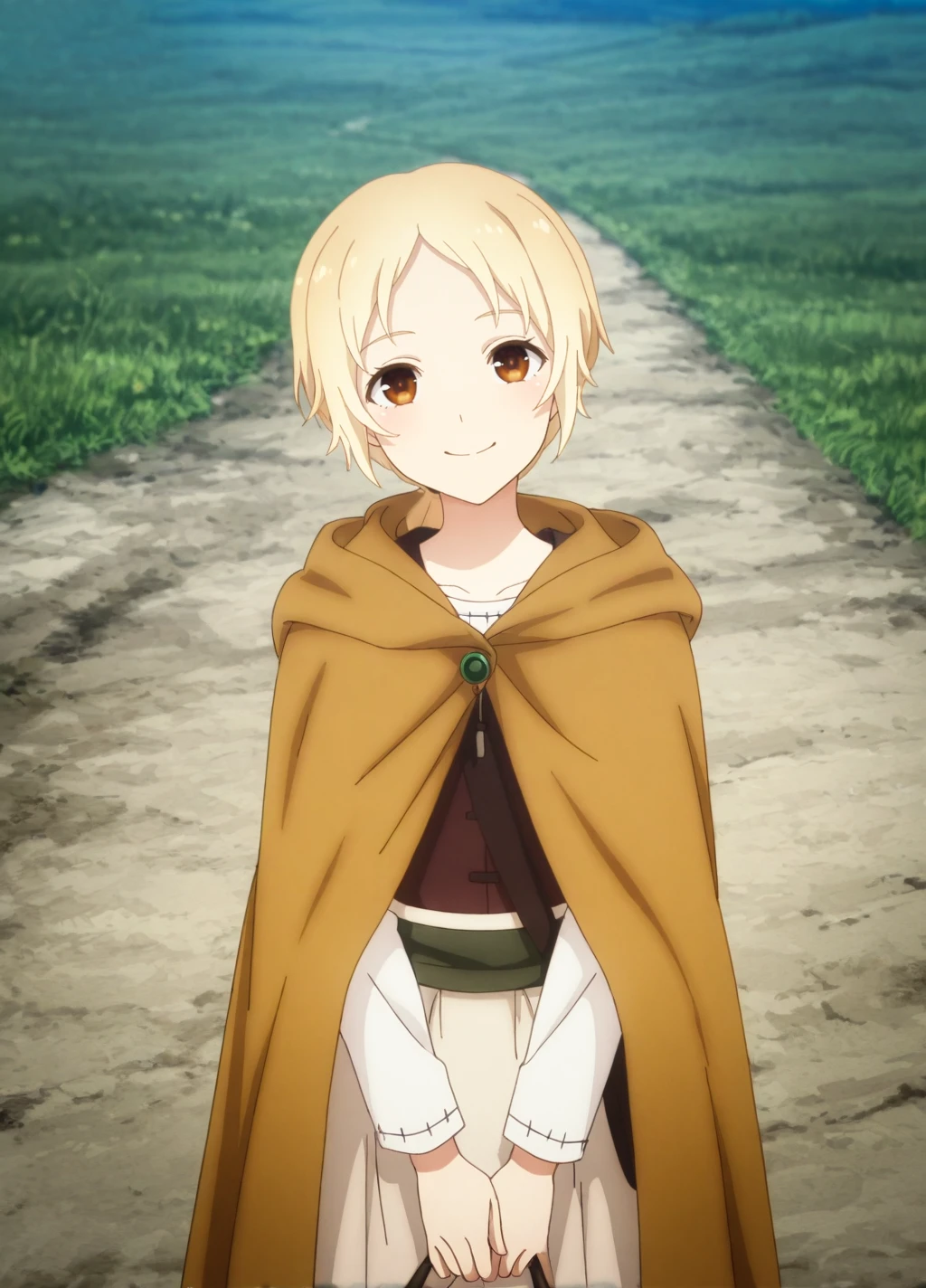 nora1, 1girl, brown eyes, short hair, blonde hair,cloak,long sleeves,low ponytail