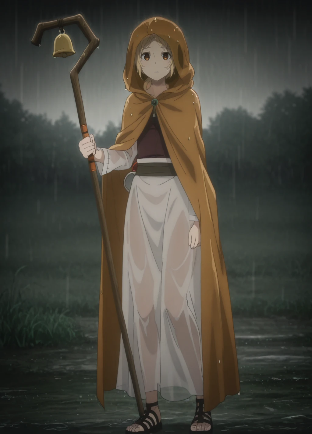 nora3, 1girl, hood, cloak, blonde hair, rain,short hair, brown eyes,hooded cloak,rain, dark theme,