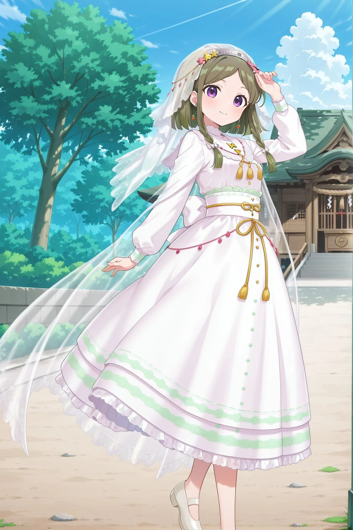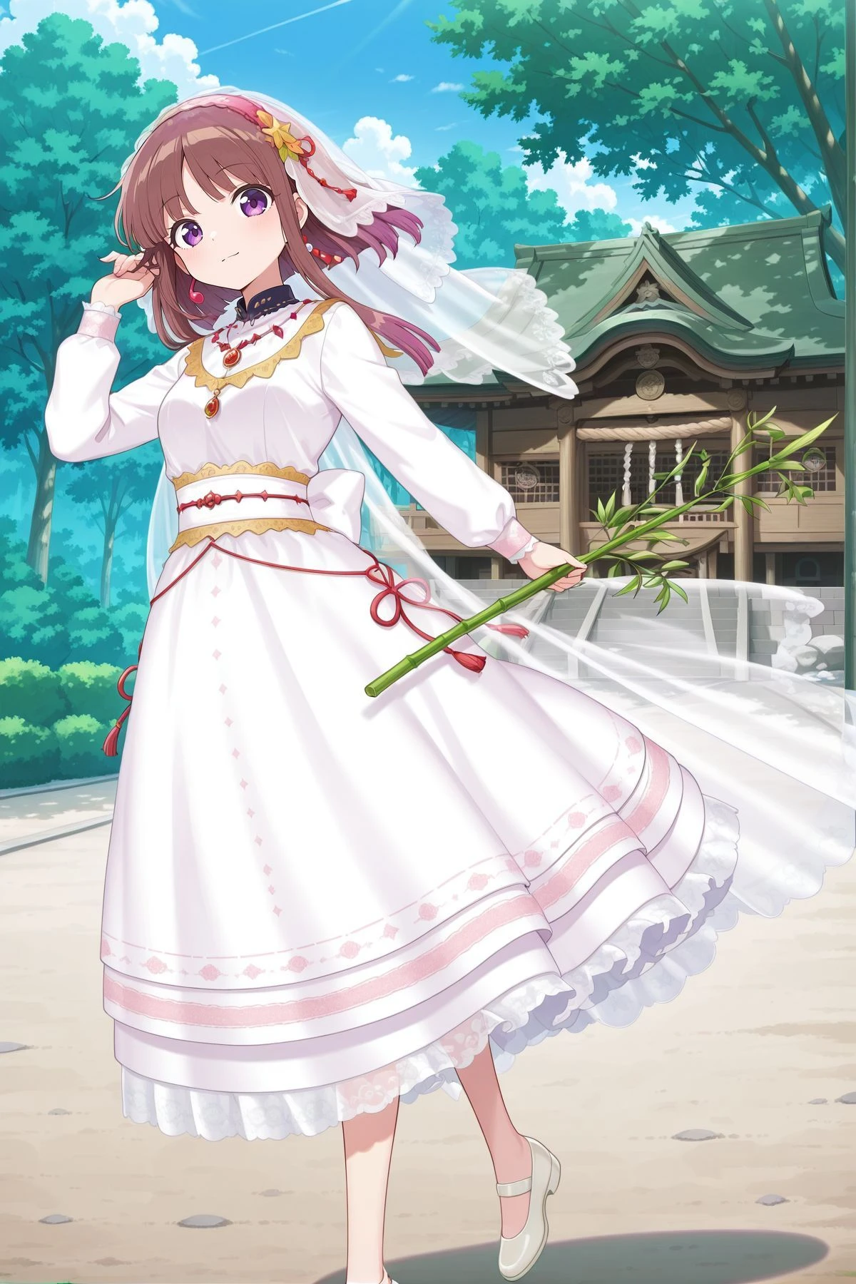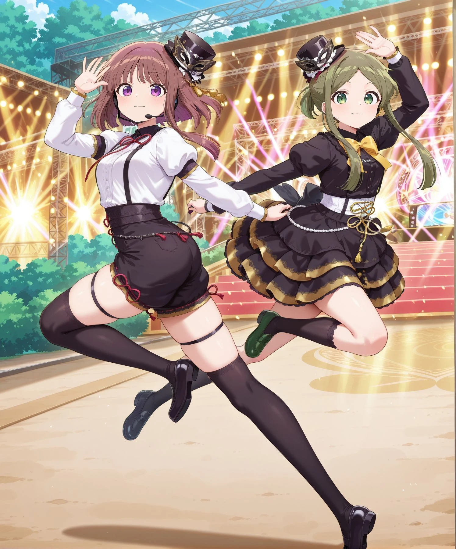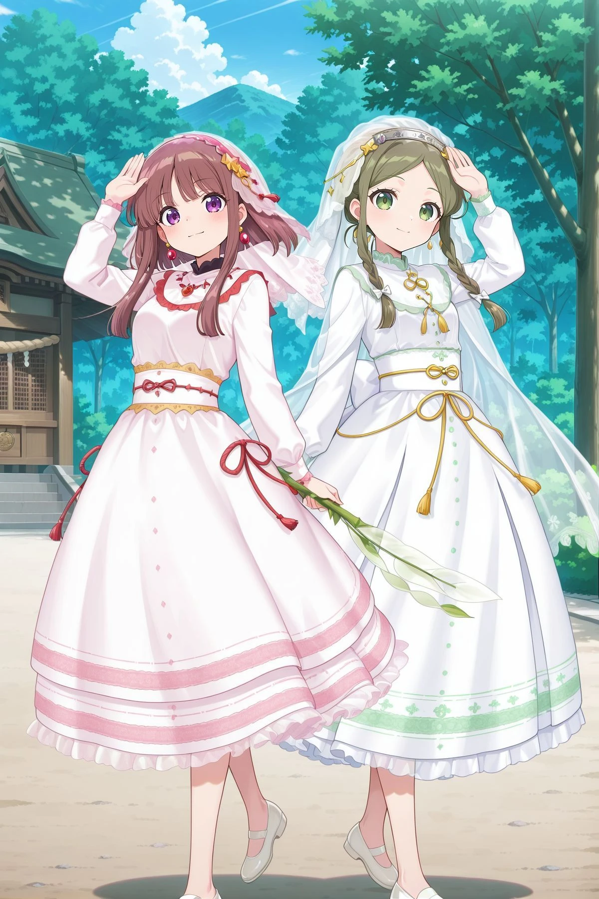 nishida satono, 1girl, solo, purple eyes, brown hair, short hair with long locks,, nishida satono \(white ginger nishita-douji\), alternate costume, bridal veil, hair ornament, pink hairband, earrings, see-through cape, necklace, pendant, white dress, wedding dress, long sleeves, white sash, gold trims, white skirt, white shoes,nishida satono, 1girl, solo, purple eyes, brown hair, short hair with long locks,, nishida satono \(the all-too-dark backup dancers\), alternate costume, alternate headwear, black hat, top hat, mask on hat, headset, red neck ribbon, white shirt, long sleeves, juliet sleeves, black suspenders, pearl belt, black shorts, black thighhighs, thigh strap, black shoes,Description