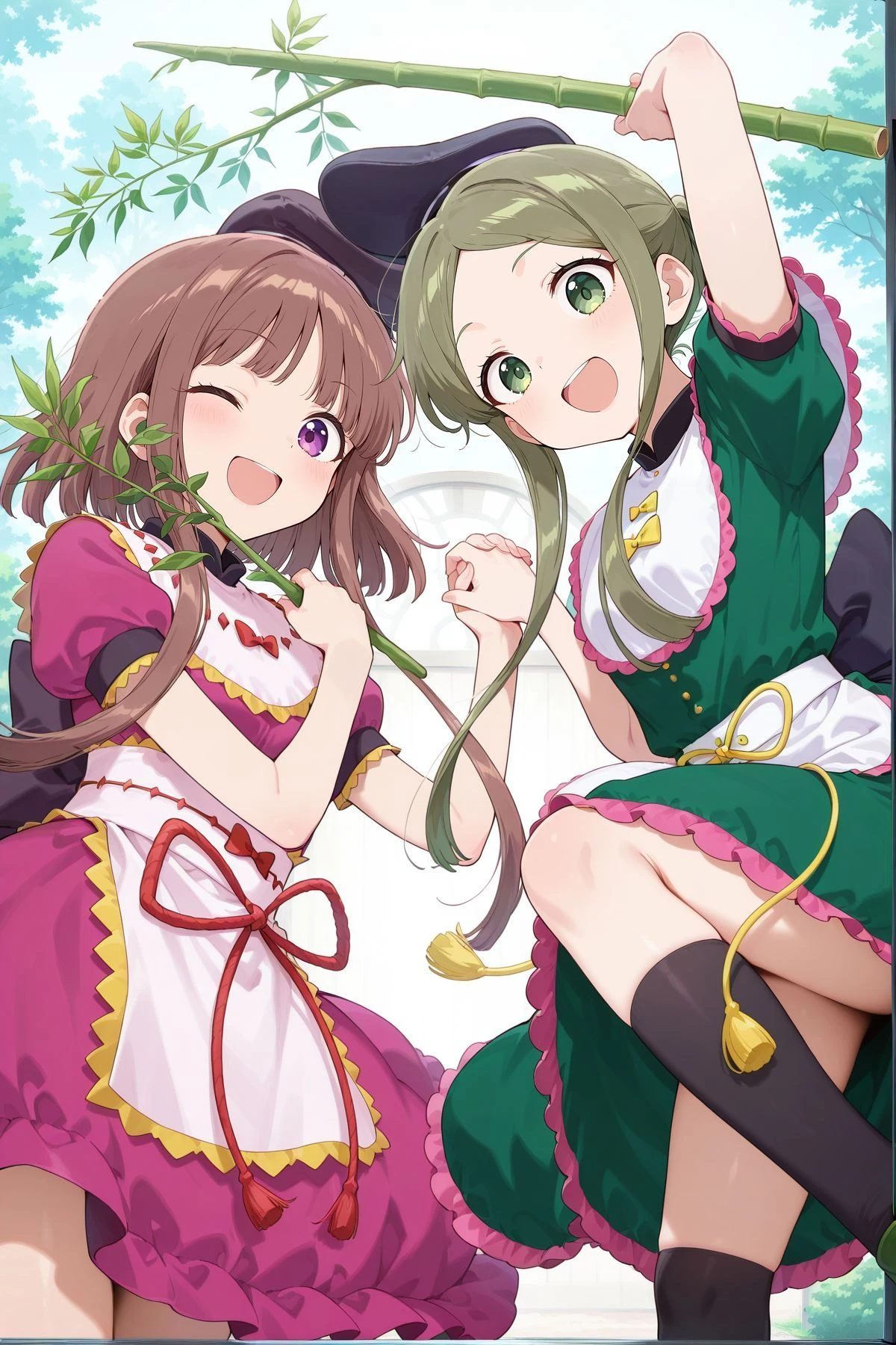 teireida mai, 1girl, solo, green eyes, green hair, long hair, twin braids,, teireida mai \(white bamboo teireita-douji\), alternate costume, bridal veil, hair ornament, hat ornament, silver hairband, earrings, see-through cape, white dress, wedding dress, long sleeves, green trims, white sash, gold trims, white skirt, white shoes, holding bamboo,teireida mai, 1girl, solo, green eyes, green hair, short hair with long locks, teireida mai \(the all-too-dark backup dancers\), alternate costume, alternate headwear, black hat, top hat, mask on hat, headset, yellow bowtie, collared shirt, black shirt, long sleeves, juliet sleeves, black suspenders, white corset, pearl belt, two-tone skirt, black skirt, gold skirt, kneehighs, black shoes,Satono Nishida :
