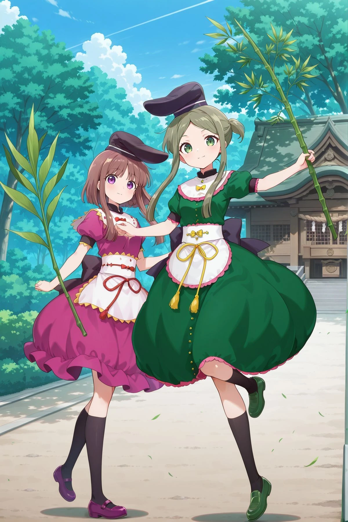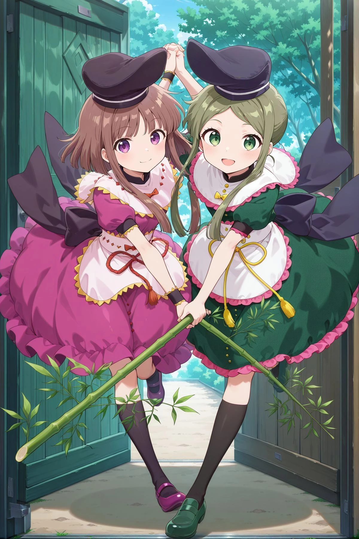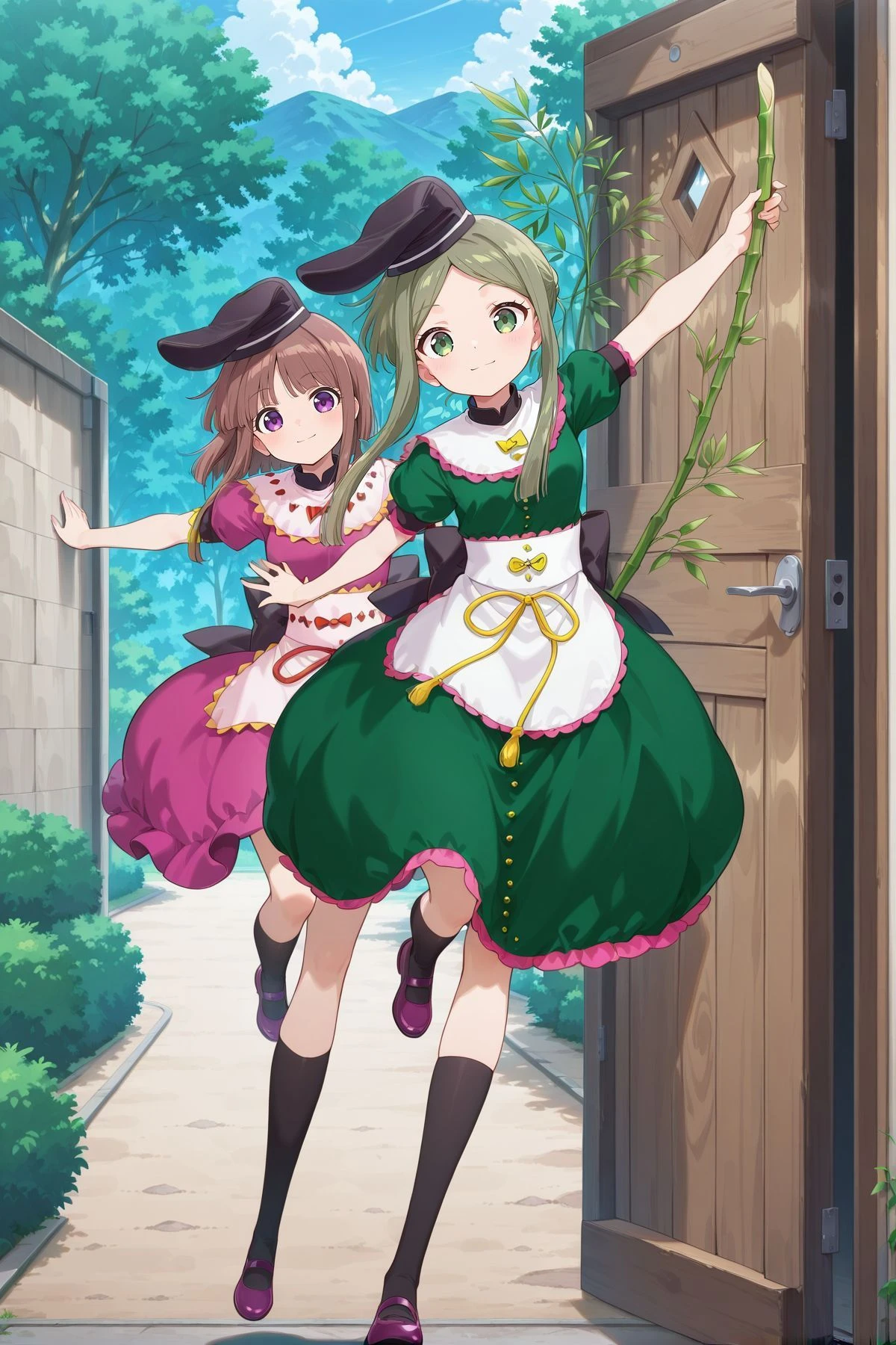 black hat, tate eboshi, green dress, puffy short sleeves, yellow bowtie, buttons, white apron, yellow ribbon, back bow, black bow, black socks, green shoes,