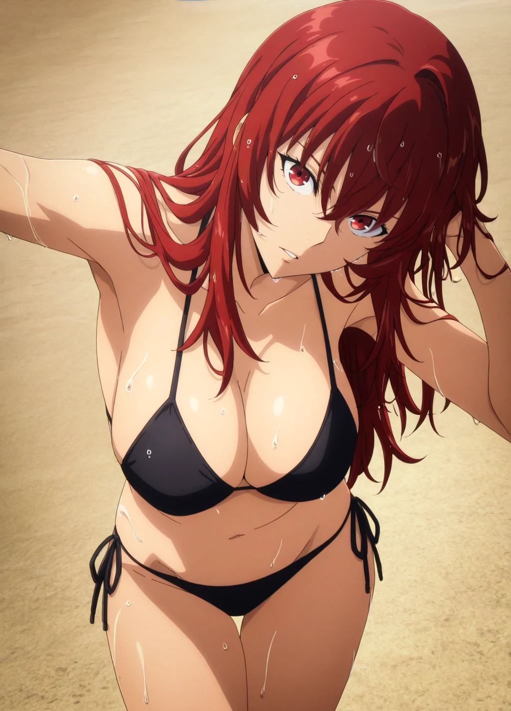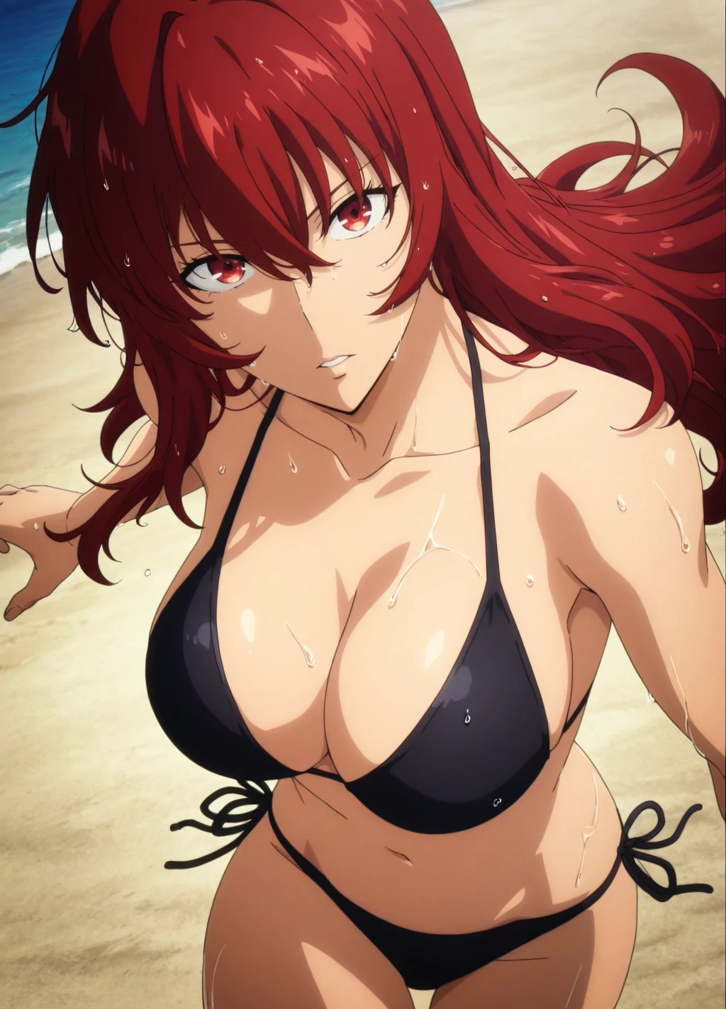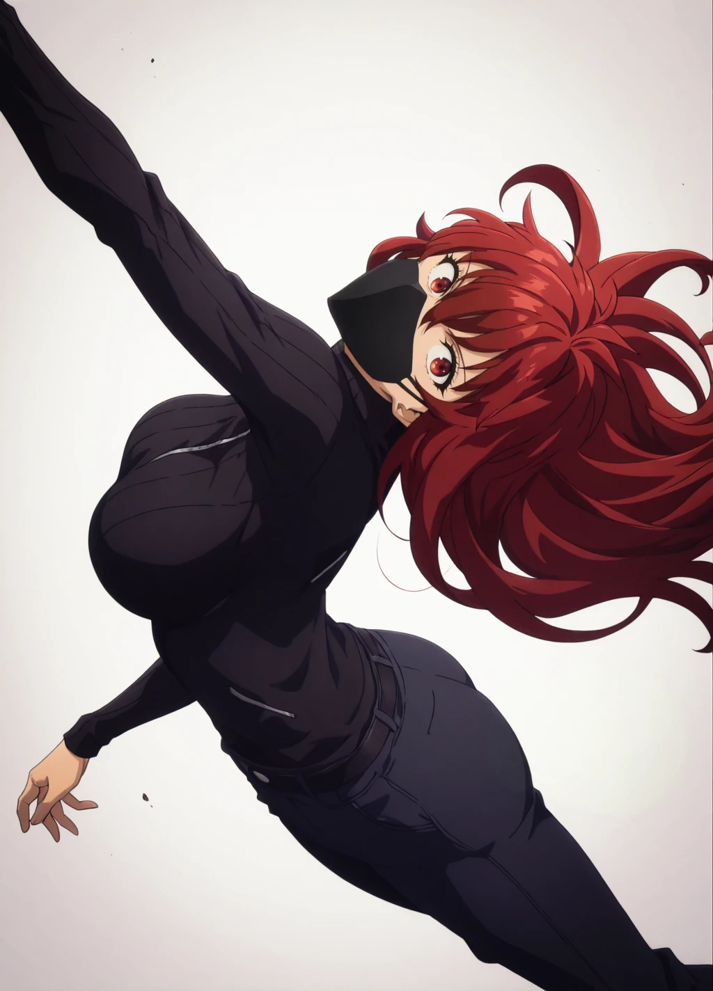 miho1, 1girl, solo, long hair, red hair, armor, bodysuit, breasts, red eyes,large breasts, hair between eyes, shoulder armor,gauntlets,hair ornament