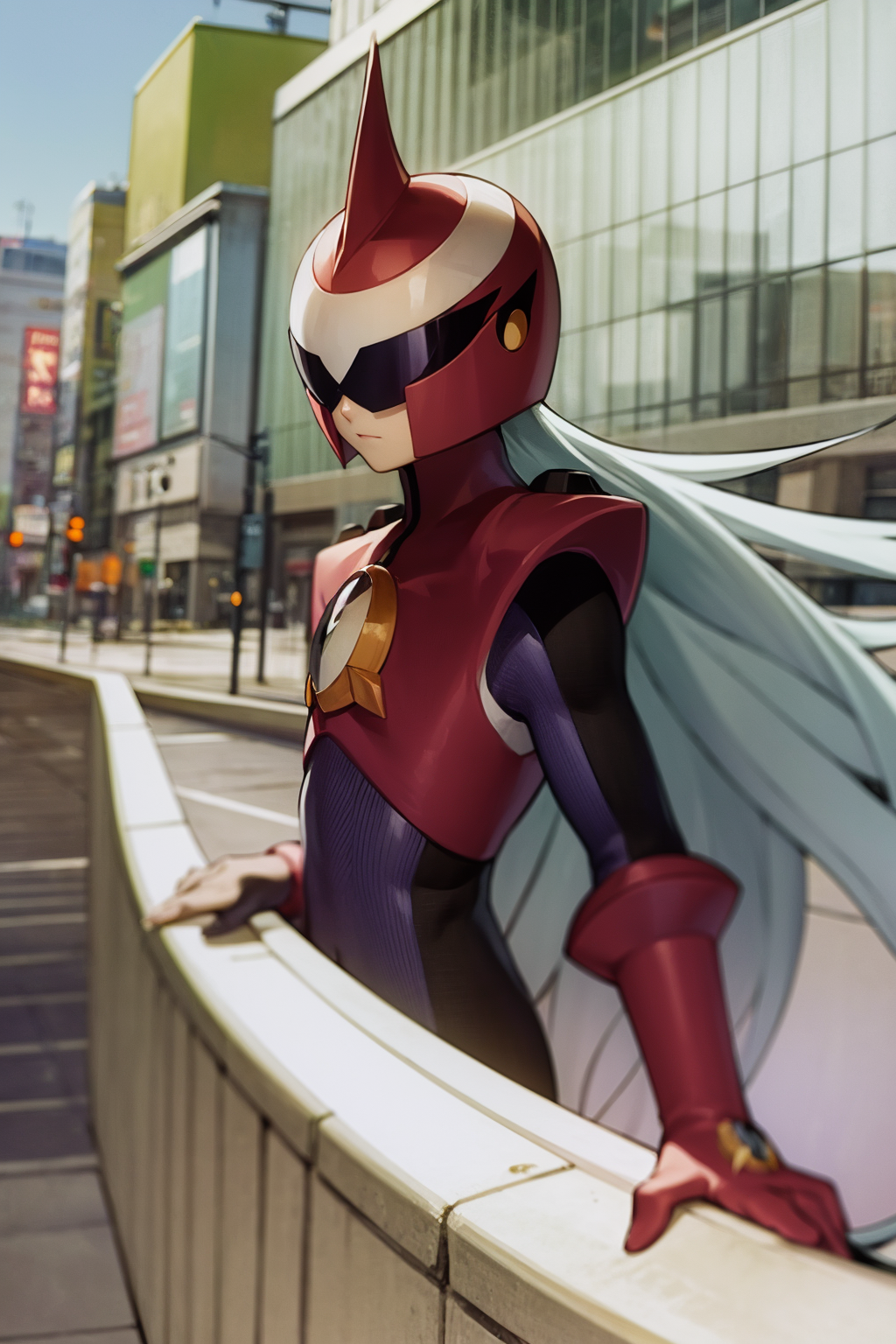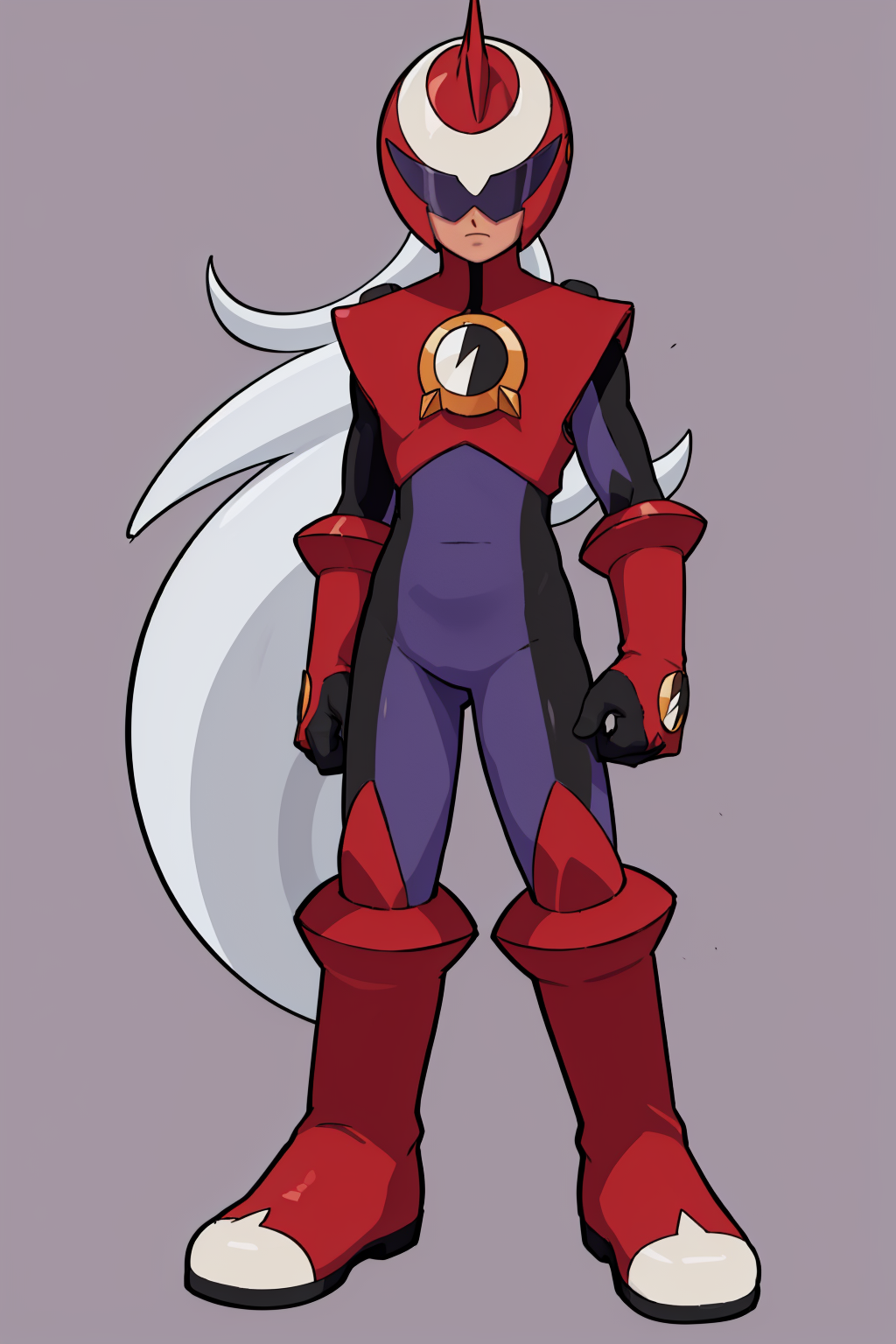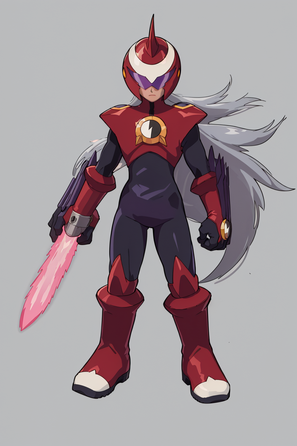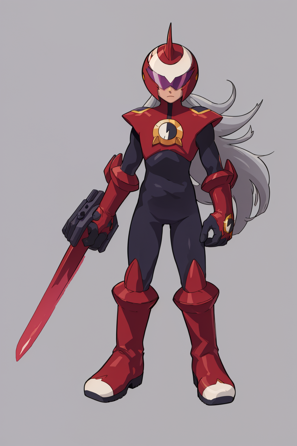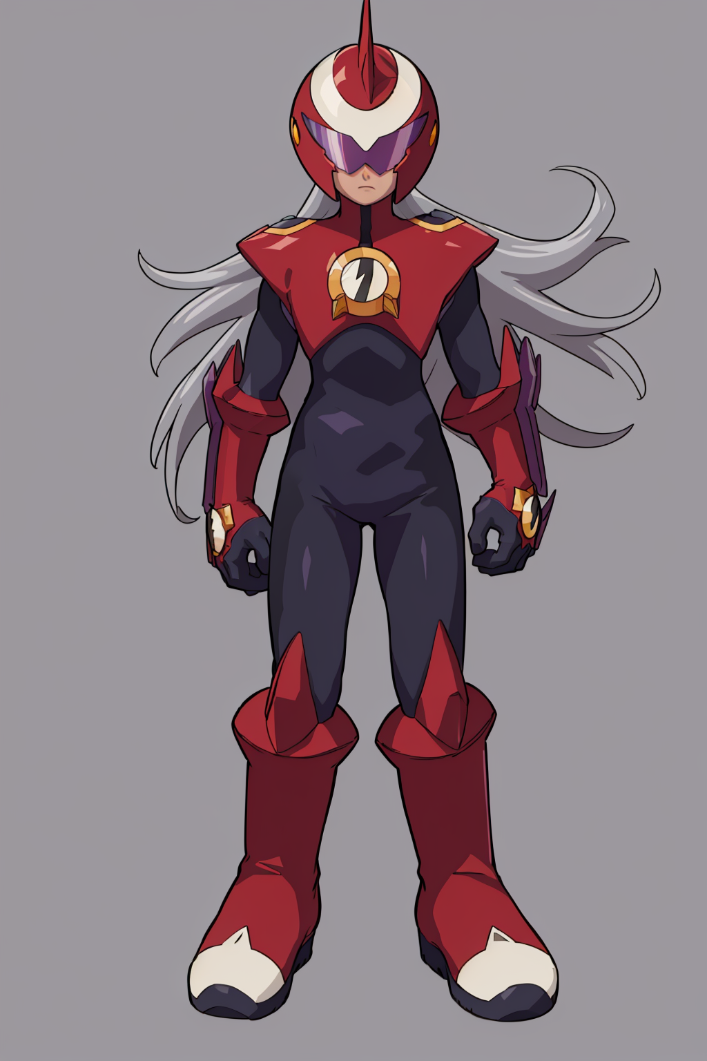 Other prompts : 1boy, grey hair, long hair, bodysuit, boots, gloves, helmet, red footwear