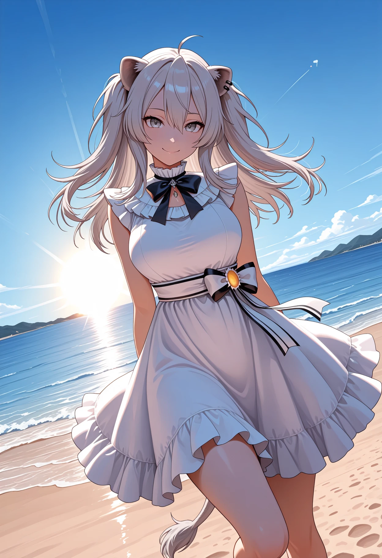 B0tanNtsu, grey eyes, grey hair, long hair, ahoge, two side up, animal ears, tail, ear piercing, frilled collar, black bowtie, sleeveless dress, white sundress, white sash
