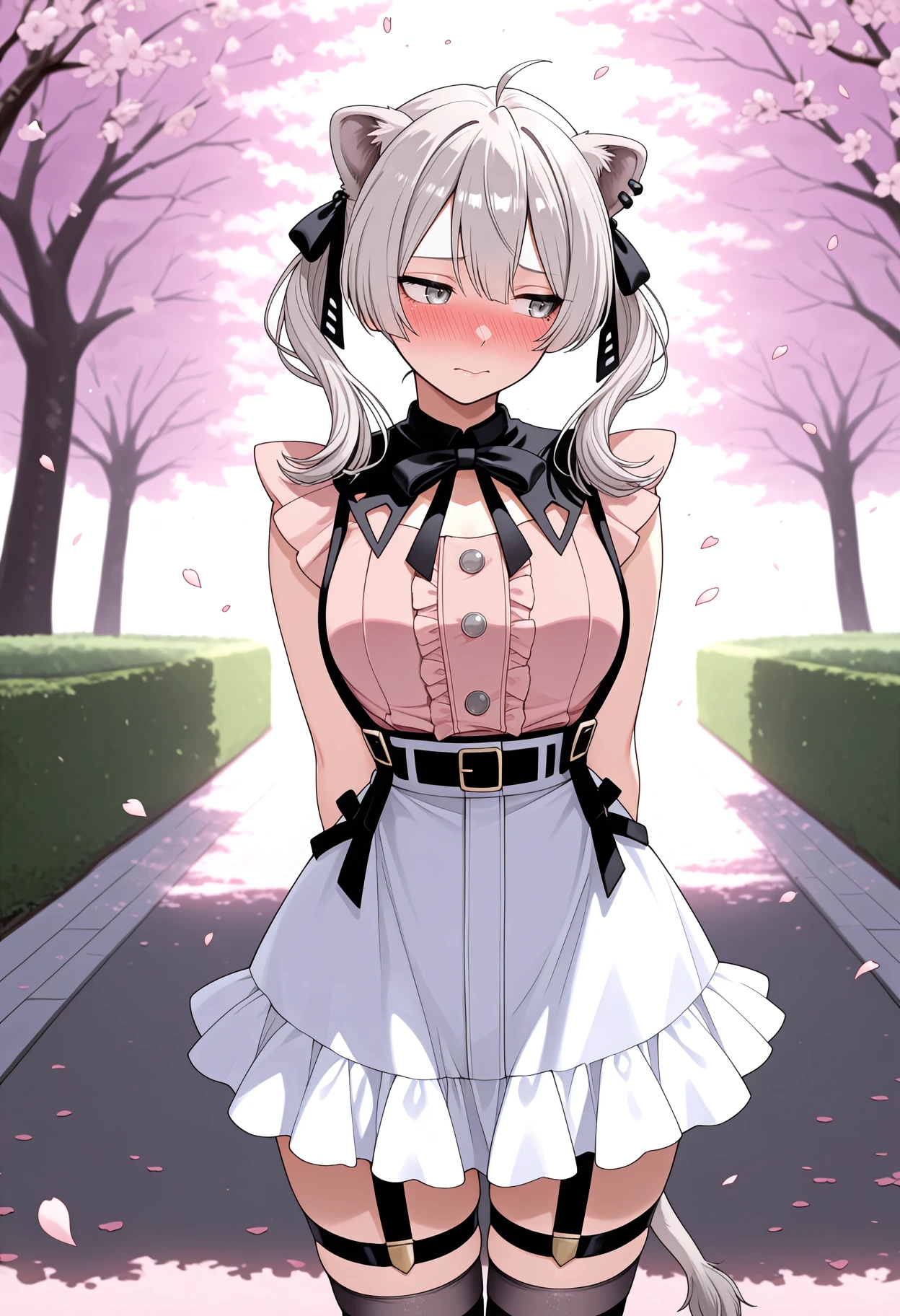 B0tanJraKei, grey eyes, grey hair, medium hair, ahoge, twintails, black ribbon, hair ribbon, animal ears, tail, ear piercing, detached collar, black collar, pink shirt, frilled shirt, sleeveless, white skirt, suspender skirt, legwear garters, thigh straps, black thighhighs