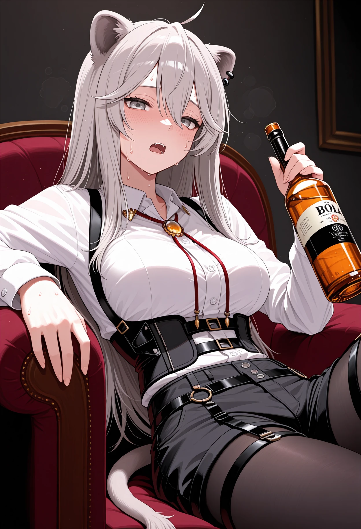 B0tanAgnt, grey eyes, grey hair, long hair, ahoge, straight hair, animal ears, tail, ear piercing, bolo tie, red tie, dress shirt, white shirt, long sleeves, underbust, black shorts, legwear garter, black pantyhose