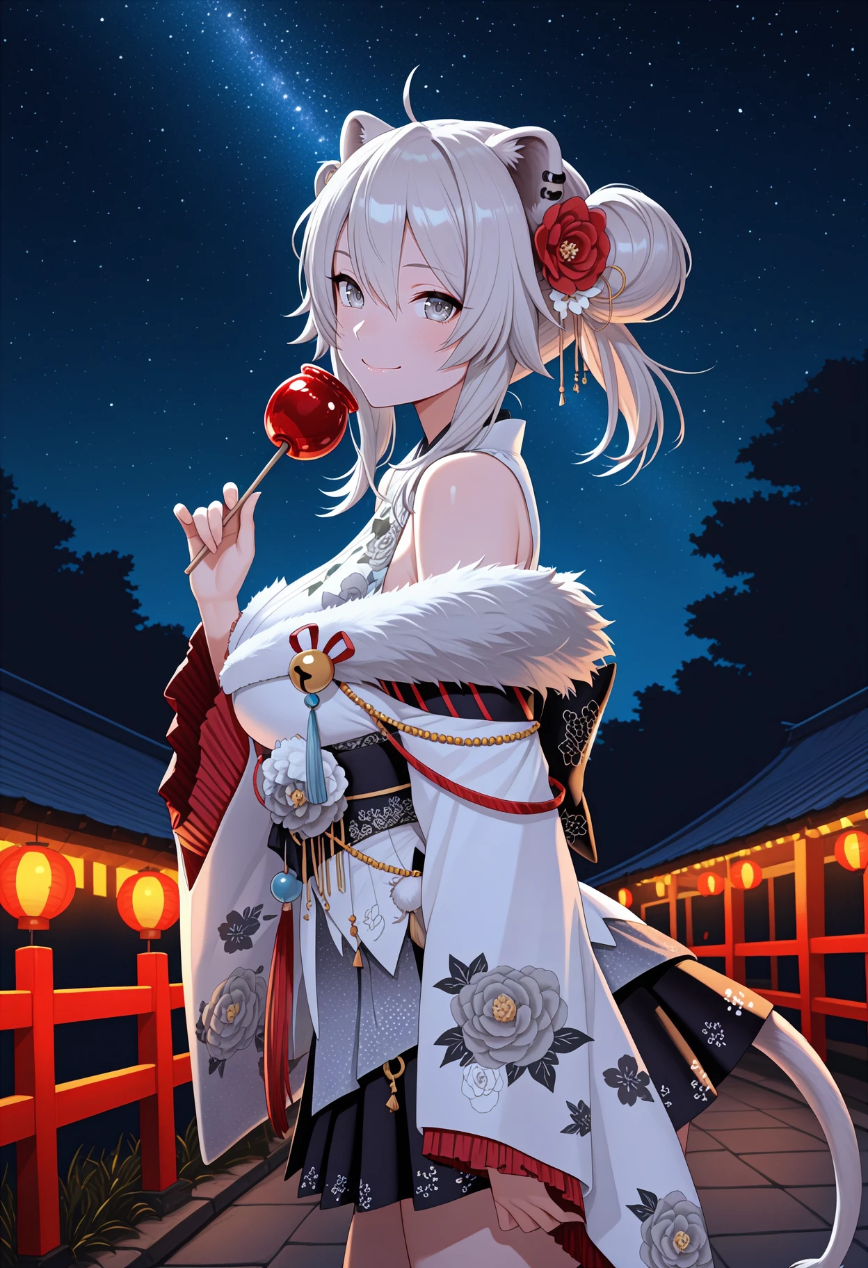 B0tanNwYrs, grey eyes, grey hair, medium hair, ahoge, double bun, animal ears, tail, ear piercing, hair flower, white kimono, short kimono, fur-trimmed kimono, floral print kimono, bare shoulders, wide sleeves, layered sleeves, black hakama skirt, short skirt