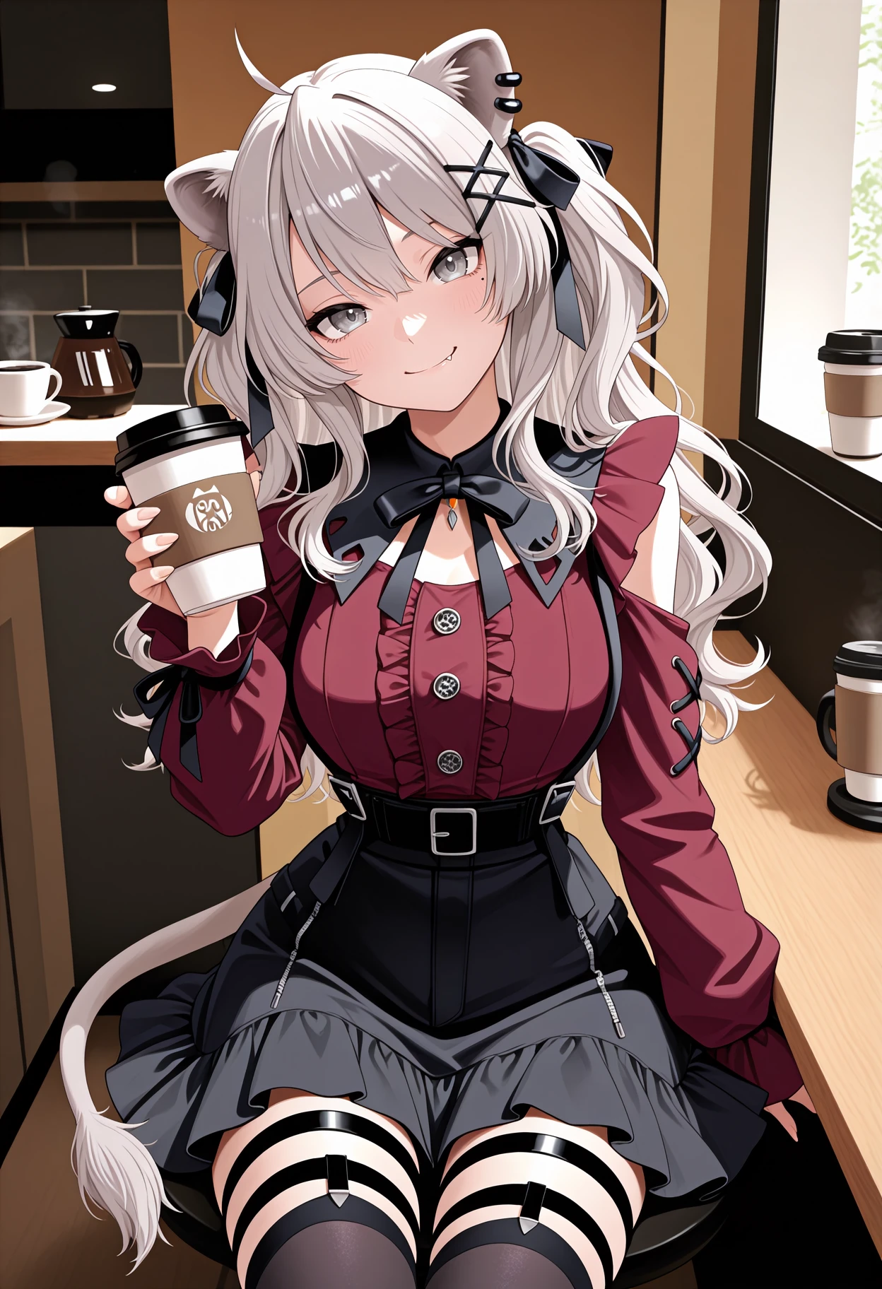 B0tanJraKei, grey eyes, grey hair, long hair, ahoge, two side up, wavy hair, hairclip, black ribbon, hair ribbon, animal ears, tail, ear piercing, detached collar, black collar, red shirt, frilled shirt, long sleeves, shoulder cutout, black skirt, suspender skirt, legwear garters, thigh straps, black thighhighs