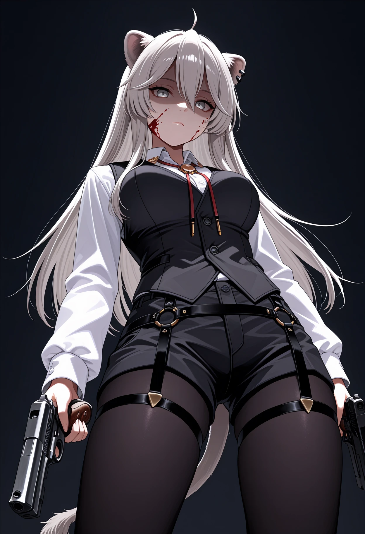 B0tanAgnt, grey eyes, grey hair, long hair, ahoge, straight hair, animal ears, tail, ear piercing, bolo tie, red tie, dress shirt, white shirt, long sleeves, black vest, black shorts, legwear garter, black pantyhose