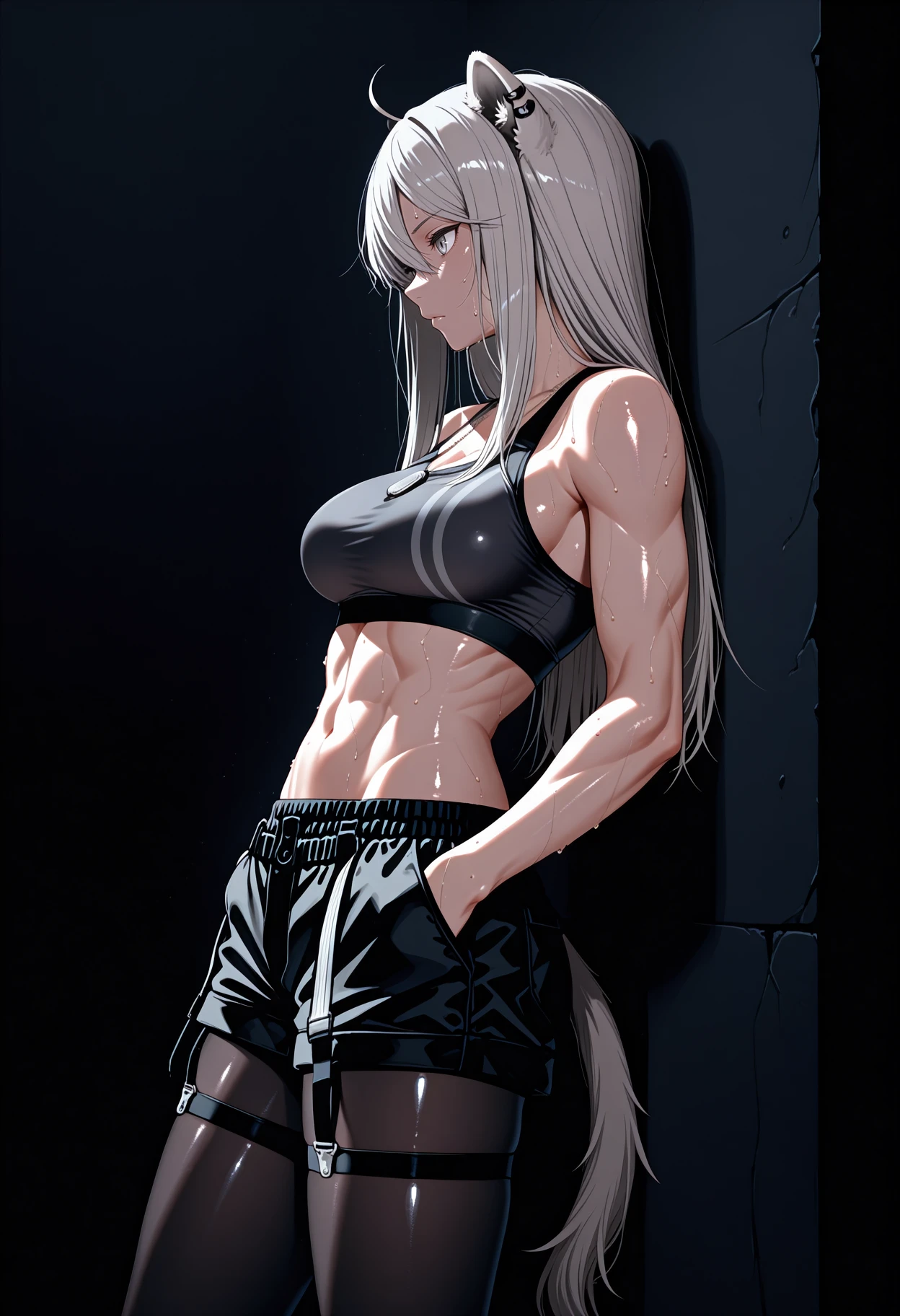 B0tanAgnt, grey eyes, grey hair, long hair, ahoge, straight hair, animal ears, tail, ear piercing, dog tags, black sports bra, black shorts, legwear garter, black pantyhose
