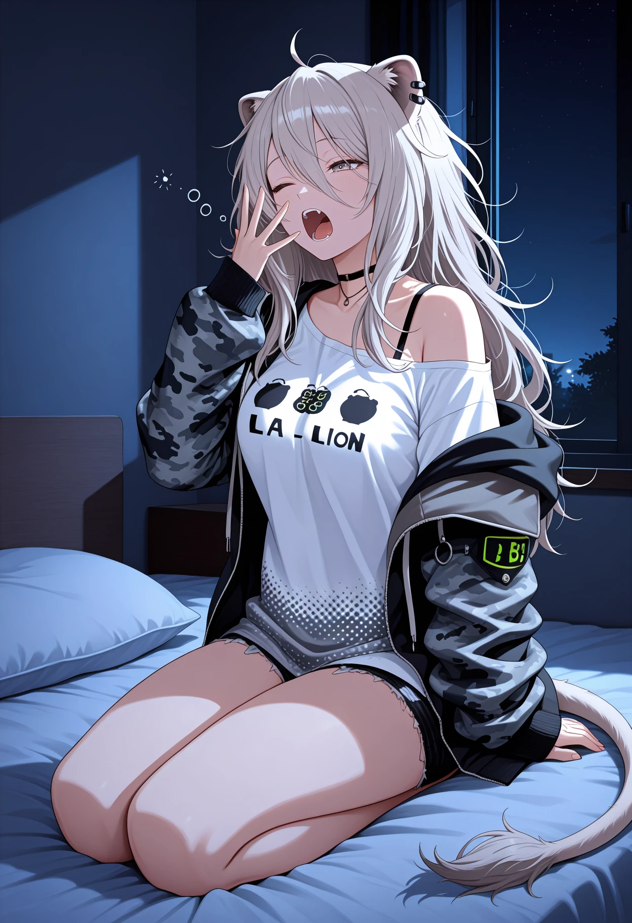B0tanCsl, grey eyes, grey hair, long hair, ahoge, messy hair, animal ears, tail, ear piercing, black choker, white shirt, print shirt, single bare shoulder, bra strap, black shorts, denim shorts, black jacket, hooded jacket, raglan sleeves, camouflage jacket